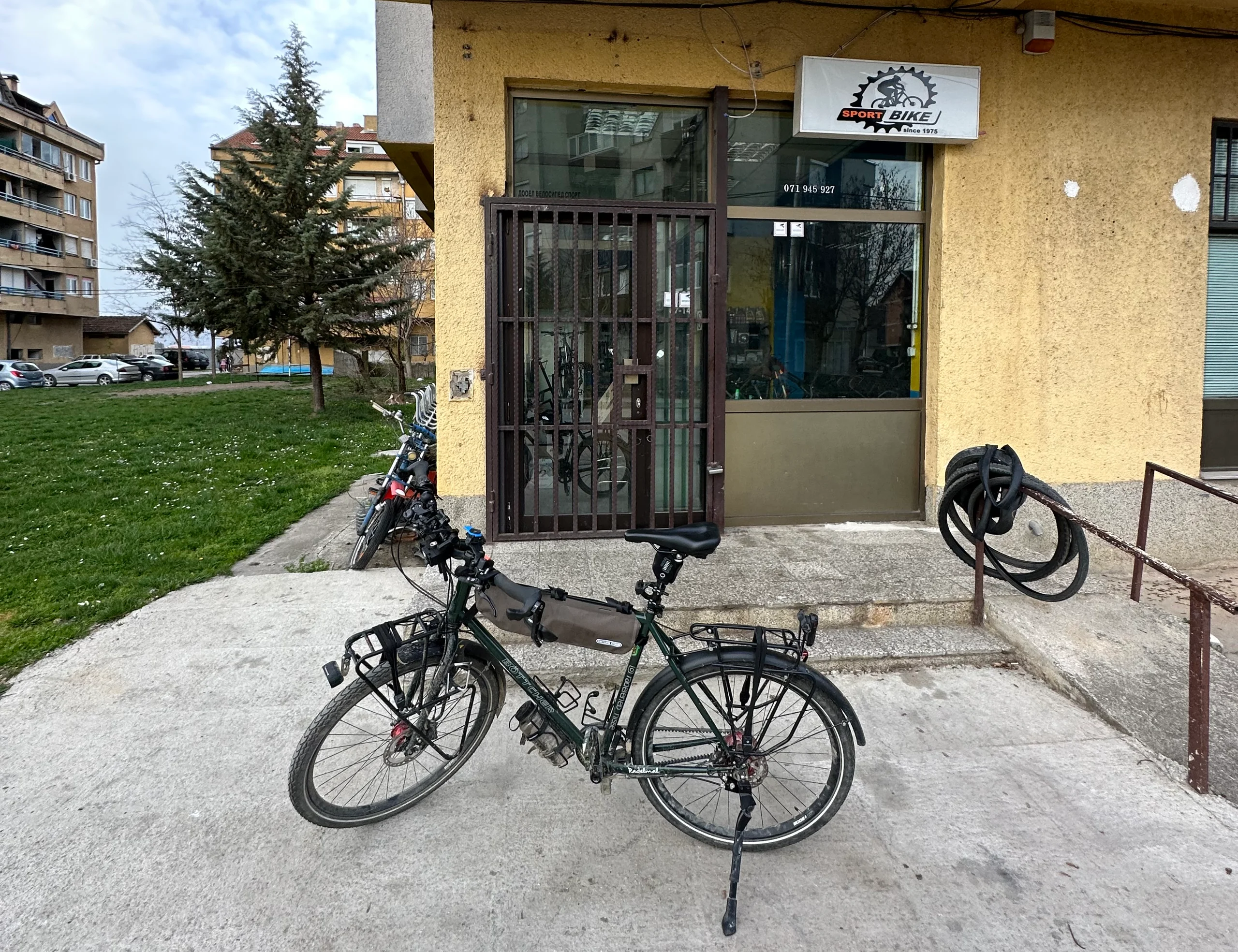 Die Taxifahrt war abenteuerlich: Mein Fahrrad ragte zur Hälfte aus dem Kofferraum, Sicherheitsgurte gab es nicht, und eine Klimaanlage bei den sommerlichen Temperaturen suchte man vergeblich. In Struga angekommen, zeigte mir der Fahrer die wichtigsten Anlaufstellen, bevor er mich am Hotel absetzte. Dort brachte ich mein Gepäck in Sicherheit und begann, meine Lage zu analysieren. Ich aktivierte meine eSIM, um mit meiner Familie und meinem Fahrradladen des Vertrauens – „Radelmal“ in Darmstadt – Kontakt aufzunehmen.