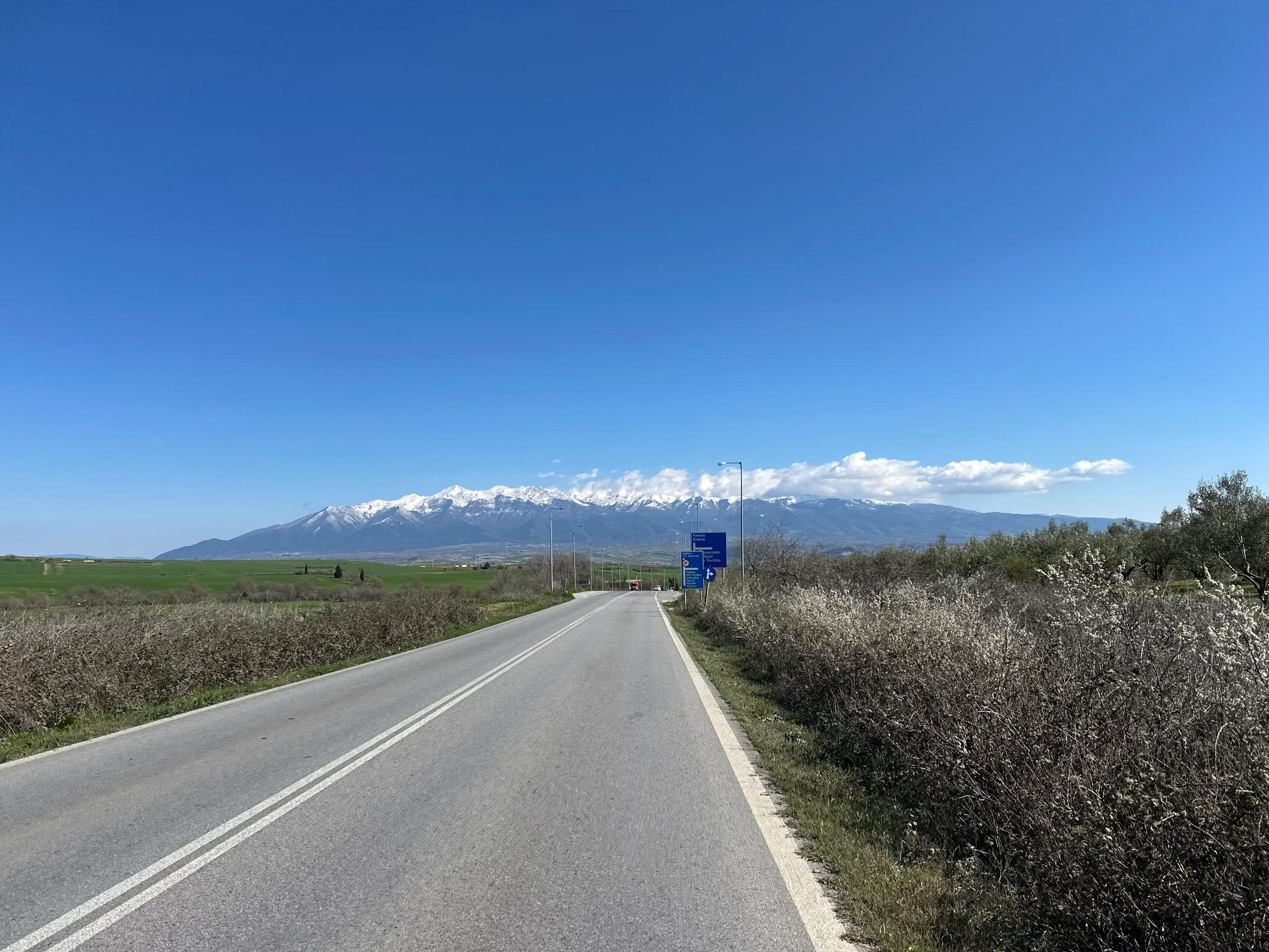 Vorbei an weiten Feldern näherte ich mich den Lekani-Bergen. Die 1.298 Meter hohen Gipfel waren noch schneebedeckt und wirkten in der Landschaft majestätisch. Ich hatte nicht erwartet, noch bis Kavala vorzudringen, da ich auf dem letzten großen Pass nach einem geeigneten Lagerplatz suchte. Doch die zunehmende Besiedlung ließ keine geeignete Stelle finden, sodass ich weiter talwärts fuhr.