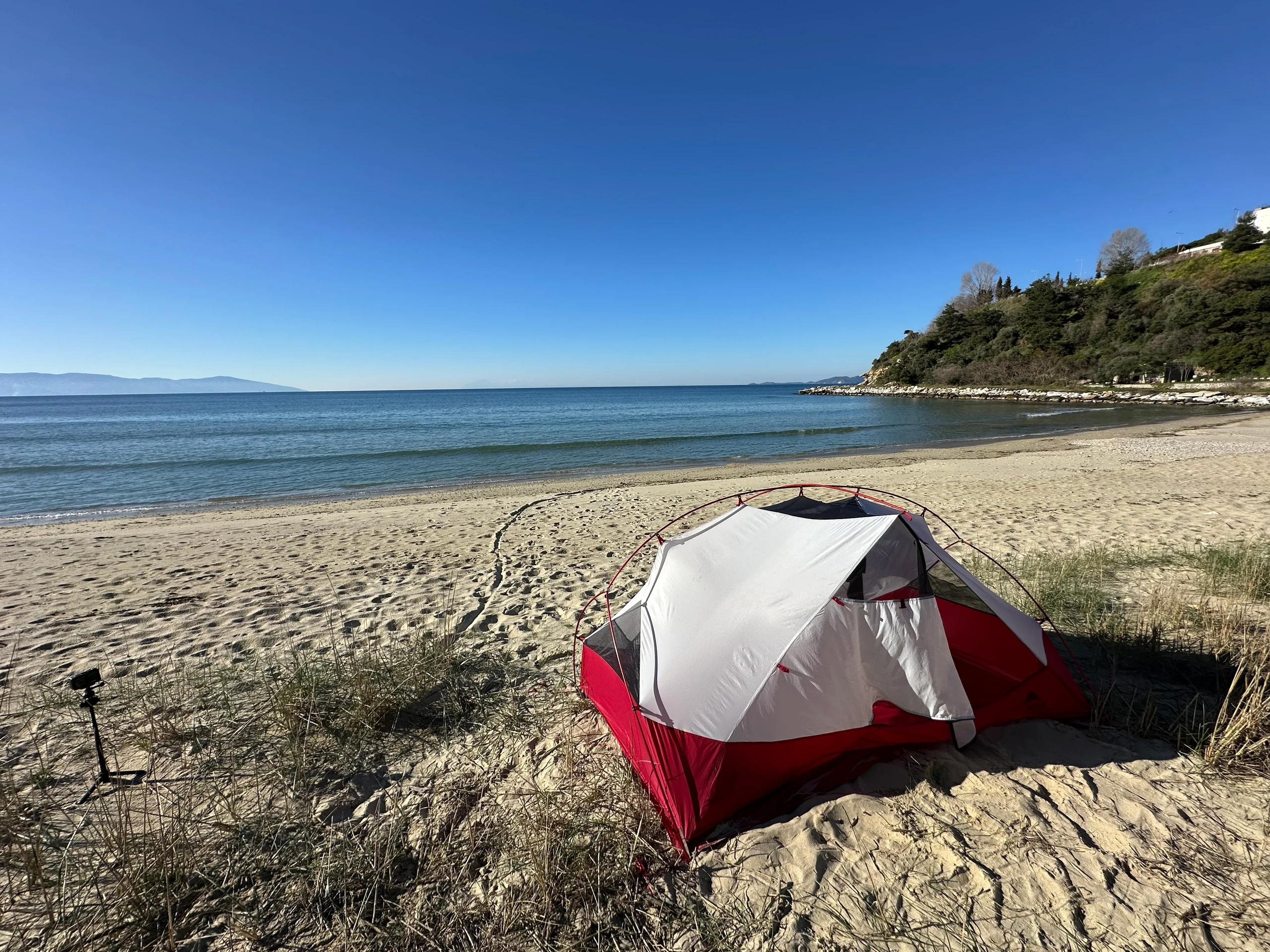 Am Morgen weckte mich gefrorenes Kondenswasser an der Zeltdecke: Die Temperatur war in der Nacht auf – 2 °C gesunken. Selbst auf meinen Fahrradtaschen hatte sich eine dünne Eisschicht gebildet, gespeist von der Feuchtigkeit des nur 15 Meter entfernten Mittelmeers. Doch kaum eroberte die Sonne den Horizont, stiegen die Temperaturen wieder auf ein angenehmes Niveau. Bei strahlendem Licht genoss ich am Strand mein Frühstück aus Keksen und etwas Obst und sammelte ein paar schöne Muscheln als Erinnerung.