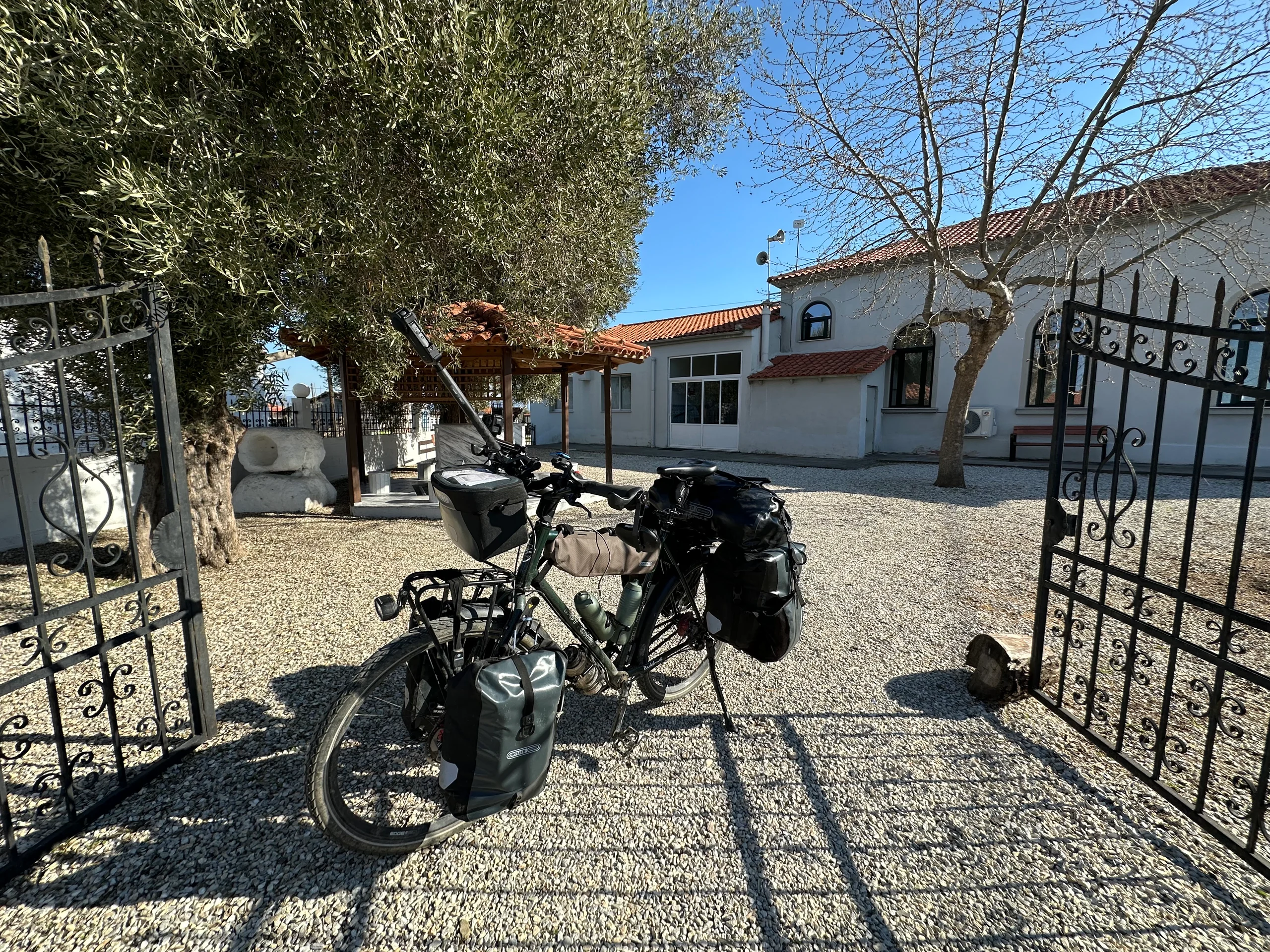 So führte mich die Route durch die weite Ebene Griechenlands in östlicher Richtung. Bereits auf den ersten Kilometern erlitt ich ein starkes Nasenbluten – wohl eine Kombination aus gereizter Nasenschleimhaut nach der kalten Nacht und einem leichten Sonnenbrand. Glücklicherweise ließ das Blut bald nach, und ich konnte die Fahrt fortsetzen. Die Wege waren abenteuerlich und rüttelten mein Fahrrad heftig durch. An kleinen Dörfern vorbei fielen mir zunehmend muslimische Gebetshäuser auf.