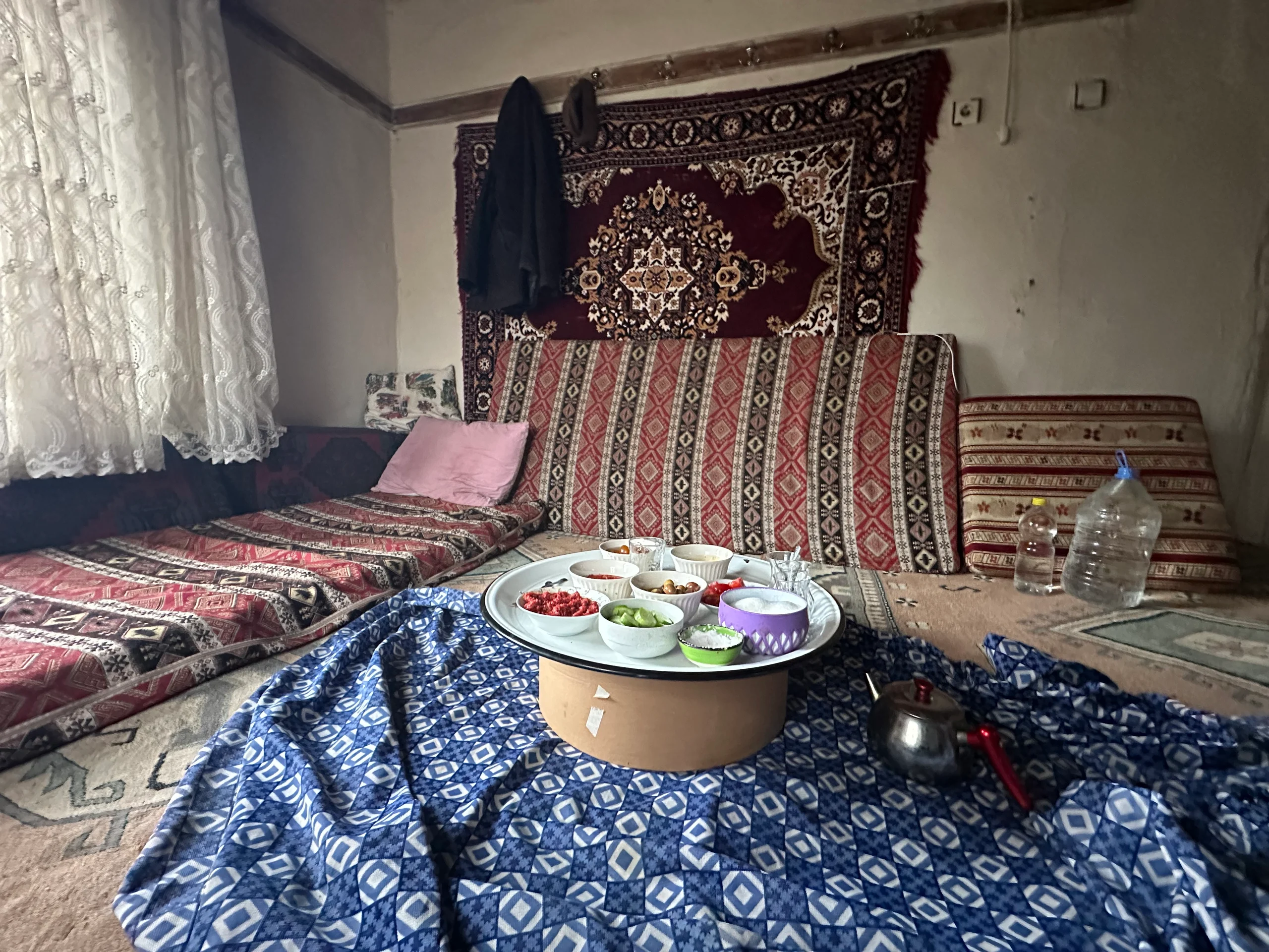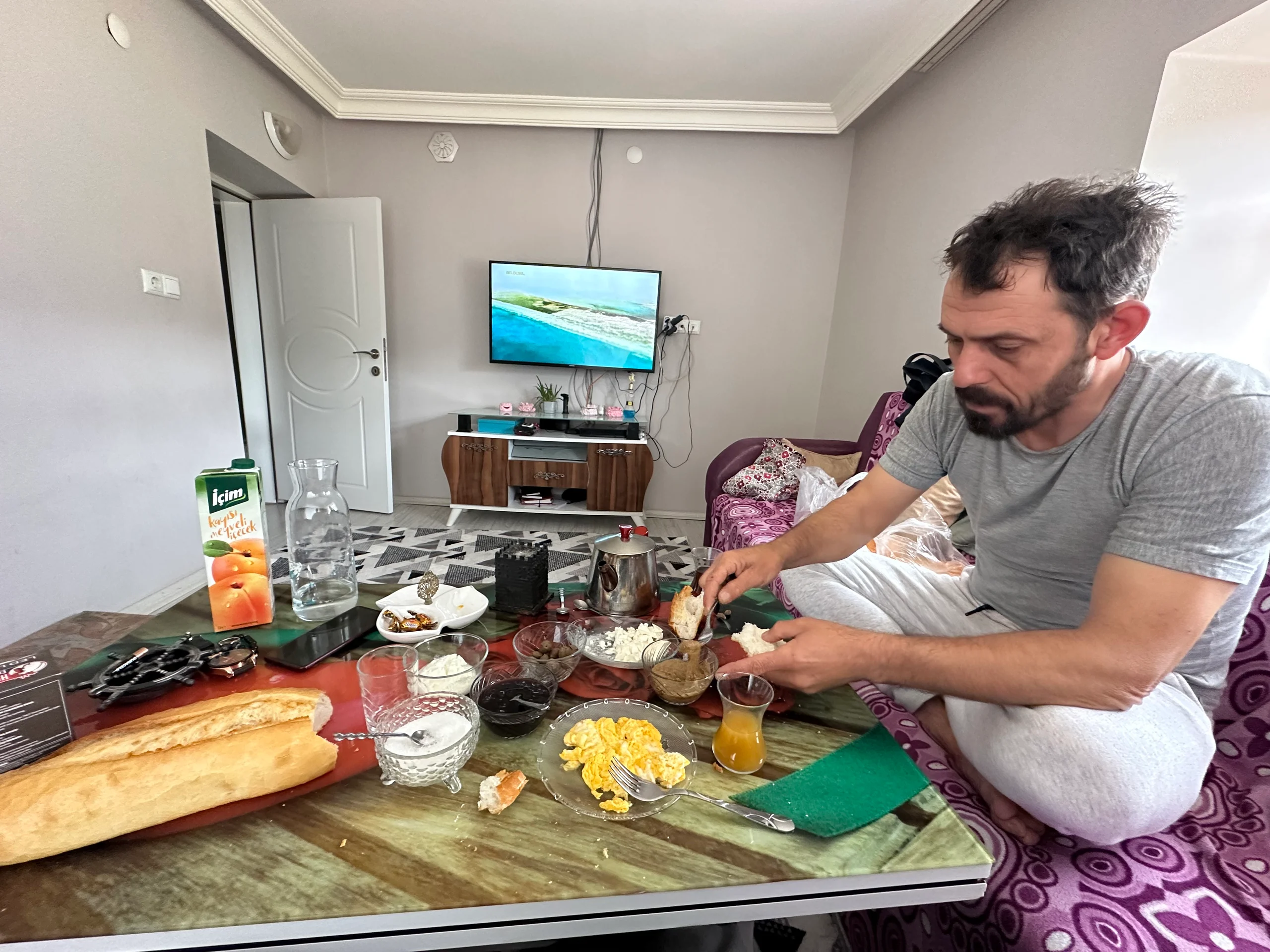 Ein weiterer Bekannter von gestern, Arif, stand vor der Tür und lud mich herzlich zu sich nach Hause ein. So ließ ich das erste Frühstück stehen und wurde direkt zum nächsten gebracht. Auch bei Arif war der Tisch reich gedeckt, und ich konnte erneut nicht widerstehen. Zwei Frühstücke, zwei große Portionen Herzlichkeit – und mein Magen war bestens versorgt.