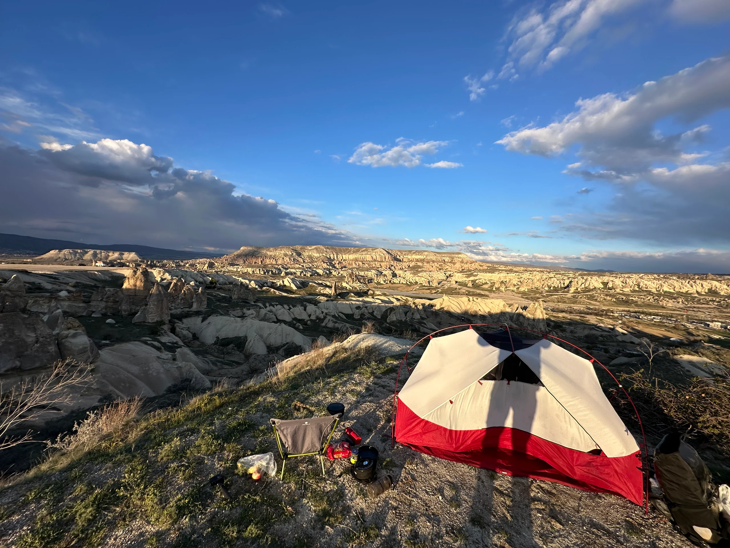 Ich suchte mir ein schönes Plätzchen für mein Zelt – mit perfekter Aussicht auf die zerklüfteten Berge Kapadokiens. Ich hoffe, dass morgen früh die Ballons starten – auch wenn Schnee angesagt ist. Es wäre ein krönender Auftakt für das nächste Kapitel dieser Reise.