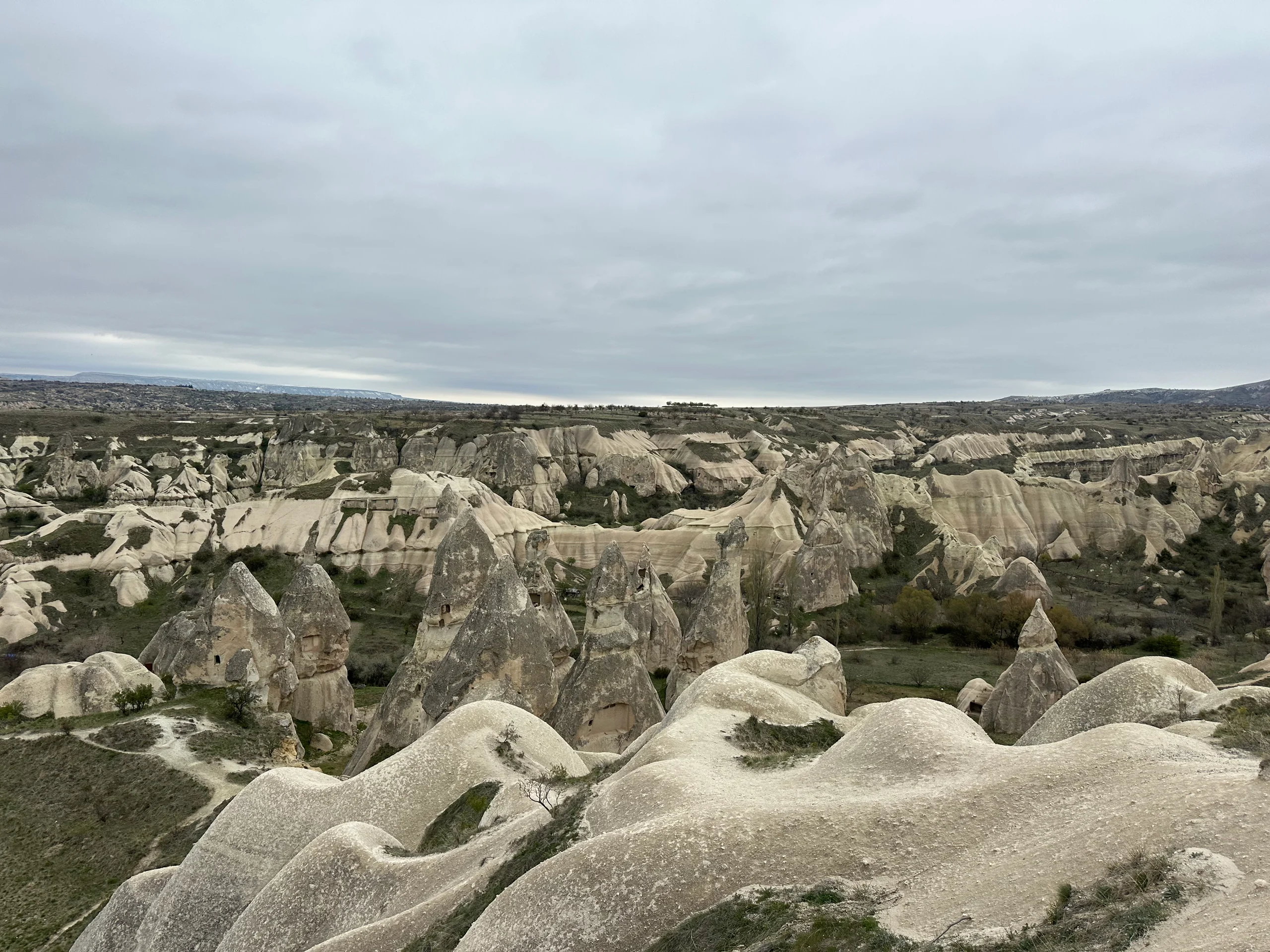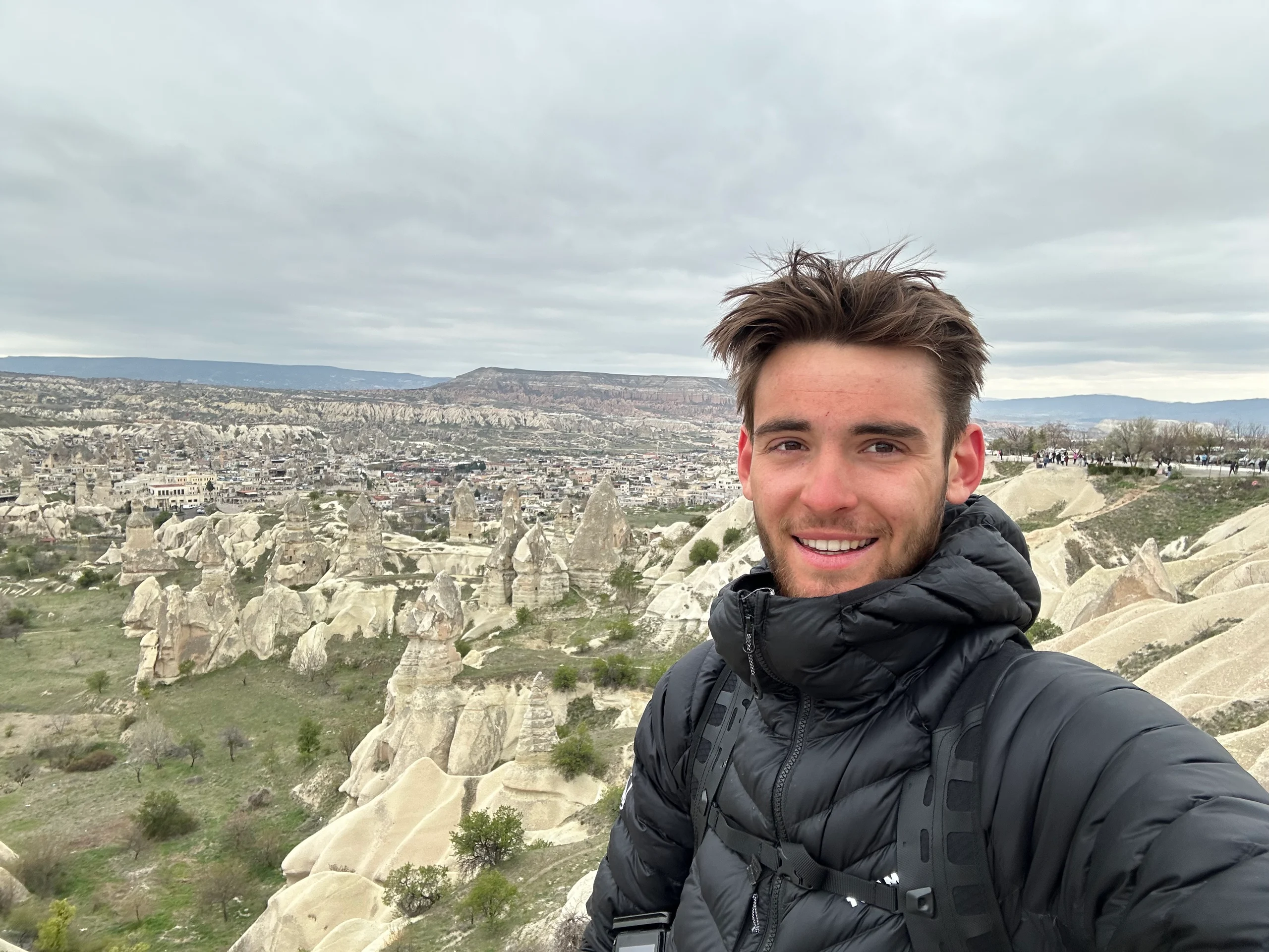 Am Vortag hatte ich mir den Wecker auf 4:00 Uhr morgens gestellt. Zu dieser Zeit beginnt die Sonne langsam aufzugehen, und die berühmten Heißluftballons bereiten sich darauf vor, in den Himmel zu steigen. Als ich jedoch den Reißverschluss meines Zelts öffnete, spürte ich sofort, dass etwas anders war. Der Reißverschluss klemmte – ungewöhnlich. Und dann sah ich es: Kapadokien war über Nacht unter einer Schneedecke verschwunden. Die Temperaturen waren unter null gefallen, und mehrere Zentimeter Schnee hatten sich über die märchenhafte Landschaft gelegt. Der Anblick war magisch – noch am Abend zuvor hatte ich die Felsen ohne Schnee gesehen, und nun lag alles in einem weißen, nebligen Schleier.