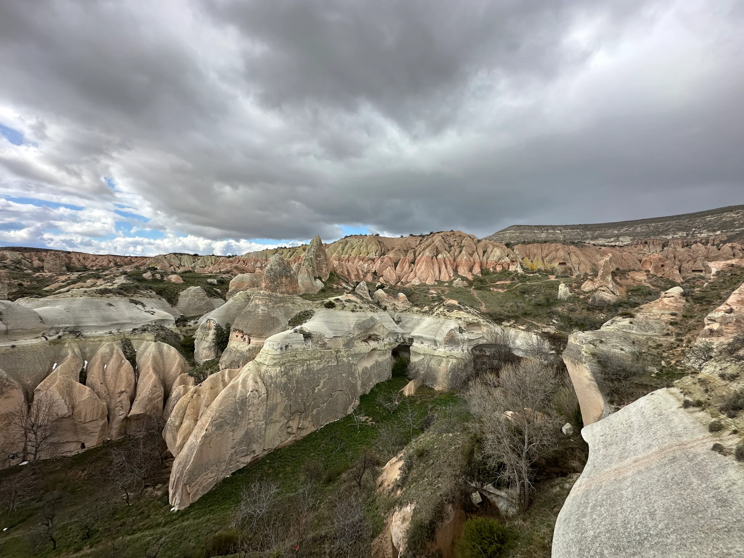 Nach dem Museumsbesuch wanderte ich weiter, durch enge Schluchten, vorbei an skurrilen Felsformationen und kleinen, herausfordernden Pfaden. Besonders beeindruckend war das Red Valley mit seinen rötlich gefärbten Steinen, die teilweise auch gelbe, grüne oder weiße Nuancen aufwiesen. Überall waren in die Felsen kleine Fenster, Türen, Kirchen und sogar burgähnliche Strukturen gemeißelt – es fühlte sich an wie eine Reise durch eine andere Welt. Insgesamt wanderte ich an diesem Tag rund 15 Kilometer durch Schnee, Hagel, Sonne und Wolken – von Schlucht zu Schlucht, ein Naturwunder nach dem anderen.