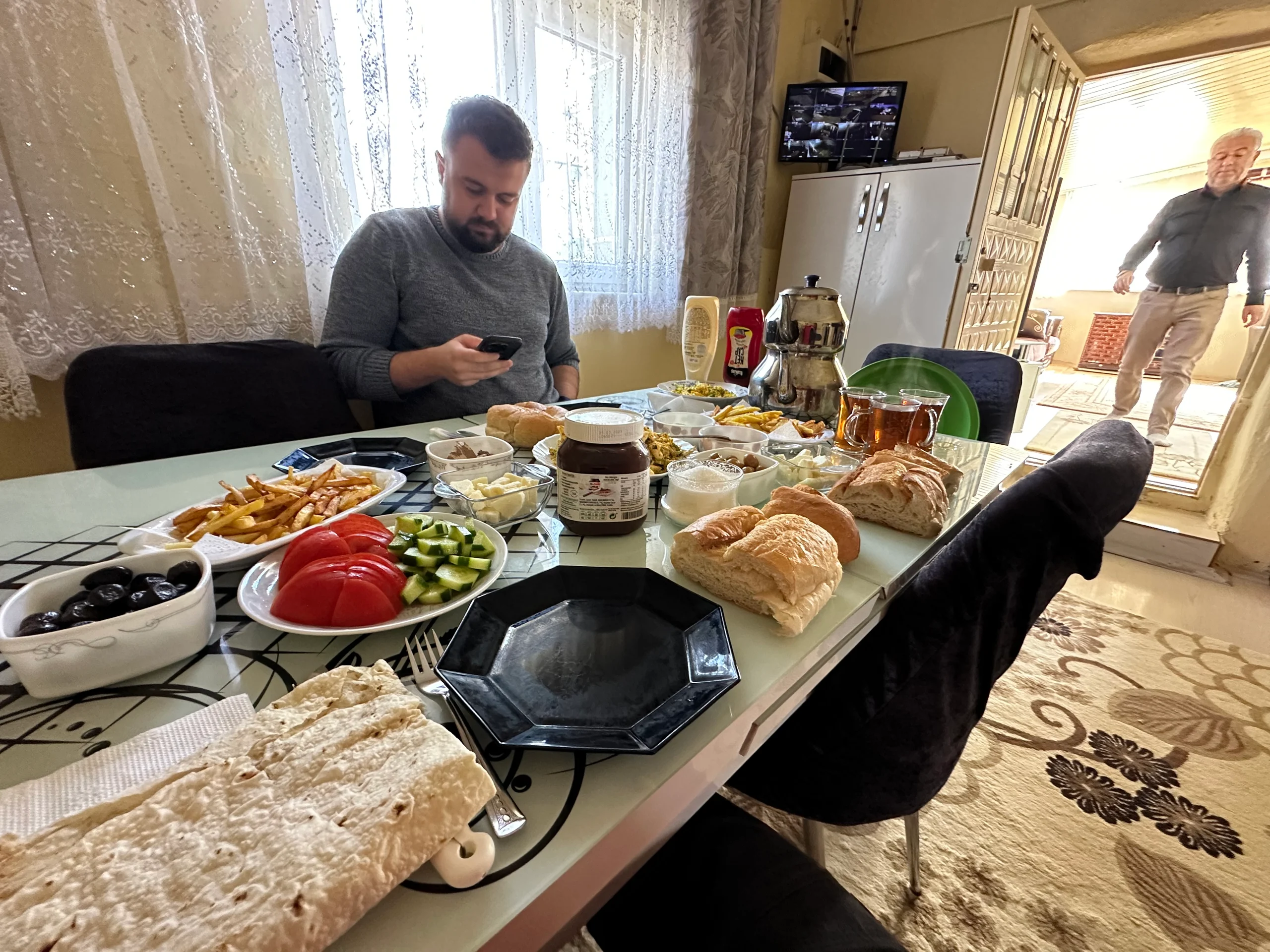 Dann wurde zum Frühstück gerufen. Und wie! Fladenbrot, Weißbrot, Honig, Schafskäse, Butter, Nutella, Eiersalat, Oliven, Tomaten, Gurken und natürlich: türkischer Tee. Diese Herzlichkeit, diese Fülle – es war ein echtes Abschiedsmahl. Ich genoss jeden Bissen, das Gespräch mit der Familie, die Wärme, die mir geschenkt wurde.