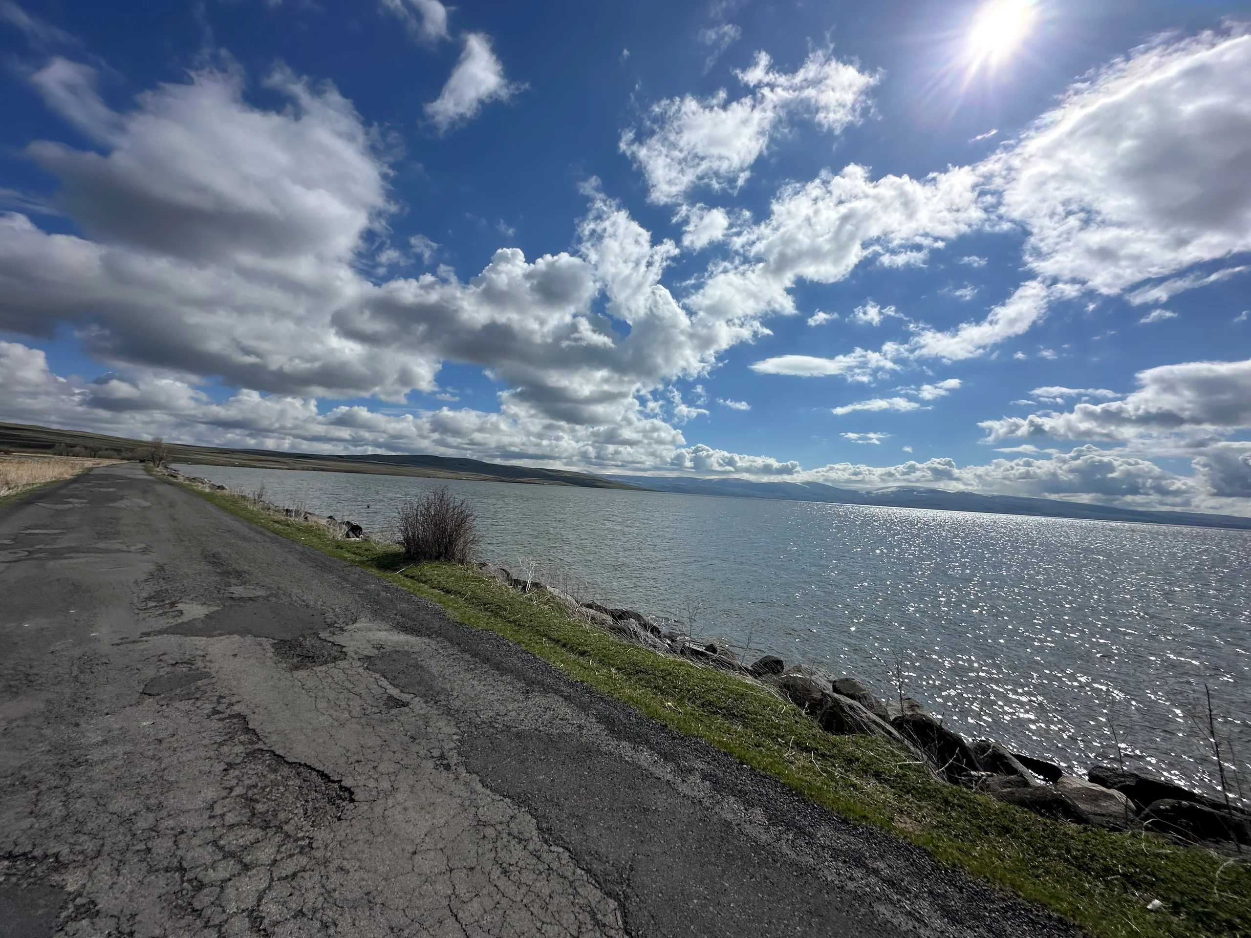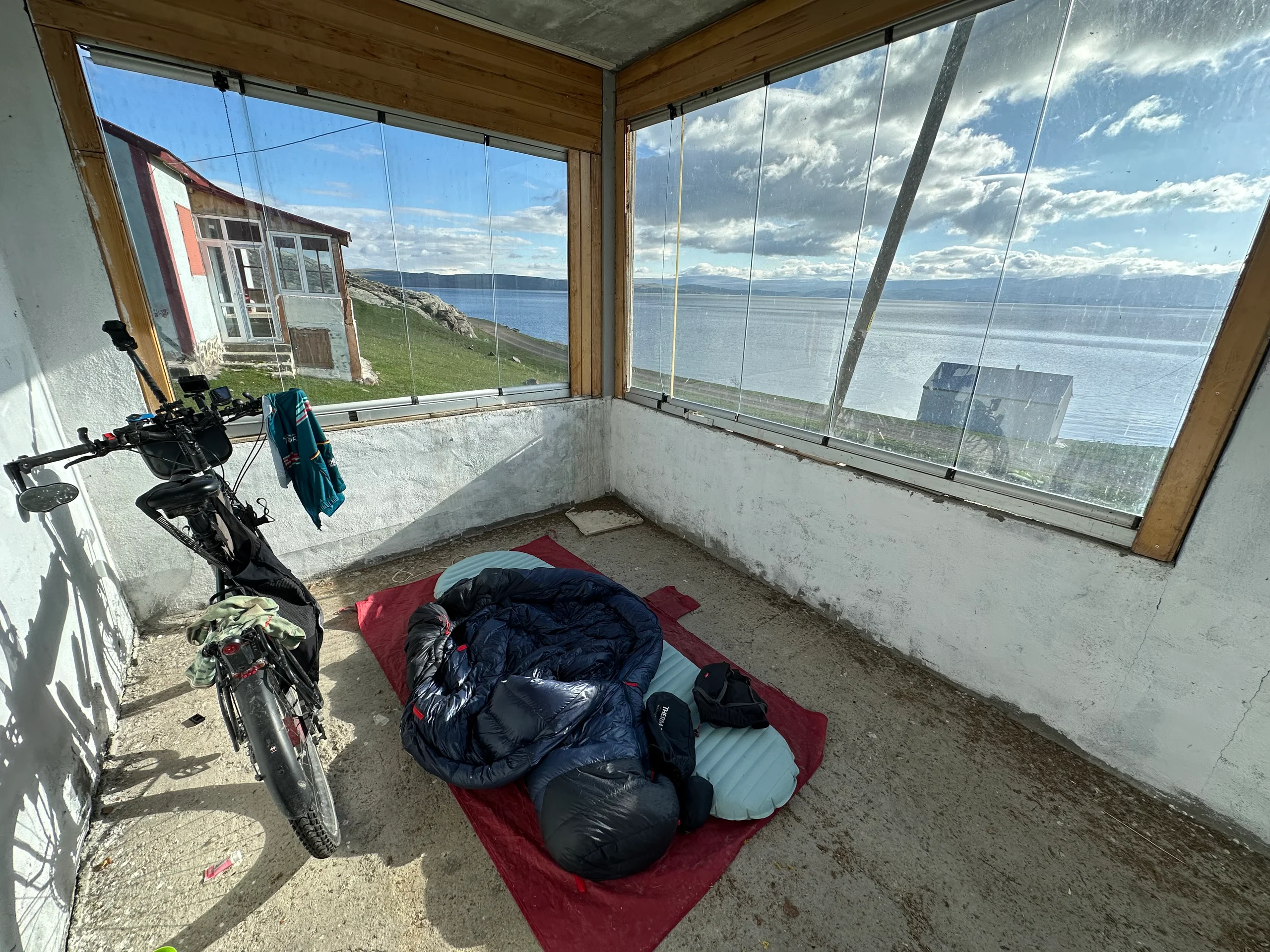 Am nächsten Morgen weckte mich die Sonne, die durch die Fenster des Wintergartens schien. Ich wachte sofort auf und begann meine gewohnte Morgenroutine: ein paar Kekse zum Frühstück und das Packen meiner Sachen. Dann hieß es: zurück auf die undankbare Schotterpiste. Weitere 7 Kilometer zog sich der holprige Weg entlang des Çıldır-Sees, bis ich endlich wieder auf eine richtige Straße kam. Ein Aufatmen – ich musste nicht mehr jeden Stein einzeln umkurven.