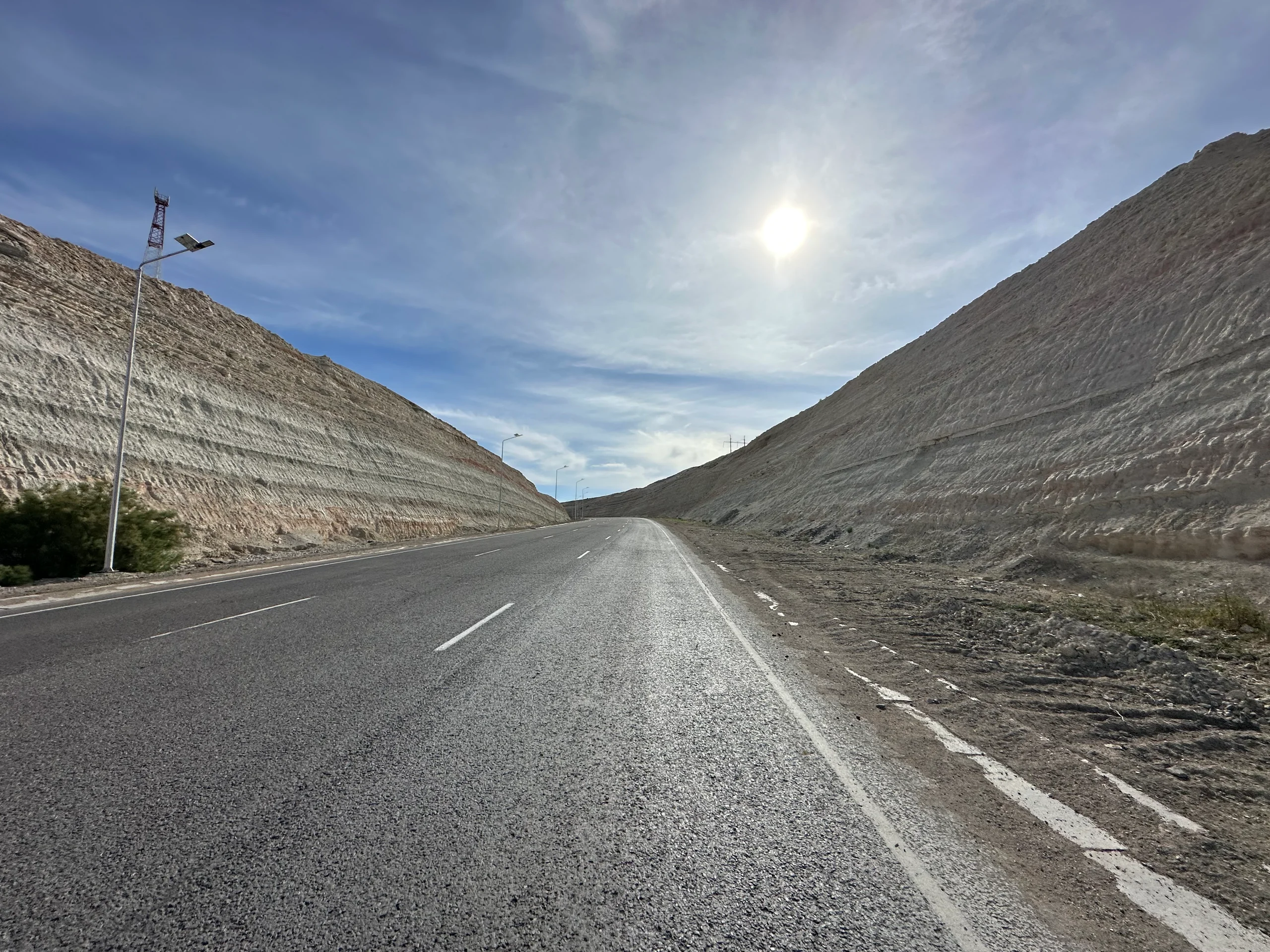Dank des Rückenwinds und des leichten Gefälles fuhr es sich angenehm – doch mit steigender Sonne stieg auch die Hitze. Gegen Mittag kletterte das Thermometer über 35 °C. Ich legte immer wieder Pausen ein, um meinen Körper nicht zu überfordern. Die trockene Luft, die Hitze, das schwere Fahrrad – und dazu die 8 Liter Wasser – all das kostete Kraft.