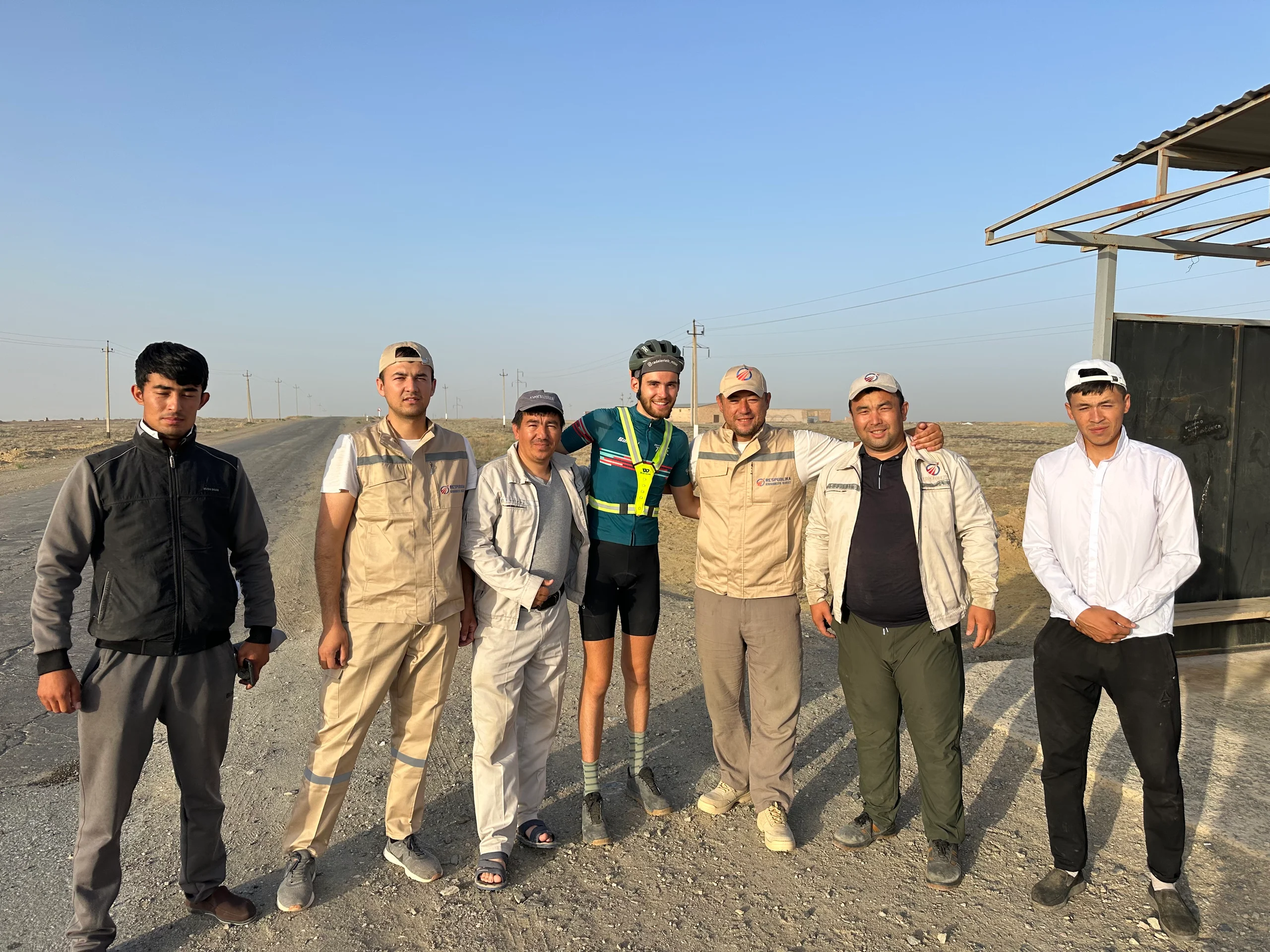 Nur zwei Kilometer weiter, kurz vor der großen Straße, sprang plötzlich eine Gruppe von sieben Männern aus einem Daewoo Damas – diesen kleinen Kastenwagen, die hier überall unterwegs sind. Sie machten jede Menge Fotos mit mir, boten mir ihre Gastfreundschaft für meinen Aufenthalt in Samarkand an und verschwanden dann wieder, um die Straße zu vermessen. Diese spontane Begegnung hat mich einmal mehr begeistert – es ist einfach schön, wie freundlich und offenherzig die Menschen hier sind.