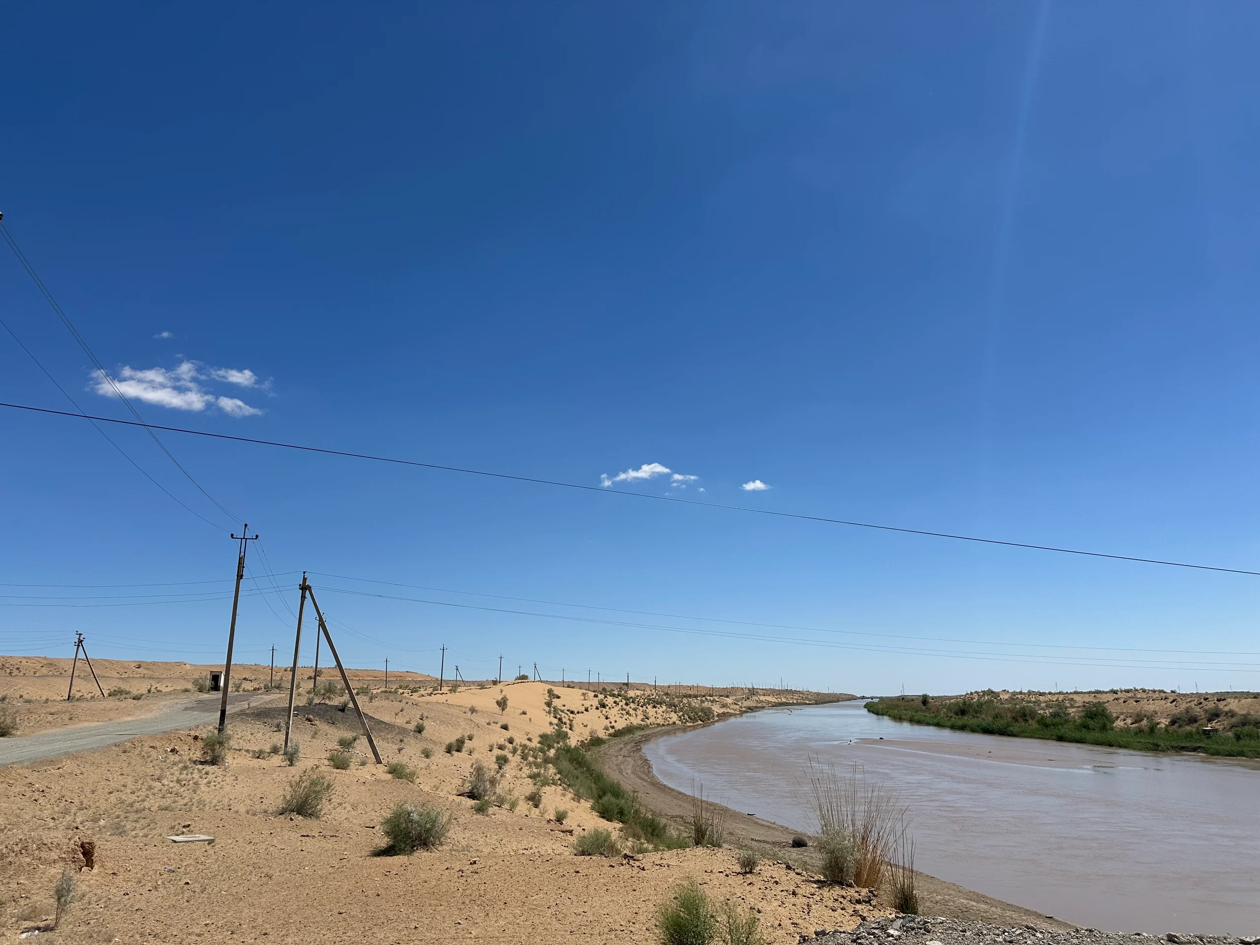 Umso erleichterter war ich, als ich endlich die Hauptstraße erreichte, die in Richtung Buchara führte. Trotz der großen Hitze und Temperaturen von über 37 Grad wehte ein angenehmer Wind. So schaffte ich an diesem Tag weitere 60 Kilometer. Kurz bevor die Sonne unterging, kehrte ich in ein kleines Restaurant ein, um mir etwas zu trinken zu holen. Dort wurde mir spontan eine Übernachtungsmöglichkeit angeboten – das passte perfekt, denn ich wollte sowieso in der Nähe des Amudarja-Flusses übernachten, der sich nur zwei Kilometer entfernt durch die Wüste schlängelte.