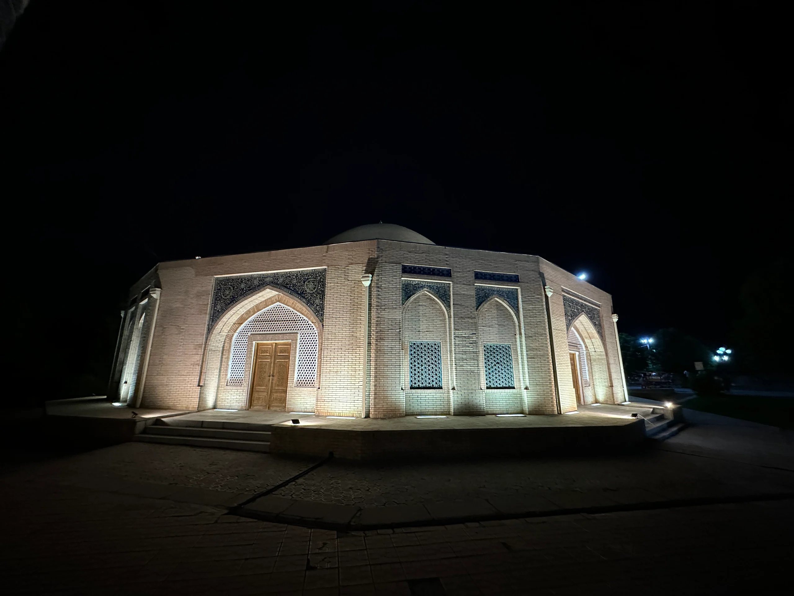Im Anschluss schnitt ich zwei einhalb Stunden lang die täglichen Kurzvideos der vergangenen Woche. Später am Abend machte ich mich erneut auf den Weg, um pünktlich um 21:00 Uhr die Lichtshow vor der Madrese am Registan-Platz zu sehen. Dort hatten sich bereits viele Menschen versammelt.