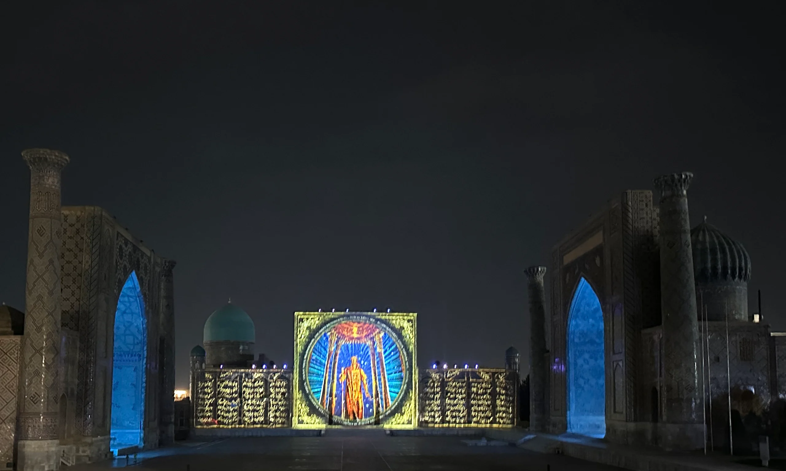 Die Show war schlichtweg atemberaubend: Riesige, scharfe Projektionen wurden auf die historischen Gebäude geworfen und erzählten animiert die Geschichte der Seidenstraße, die Entstehung Usbekistans sowie die Entwicklung der Welt. Die Darbietung war äußerst professionell und beeindruckend.