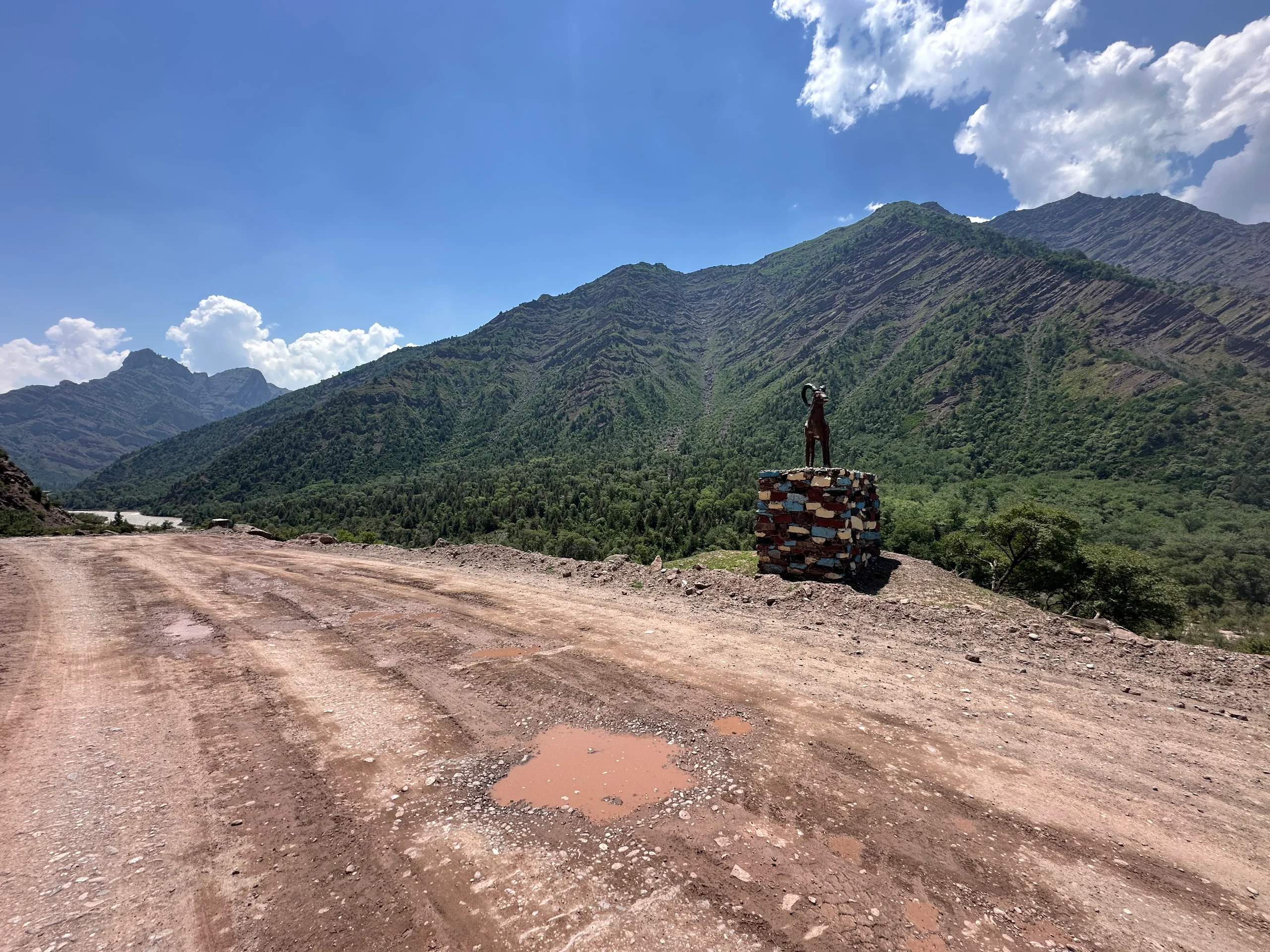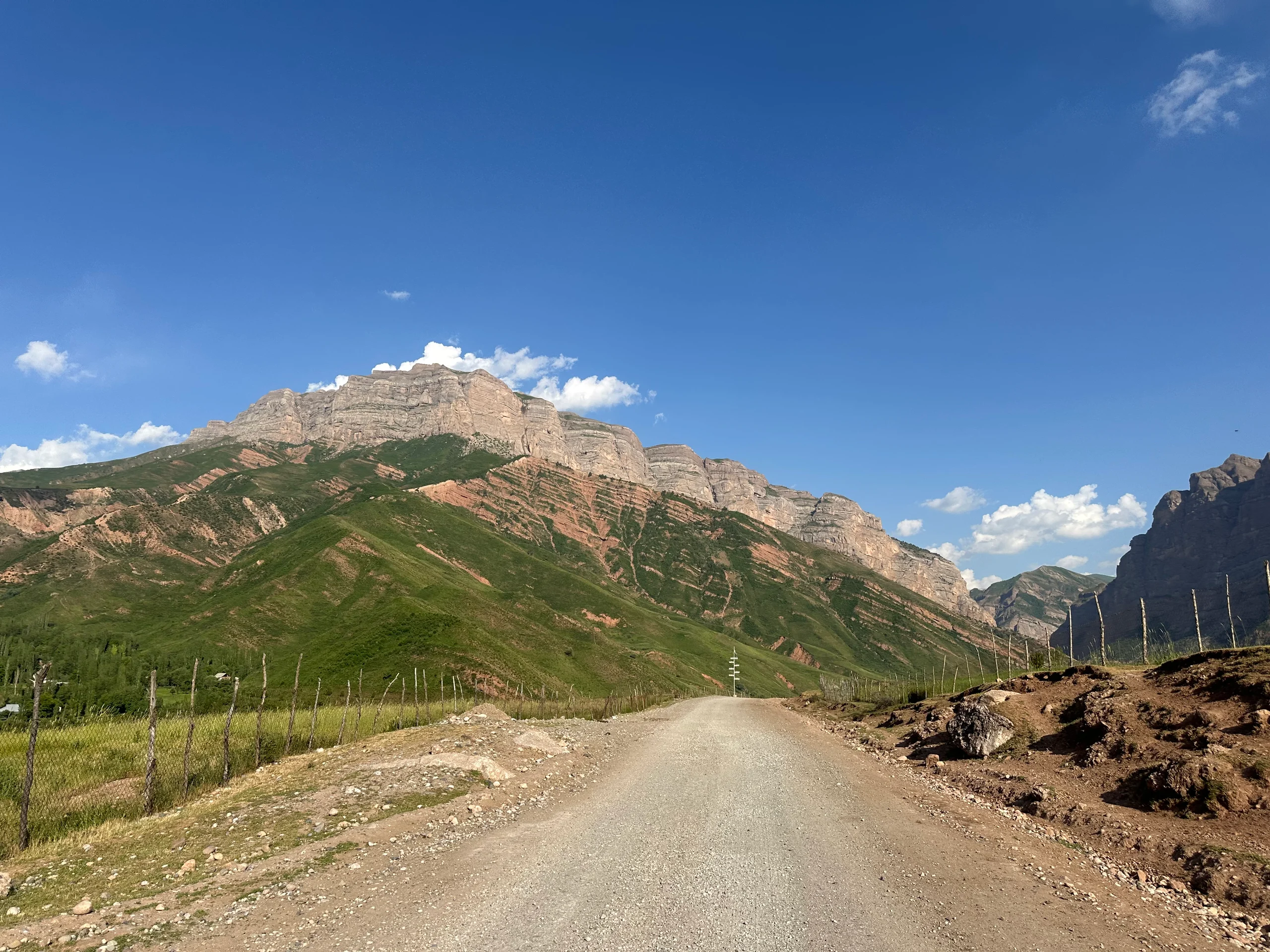 Der Weg war am Morgen angenehm eben, was mir gutes Vorankommen ermöglichte. Dennoch blieben die großen Steine und der lockere Schotter eine ständige Herausforderung – für mich und mein Rad. Nach einiger Zeit kam ich an einem kleinen Supermarkt vorbei und legte eine kurze Pause ein, bevor es weiter in die Berge ging.