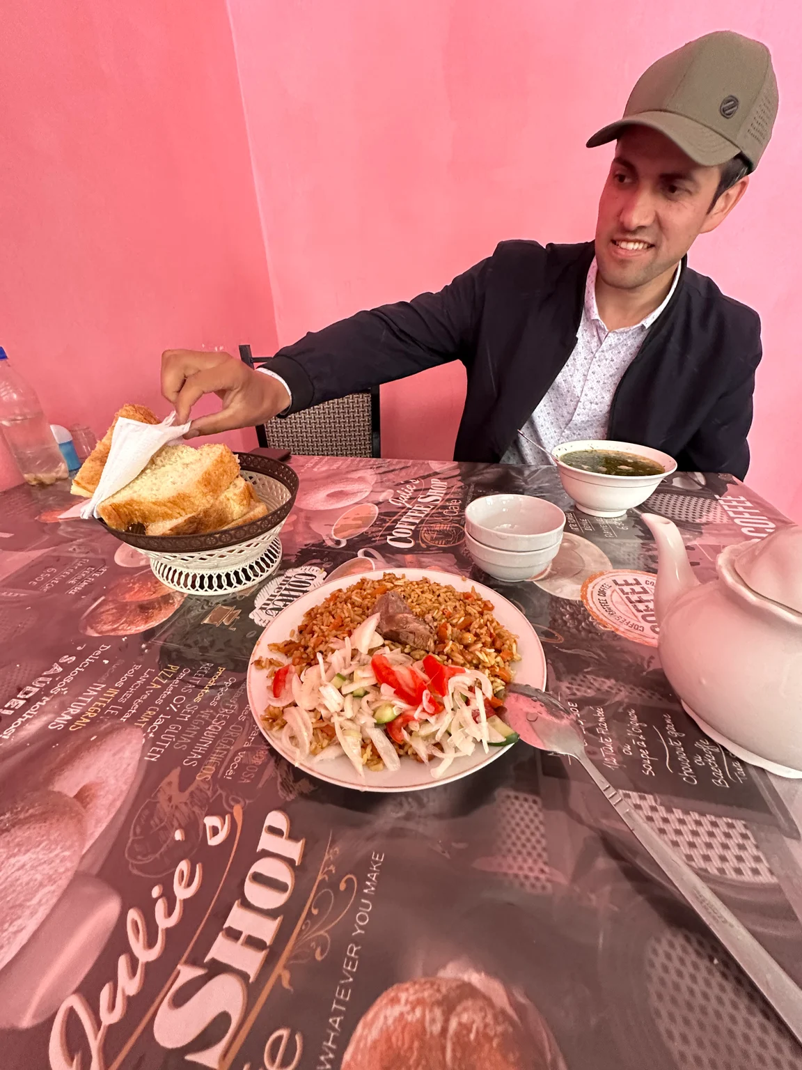 Der Lehrer, Muhammad, lud mich anschließend spontan zu einem Mittagessen ein. Wir überquerten eine Brücke und gelangten ins Dorf Tavildara, wo ich auf seine Empfehlung hin das traditionelle Gericht Osh probierte – ein würziger Teller aus Reis, Gemüse und etwas Fleisch, begleitet von Tee und Fladenbrot. Es schmeckte hervorragend. Während des Essens unterhielten wir uns lange über die tajikische Kultur, seine Arbeit und das Leben im Dorf.