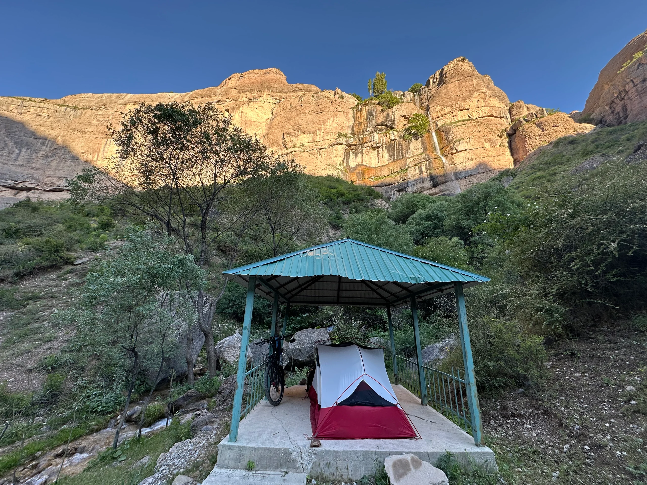 Heute wachte ich schon früh um 5:30 Uhr auf – kein Wunder, denn ich war am Vorabend recht zeitig ins Bett gegangen und fühlte mich nun ausgeruht. Ich aß ein schnelles Frühstück aus Brot mit Erdnussbutter, dehnte mich ein wenig und wartete auf die ersten Sonnenstrahlen, die langsam in das kühle Tal hinabstiegen. Auf 1300 Metern Höhe war es nachts recht frisch gewesen, und auch am Morgen brauchte ich noch meine Daunenjacke. Erst nach etwa 20 Minuten Fahrt wurde mir warm genug, um wieder in kurzer Kleidung weiterzufahren.