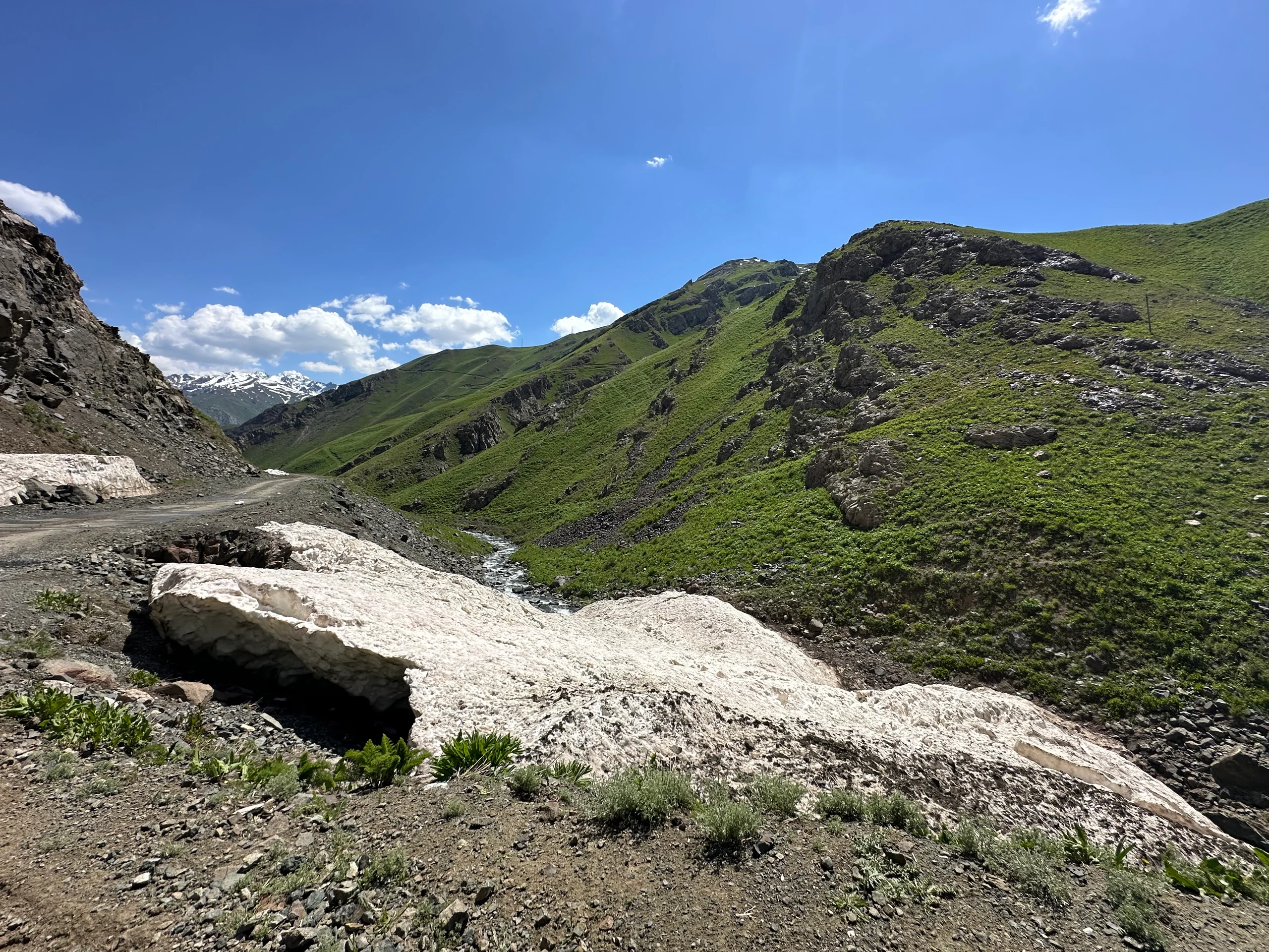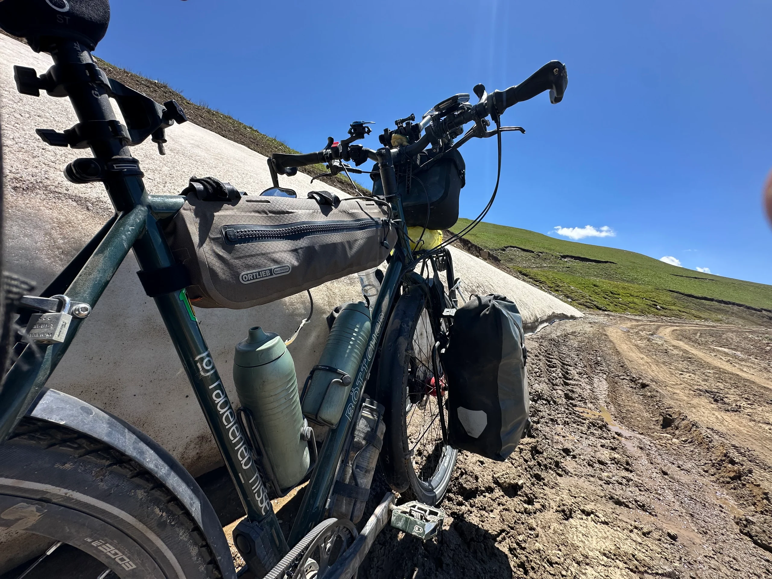 Die Sonne brannte in dieser Höhe schon stark, also kremte ich mich noch einmal gründlich ein. Dann standen noch rund acht Kilometer und etwa 600 Höhenmeter bis zur Passhöhe an. Der Weg wurde zunehmend schlechter: matschig und steil, gesäumt von immer mehr Gletschern und Schneefeldern, die unter der Sonne schmolzen und den Boden aufweichten.