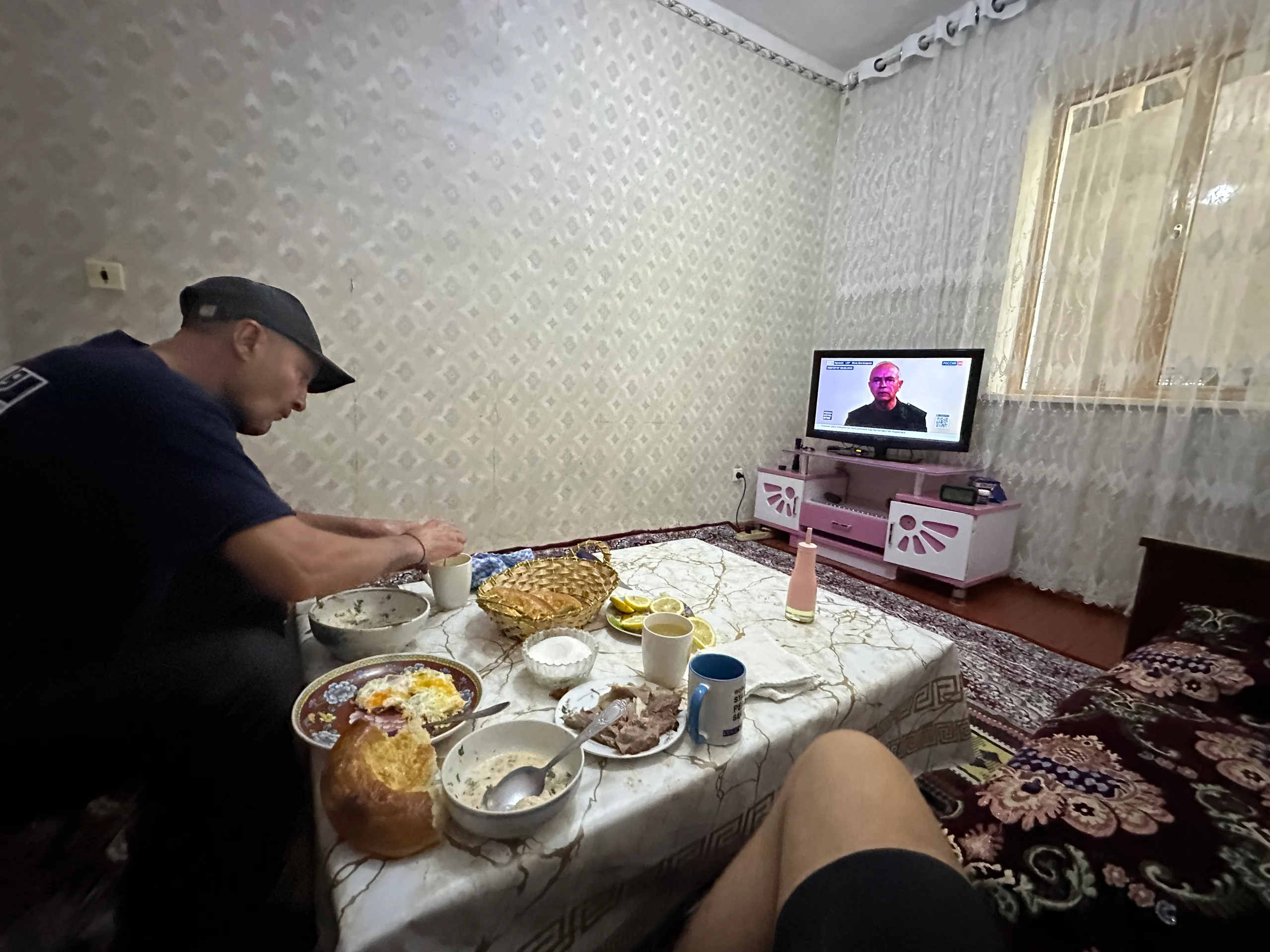 Mit einem mulmigen Gefühl ließ ich mein Rad zurück und folgte dem Chef zu ihm nach Hause, wo er mir prompt Mittagessen anbot – begleitet von laut laufendem russischem Propagandafernsehen. Während er entspannt aß, wuchs meine innere Unruhe. Ich hatte keine Ahnung, wann oder ob ich überhaupt an diesem Tag weiterfahren konnte.