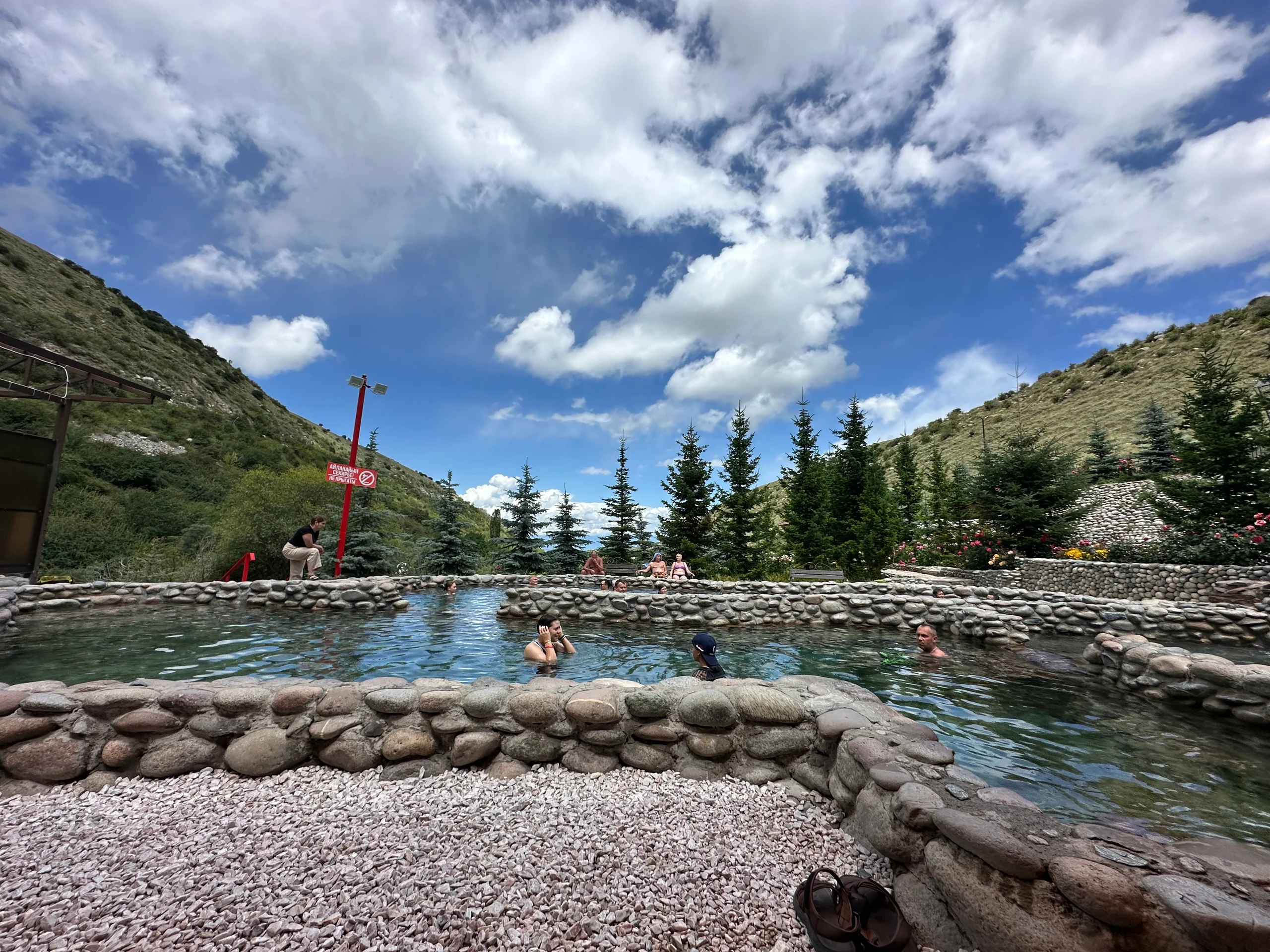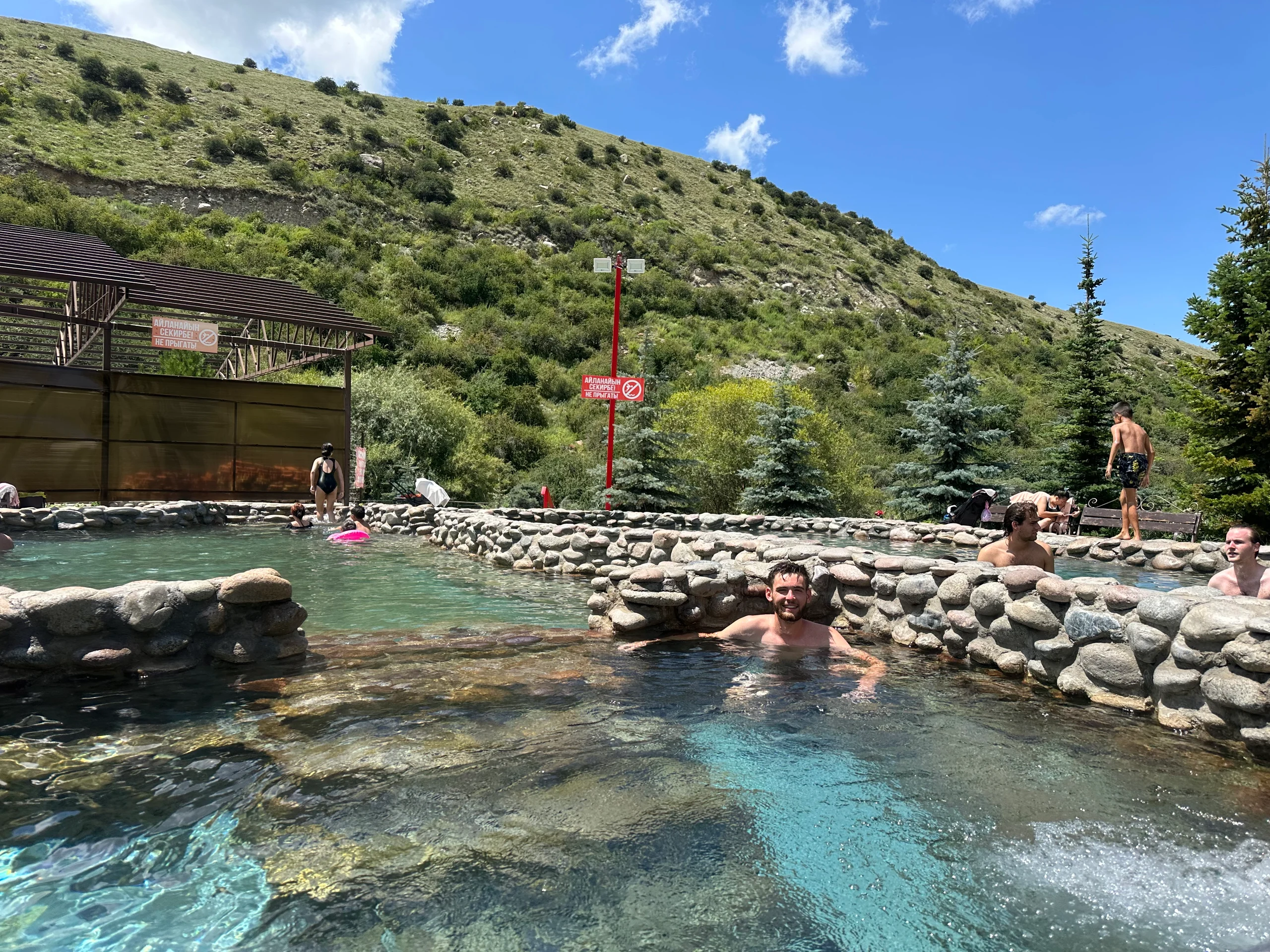 Am späten Vormittag nahm ich für gerade einmal fünf Euro ein Taxi zu den heißen Quellen Aksuu Kench, etwa 30 Minuten von Karakol entfernt. Die Anlage bestand aus mehreren Becken mit unterschiedlich heißen Temperaturen. Besonders das heißeste Becken mit 42 °C hatte es in sich – ich brauchte etwas, bis sich mein Körper daran gewöhnte. Kein Wunder, dass sich dort kaum jemand hineinwagte.