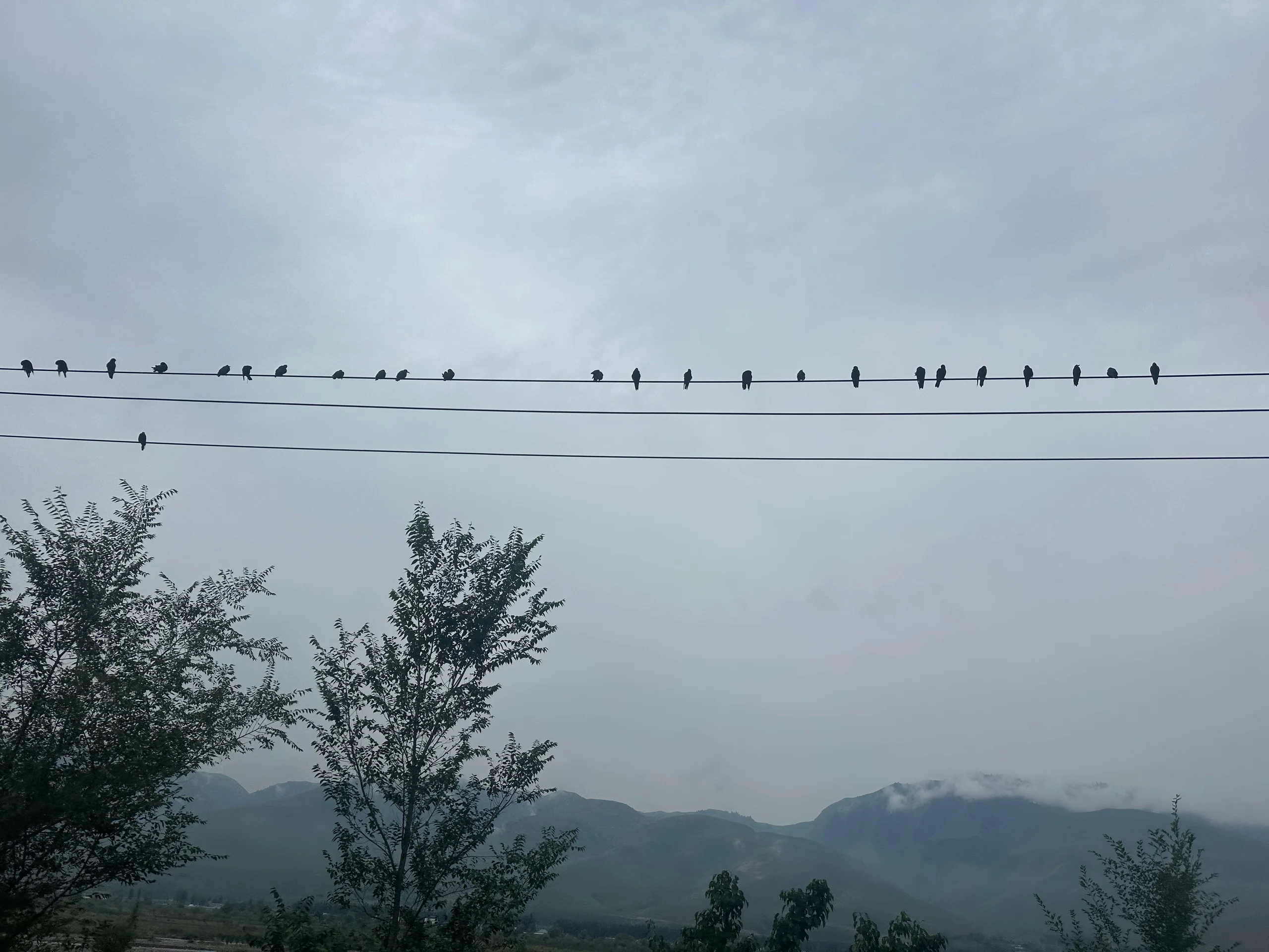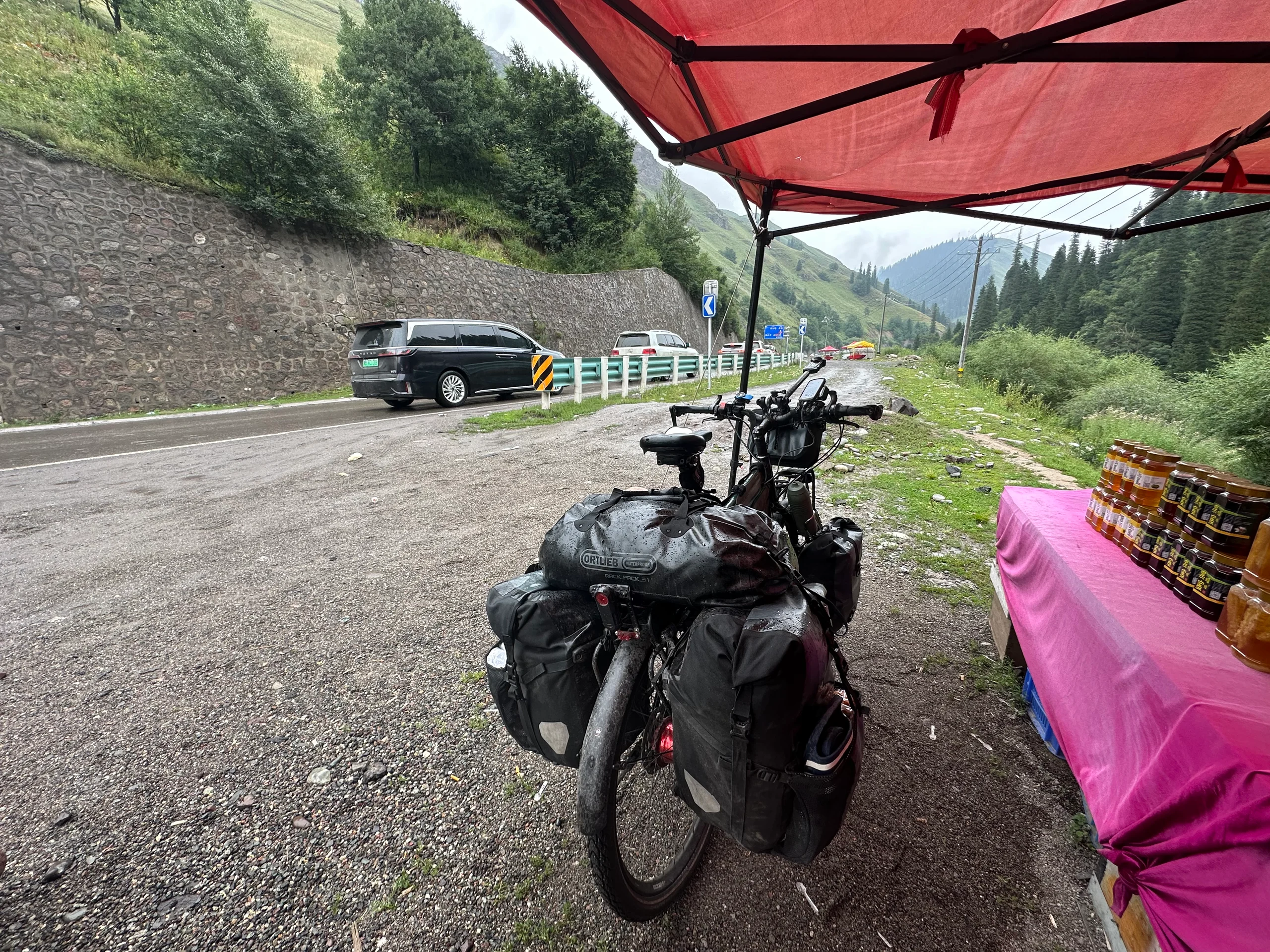 Der Weg führte mich kontinuierlich bergauf, und das bei anhaltendem Nieselregen. Die Strecke wurde zäh – nicht nur wegen der Steigung, sondern auch, weil ich auf einen ewig langen Stau geriet. Ich schlängelte mich zwischen den Autos hindurch, rechts, links, immer weiter nach oben. Offenbar wird auf diesem Abschnitt in Richtung Ürümqi eine neue Straße gebaut, weshalb sich der Verkehr staut und kaum noch vorankommt.
