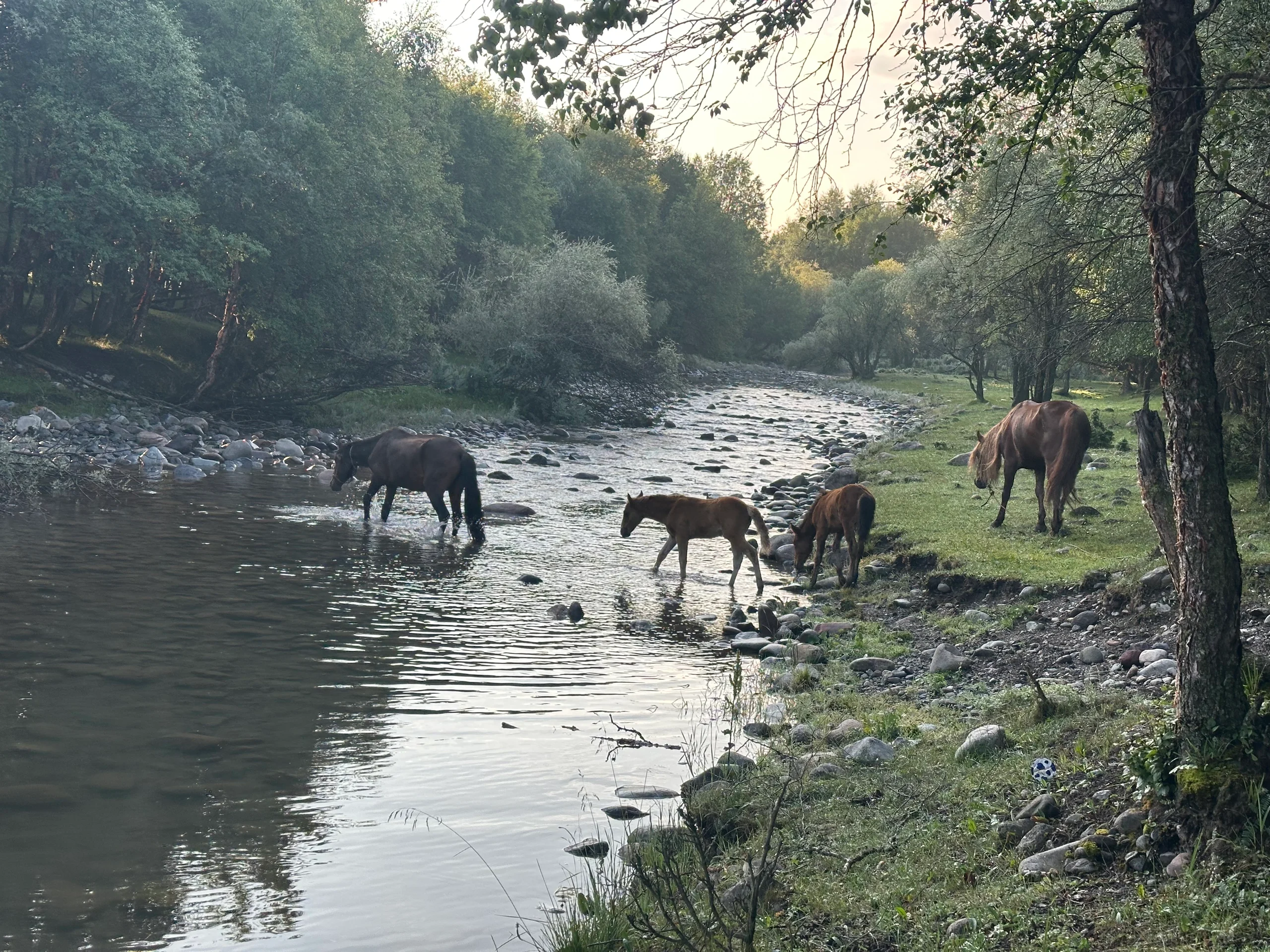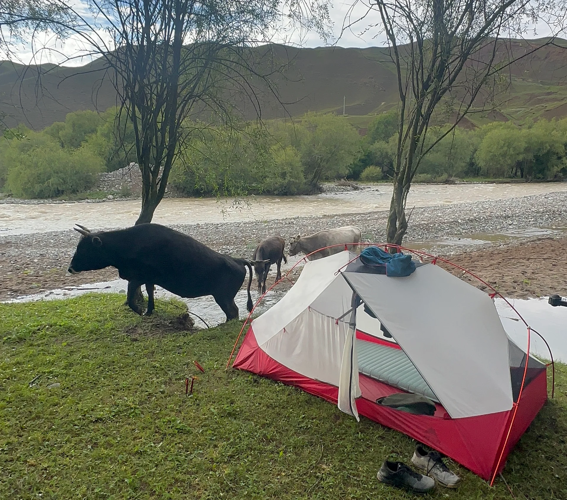 Und dann – als würde die Natur mir zeigen wollen, dass ich hier genau richtig bin – tauchte ein kleiner Trampelpfad direkt neben meinem Zelt auf, auf dem eine Herde Kühe den Fluss durchquerte. Sie blieben kurz stehen, blickten verwundert auf mein Zelt, schnaubten, und zogen dann weiter. Wenige Minuten später erschien auf der gegenüberliegenden Seite eine ganze Schafherde.