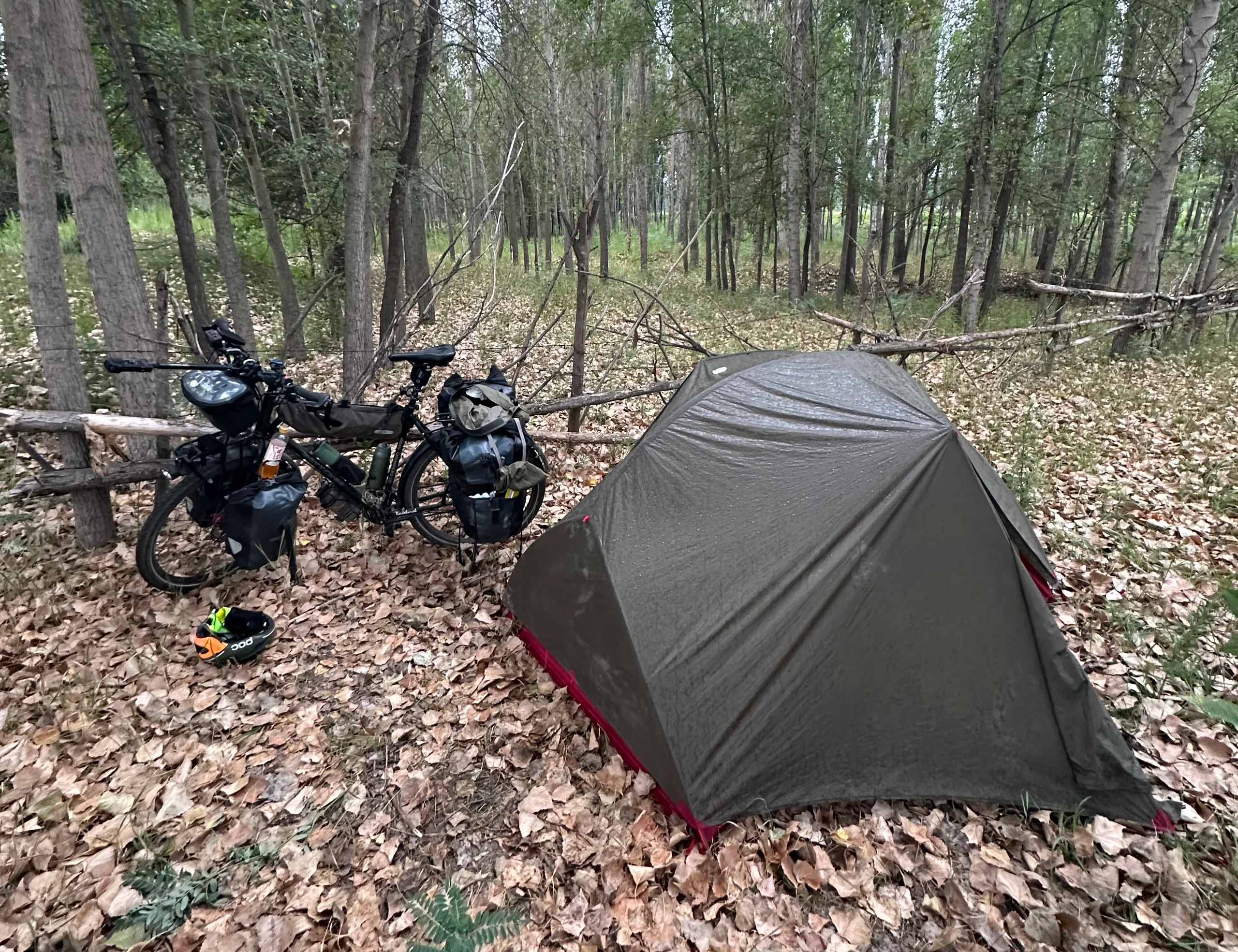 Nachmittags hörte es endlich auf zu regnen, und ich kehrte irgendwo an der Strecke ein, um etwas Warmes zu essen. Danach fuhr ich leicht fröstelnd und immer noch feucht weiter, bis ich auf etwa 2000 Höhenmetern einen kleinen, unauffälligen Schleichweg neben der Straße entdeckte. Ich bog ab, fuhr ein Stück Richtung Fluss, immer tiefer hinein zwischen Bäumen und Böschungen, bis ich eine geschützte Stelle erreichte – kaum einsehbar von der Straße, abgeschirmt durch dichte Vegetation.