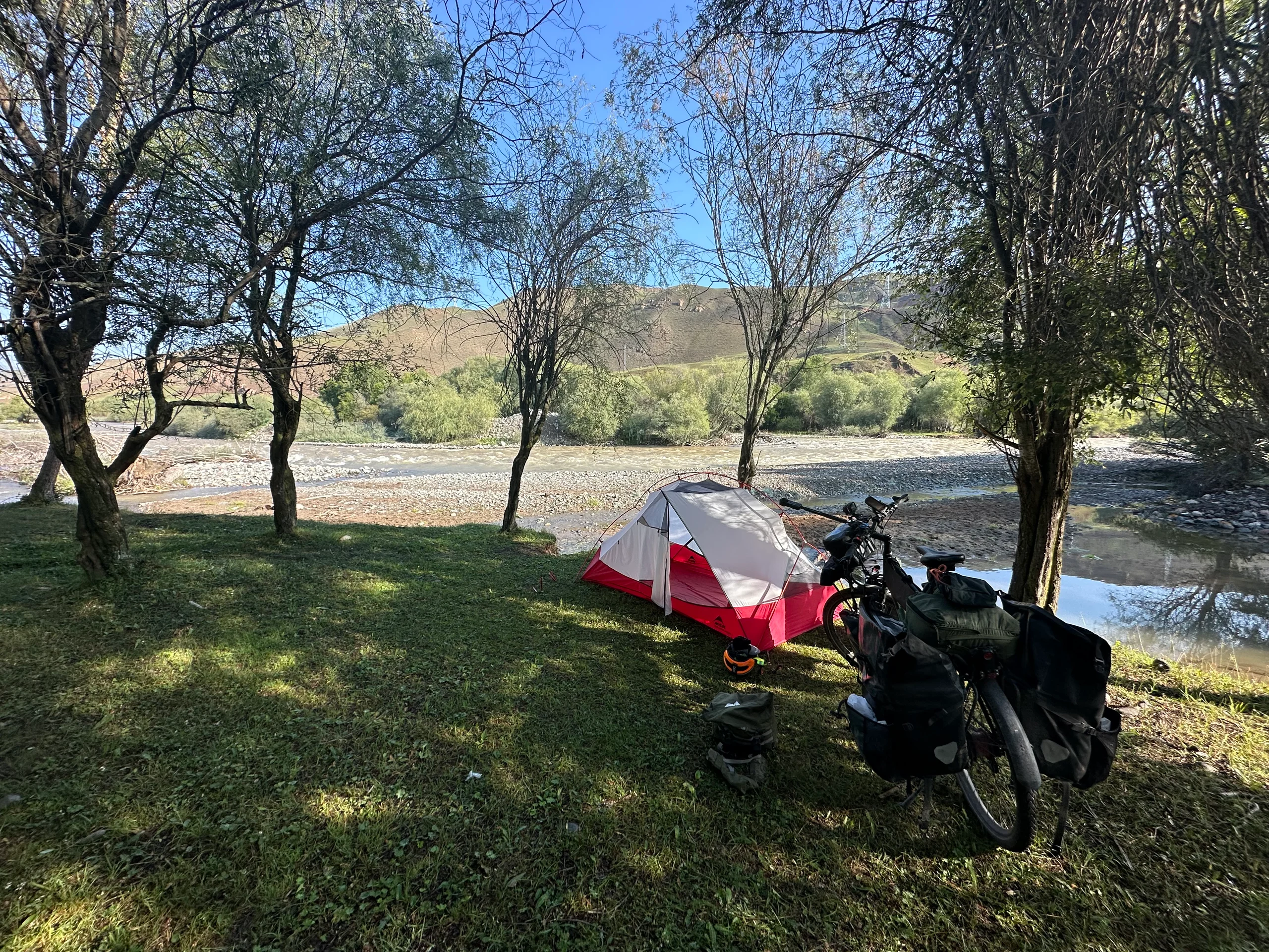 Heute Morgen wachte ich friedlich in meinem Zelt am Fluss auf. Während ich meine Sachen zusammenpackte, zogen ruhig Kühe, Pferde und ein Reiter an mir vorbei – letzterer hielt von der gegenüberliegenden Flussseite aus seine Schafherde im Blick. Ein ruhiger, beinahe idyllischer Start in den Tag.