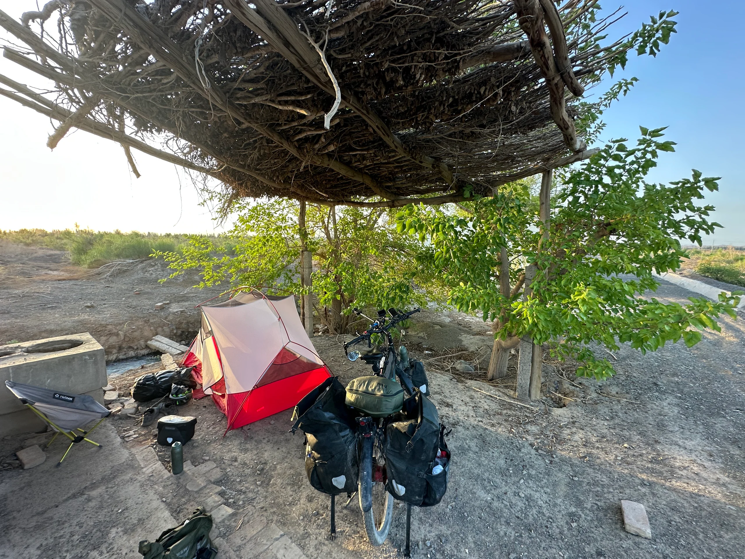 Heute Morgen hatte ich mir vorgenommen, besonders früh zu starten – doch mein Körper machte mir einen Strich durch die Rechnung. Trotz des Weckers verschlief ich, da mir offenbar die wenigen fünf Stunden Schlaf der letzten Nacht nicht ausgereicht hatten. So begann mein Tag mit dem Sonnenaufgang: Ich baute mein Zelt unter dem schattenspendenden Zweigdach ab, verzichtete auf das Frühstück und machte mich sofort auf den Weg, um so viele Kilometer wie möglich in den noch relativ „kühlen“ Morgenstunden zu absolvieren. Auch wenn es nachts in der Region nicht unter 32 °C abkühlt, ist jede Stunde ohne pralle Mittagssonne ein Vorteil.