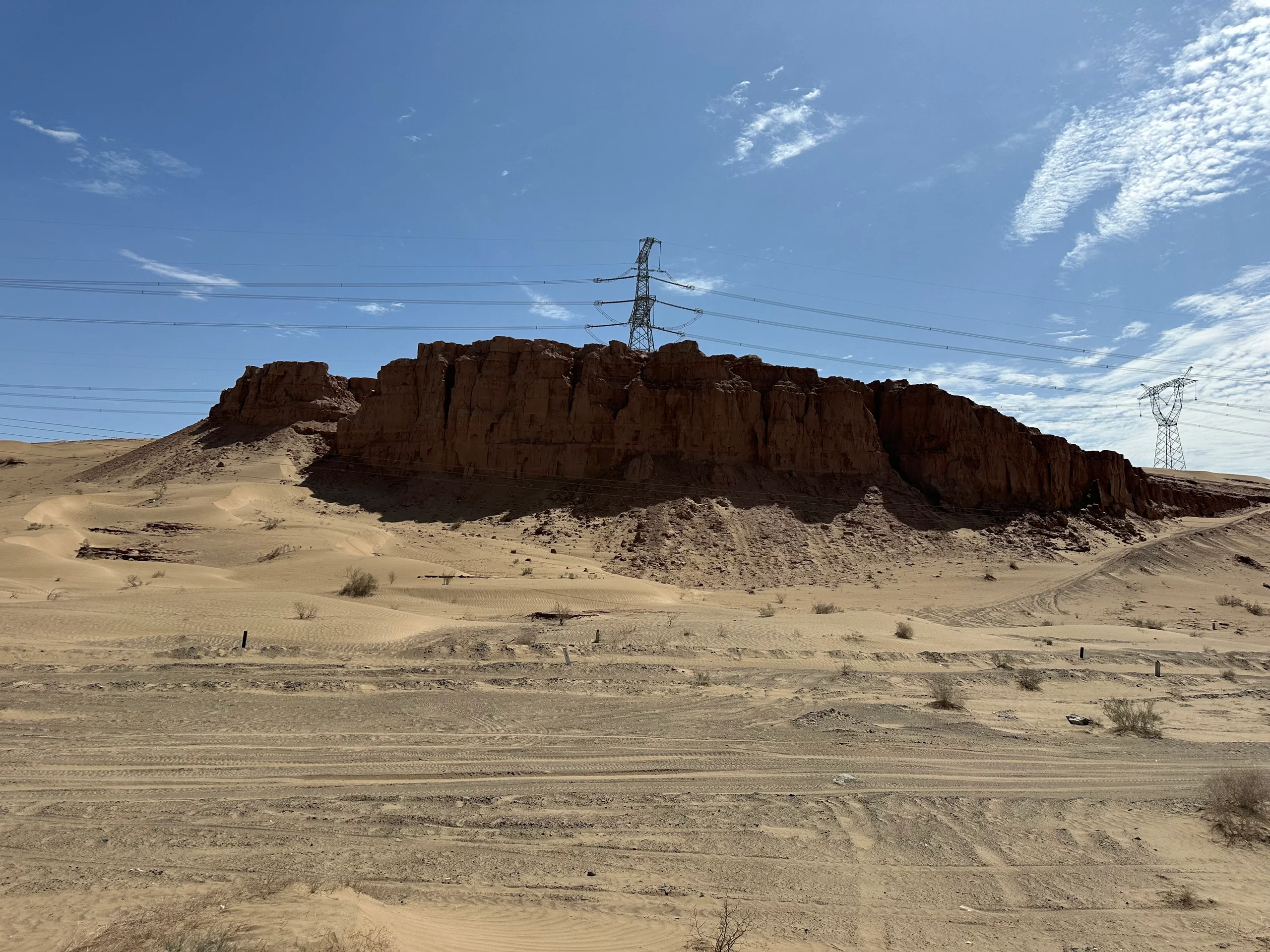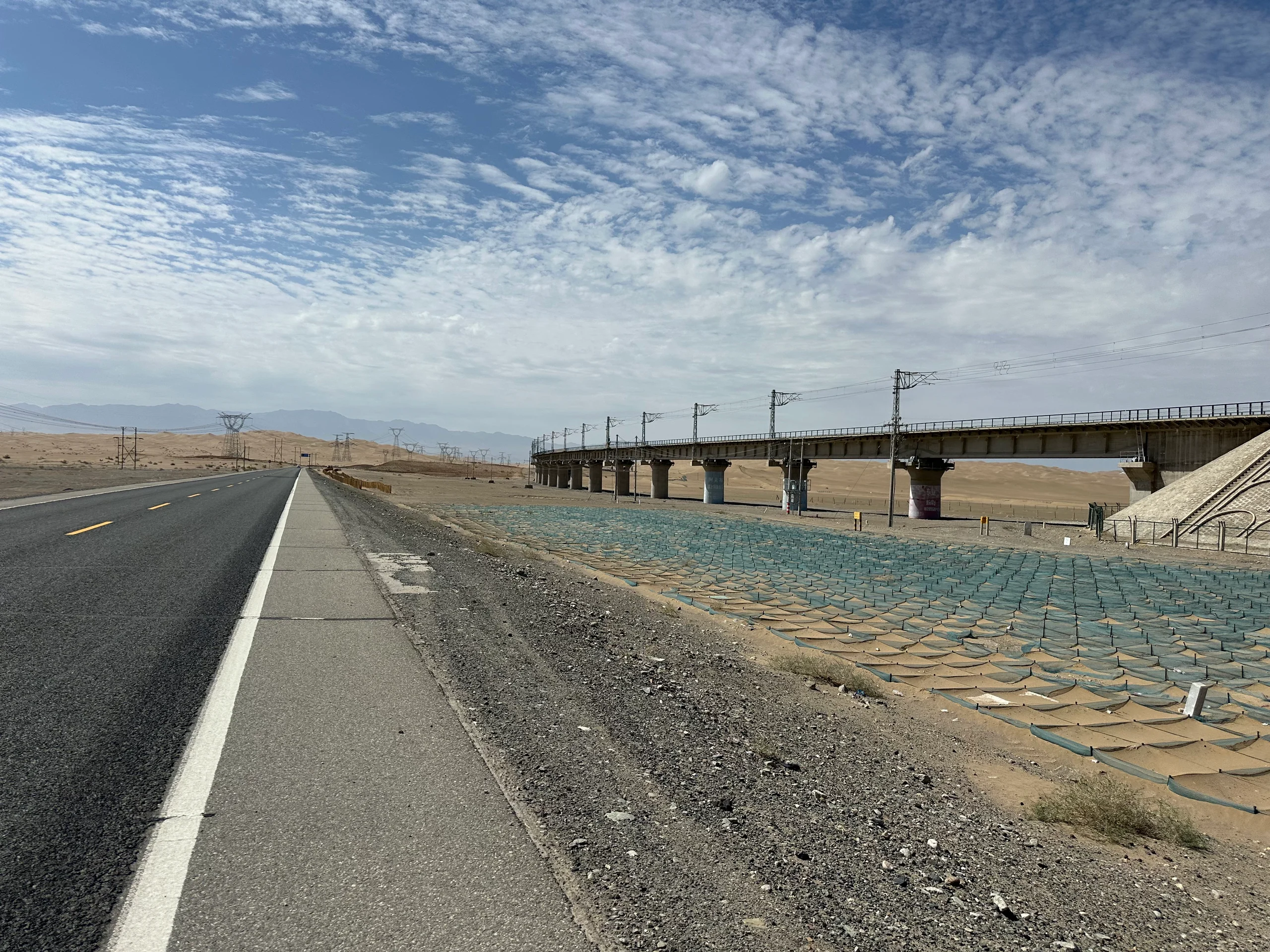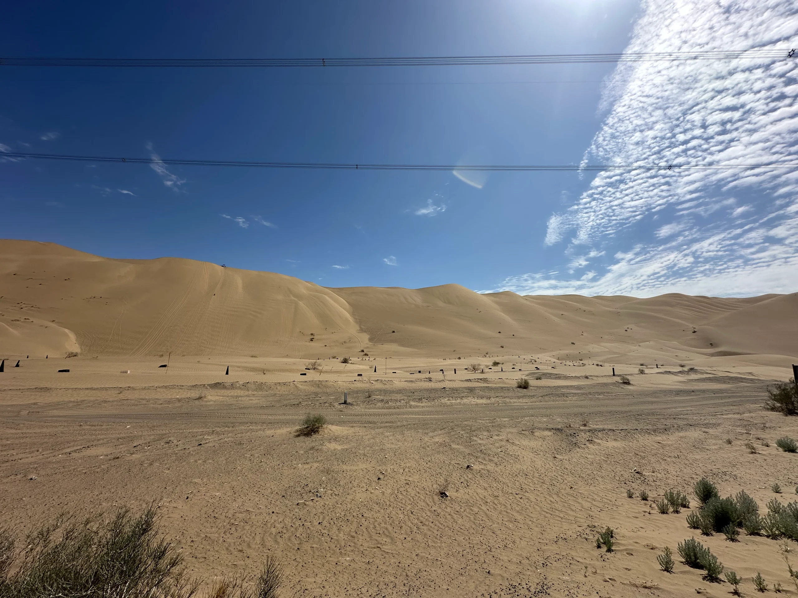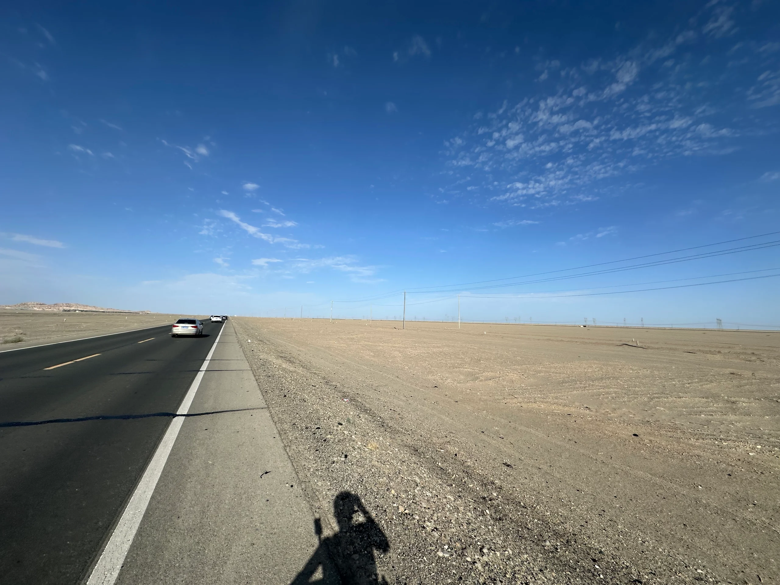 Dann verließ ich Dunhuang und tauchte wieder ein in die scheinbar endlose Wüstenlandschaft. Die Strecke war überraschend abwechslungsreich: Von karger Steppe über weite, leere Ebenen bis hin zu beeindruckenden Wüstenbergen mit feinem Sand. Auf diesen tobten sich zahlreiche Chinesen mit Quads und Offroad-Fahrzeugen aus – ein kurioser Anblick.
