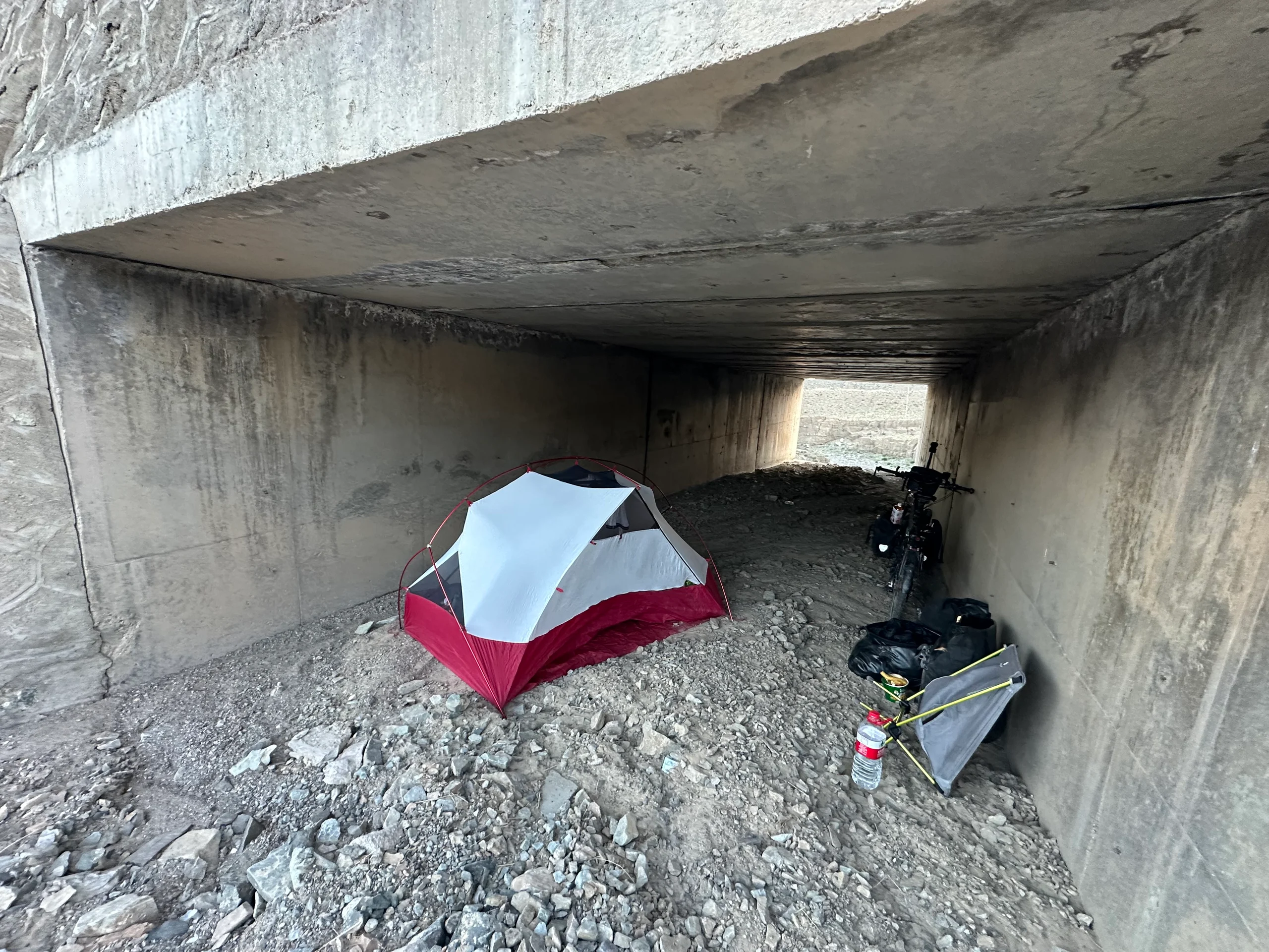 Ein paar Kilometer später entdeckte ich etwas Perfektes: Einen Tunnel unter der Straße, der in Regenzeiten oder bei Schneeschmelze als Abfluss dient – aktuell aber trocken wie ein Flussbett. Ideal also, um mein Zelt gut versteckt aufzubauen, weit genug von der Straße entfernt, um von niemandem gesehen zu werden.