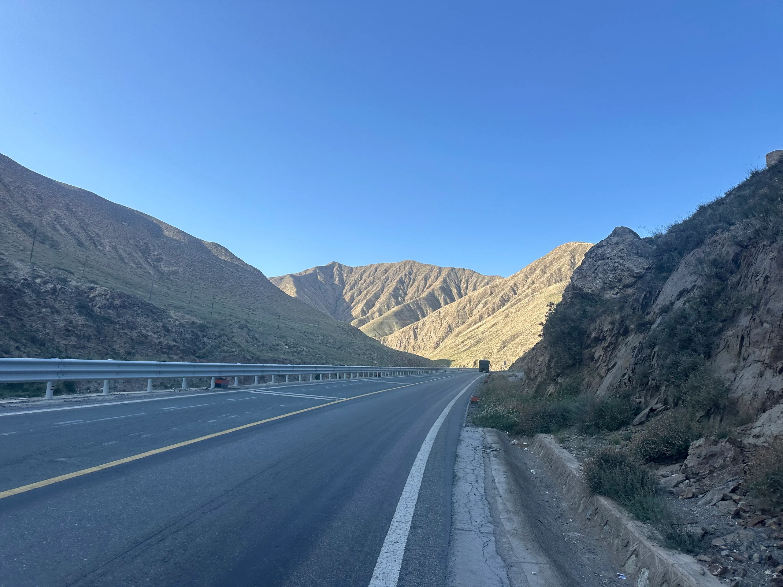 Mit dem ersten Licht des Tages verließ ich mein geschütztes Nachtlager im Tunnel. Die Sonne ging gerade auf, als ich mich dem langen Anstieg näherte. Die Straße führte mich in mehreren Serpentinen höher und höher – die Bergkulisse im Licht der Morgensonne war einfach spektakulär.