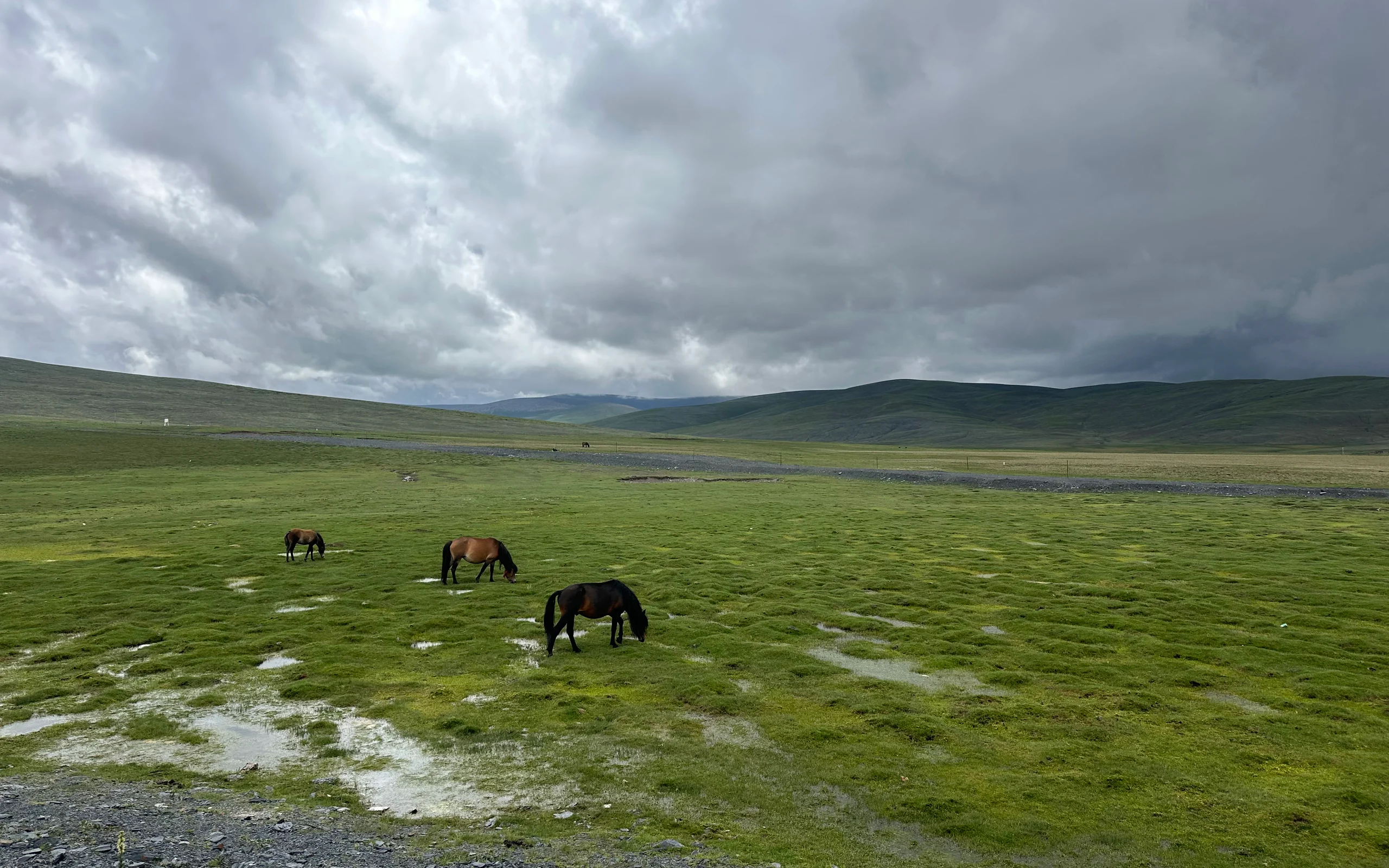 Als der Regen nachließ, fuhr ich optimistisch weiter – doch die Wetterlage änderte sich schnell. Auf dem Anstieg zum zweiten Pass bemerkte ich, dass der Wind gedreht hatte. Die schwarzen Wolken, die eben noch von mir weggezogen waren, kehrten nun rasch zurück. Die Landschaft bot zwar links und rechts größere Berge, doch der Pass selbst lag relativ offen.