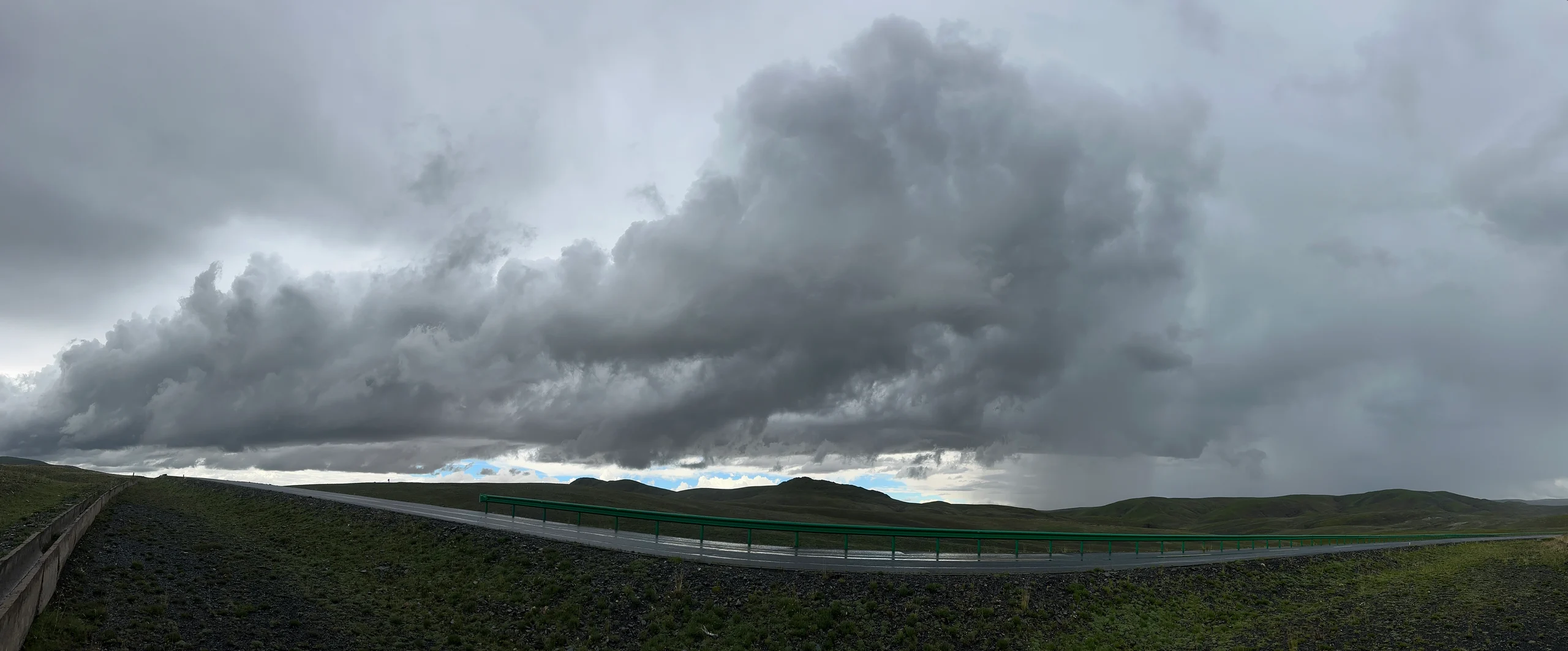 Kaum oben angekommen, schlug das Wetter zu. Ich wollte mein Fahrrad in den Straßengraben legen, um mich vor Blitzen zu schützen – in diesem Moment schlug ein Blitz nur 50 m entfernt in einen Mobilfunkmast auf einem kleinen Hügel ein. Vor Schreck kauerte ich mich flach in den Graben, das Herz raste. Auch wenn der Mast und die Berge in der Umgebung höher waren, fühlte ich mich der Naturgewalt schutzlos ausgeliefert. Glücklicherweise folgte kein zweiter Blitz, doch ein heftiger Hagelschauer prasselte auf mich nieder, gefolgt von starkem Regen.