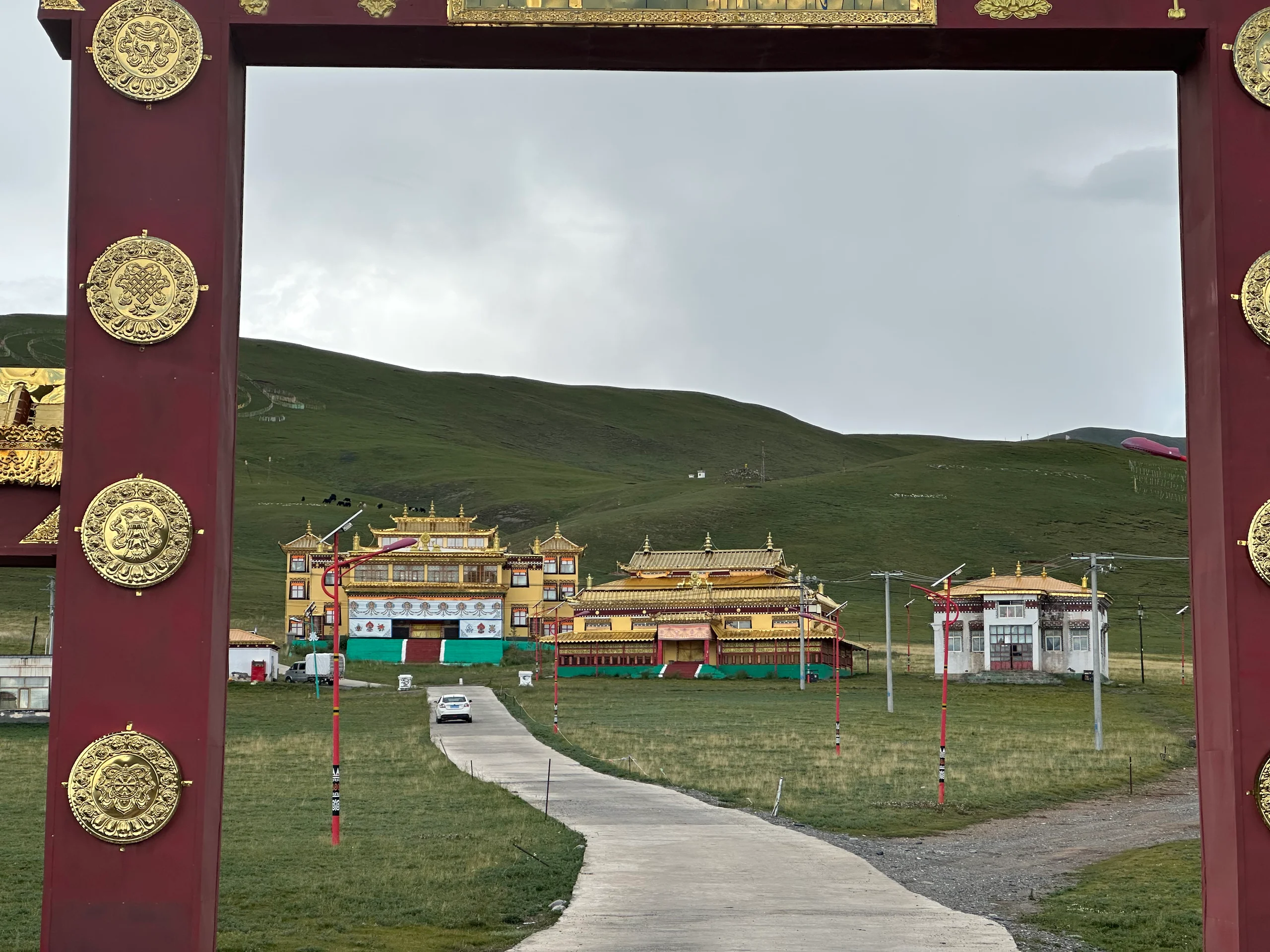 Mit genügend Essen und Wasser im Gepäck nahm ich den ersten der beiden großen Pässe des Tages in Angriff. Der morgendliche Gegenwind machte den Anstieg mühsam, und so brauchte ich einiges an Geduld, um schließlich den Pass auf 4.634 m zu erreichen. Dort legte ich eine kurze Essenspause ein, bevor es für etwa 20 km kontinuierlich bergab auf 4.200 m ging. In einem kleinen Dorf am Talboden kehrte ich zum Mittagessen ein. Eigentlich wollte ich mir dort ein imposantes buddhistisches Kloster ansehen, doch es war leider für Besucher geschlossen.