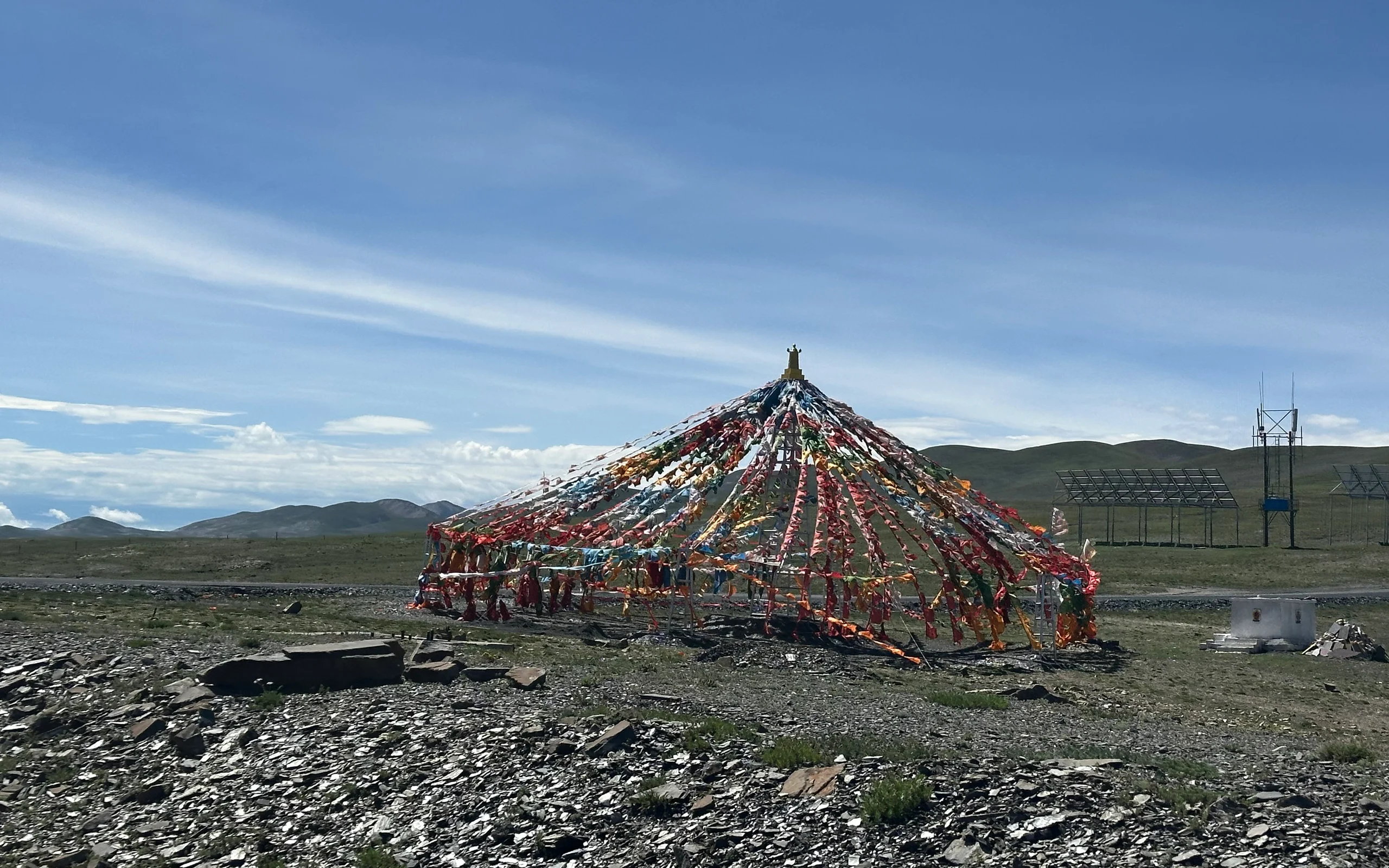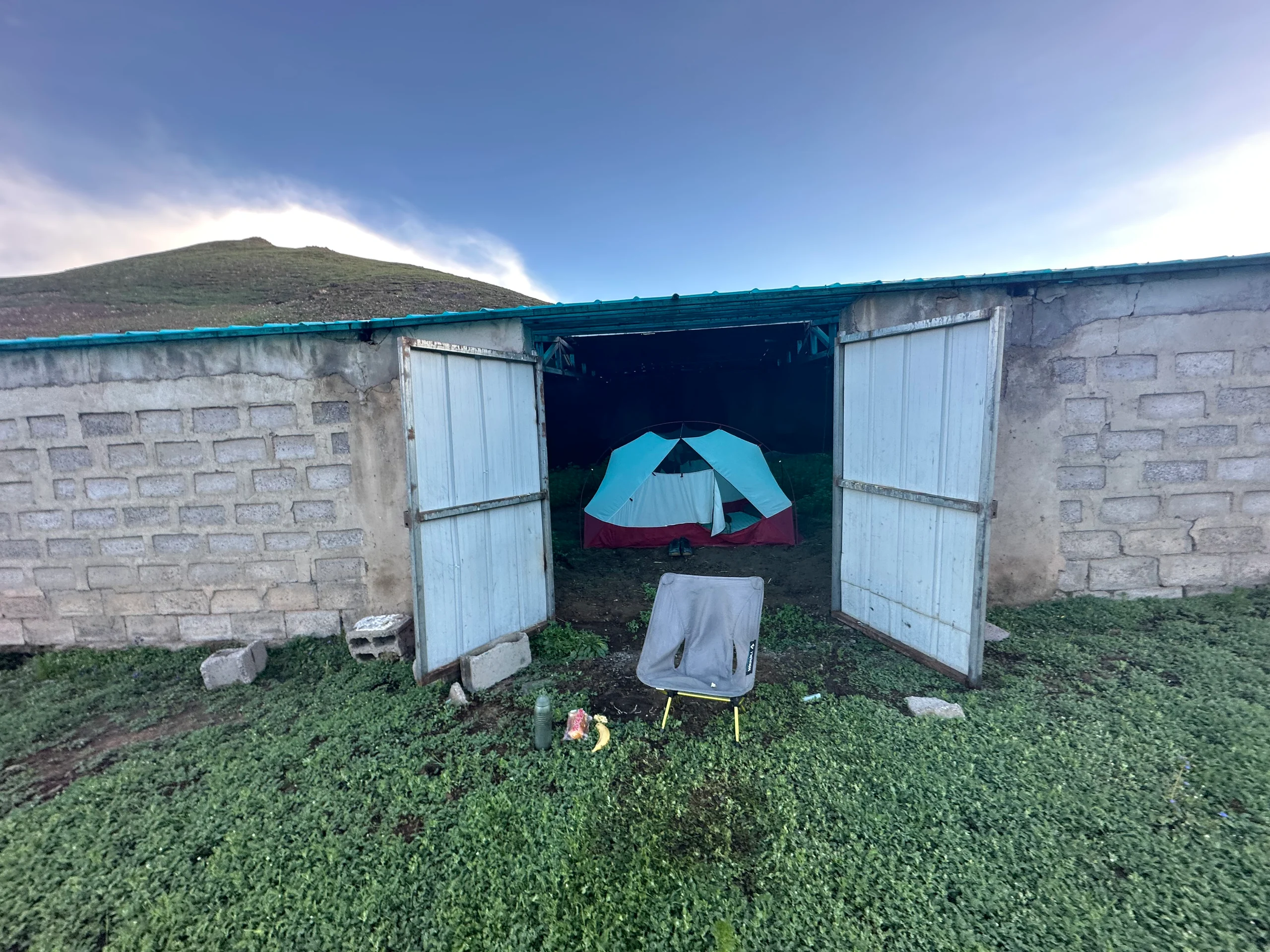 Nach dieser Pause erklomm ich den Pass und wurde mit einer traumhaften Abfahrt durch weitläufige, sattgrüne Berglandschaften belohnt. Auf der Suche nach einem Schlafplatz überquerte ich eine Brücke und entdeckte ein kleines Dorf zwischen zwei Gebirgszügen. Stromleitungen führten dorthin, doch als ich die wenigen Häuser erreichte, fand ich keine Menschenseele. Es wirkte, als sei der Ort schlagartig verlassen worden. In den Gebäuden hingen noch tibetische Wandverzierungen, und verlassene Ställe deuteten darauf hin, dass hier einst Yak-Herden gehalten wurden.