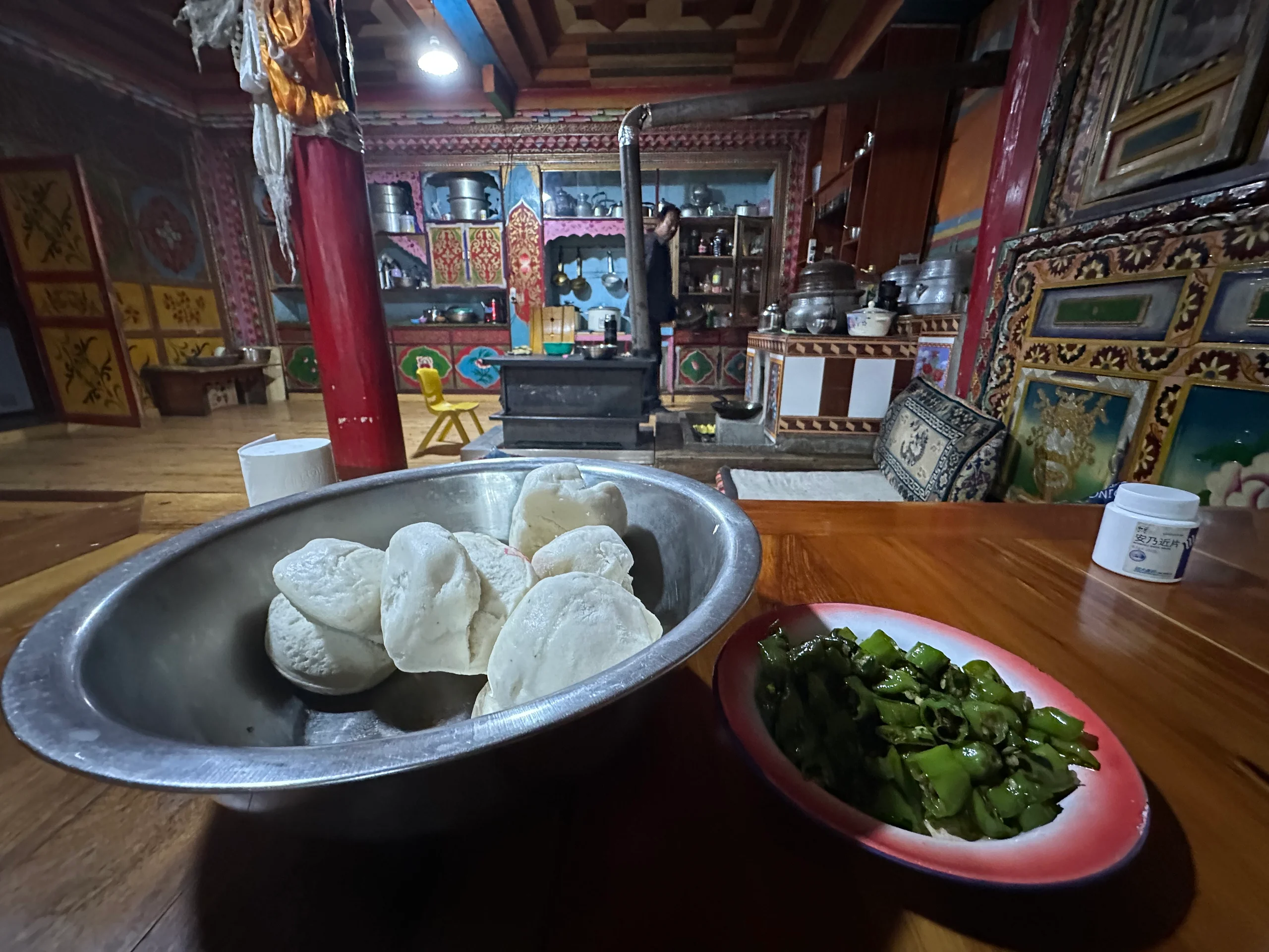 Heute startete ich nach einer erholsamen Nacht entspannt in den Tag. Zum Frühstück bereitete mir der Vater meines Gastgebers, der ebenfalls im Haus lebt, frisch gemachte Teigtaschen, scharfe Paprika, Yak-Milch und Tee zu – ein perfekter Start.