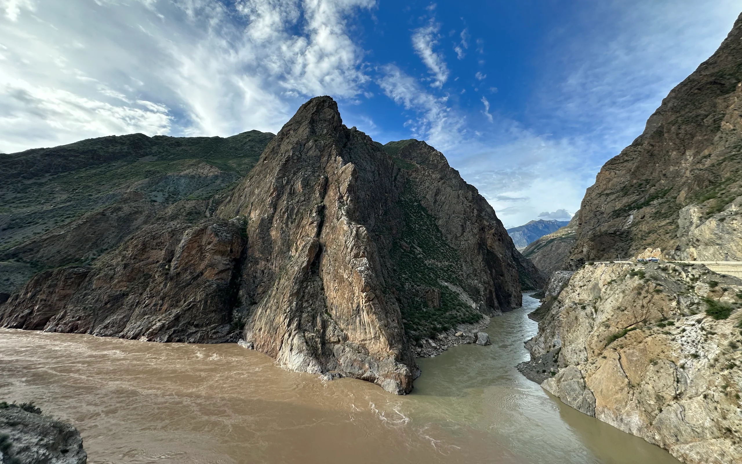 Die Schluchten und abgelegenen Dörfer, die in den Kurven des Flusses immer wieder auftauchten, wirkten wie kleine idyllische Oasen. Doch plötzlich stand ich vor einer gigantischen Baustelle. Eigentlich sollte die Straße am Fluss weiterführen, doch vor mir türmte sich ein riesiger Schutthaufen aus Steinen. Links und rechts wurden Tunnel gebohrt und massive Befestigungen errichtet. Meine einzige Option war ein halbfertiger Tunnel, durch den es sogar von der Decke regnete, da er noch nicht richtig abgedichtet war. Abenteuerlich – aber immerhin führte er mich wieder zum Fluss und zurück auf die Straße.