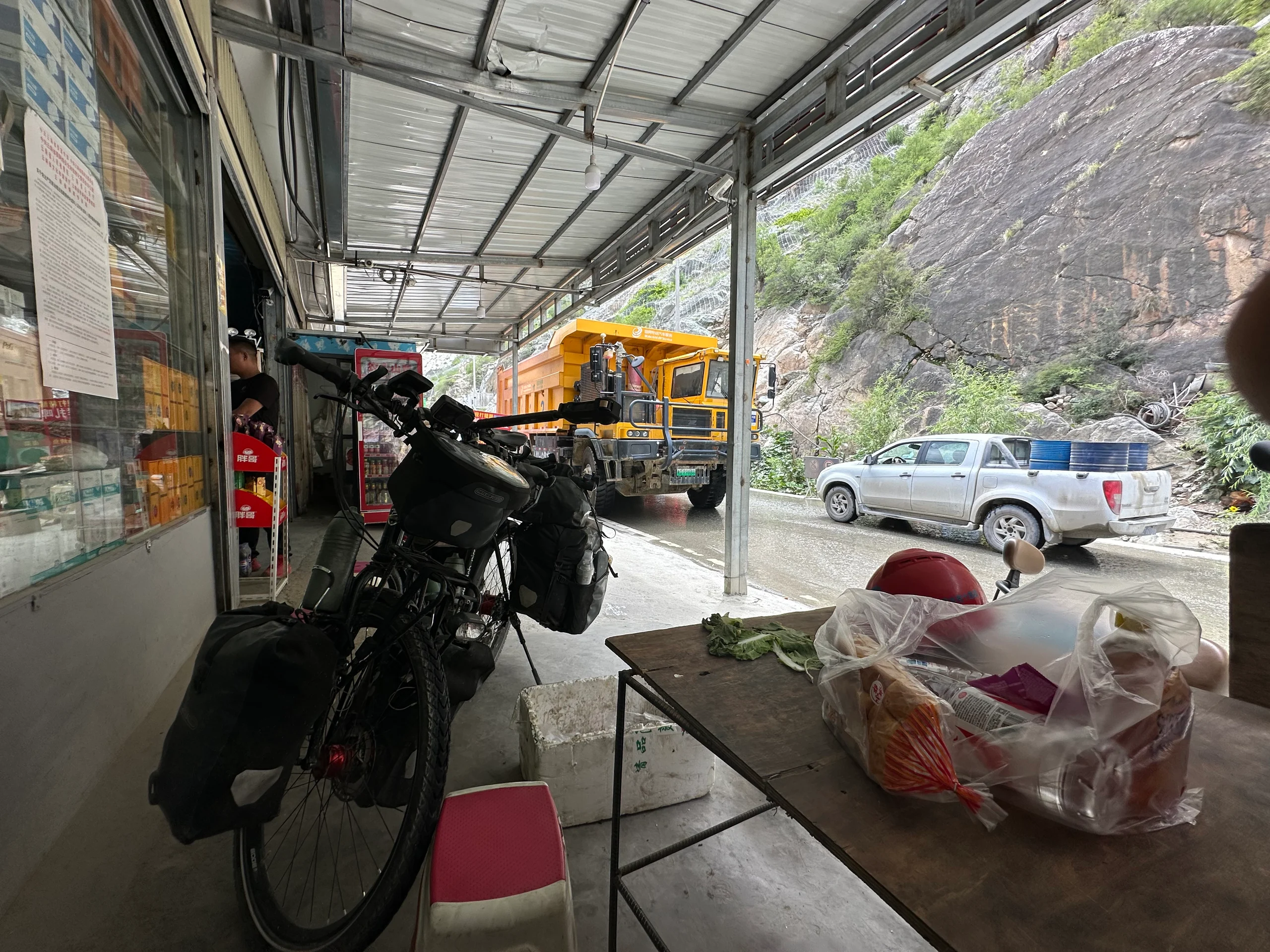 Von dort ging es durch ein paar Dörfer, während um mich herum ununterbrochen riesige Bergwerks-LKWs und Baustellenfahrzeuge rollten. Stück für Stück näherte ich mich der Hauptstraße, die auf der gegenüberliegenden Flussseite in Sichuan verlief. Meine Route hingegen führte durch ein abgelegenes Stück Yunnan. Nach 110 Kilometern erreichte ich schließlich eine Brücke, die mich zurück zur Hauptstraße brachte.