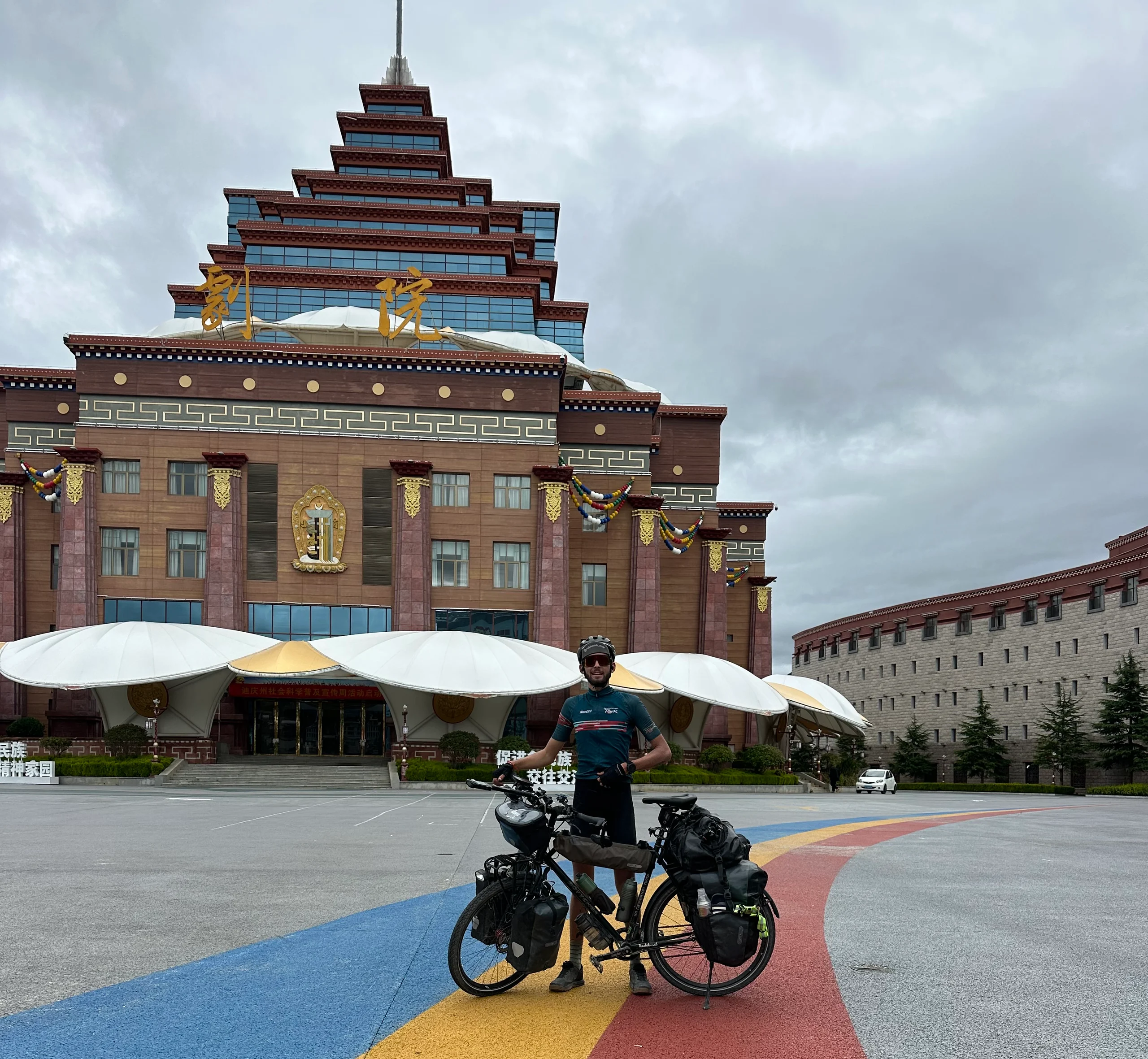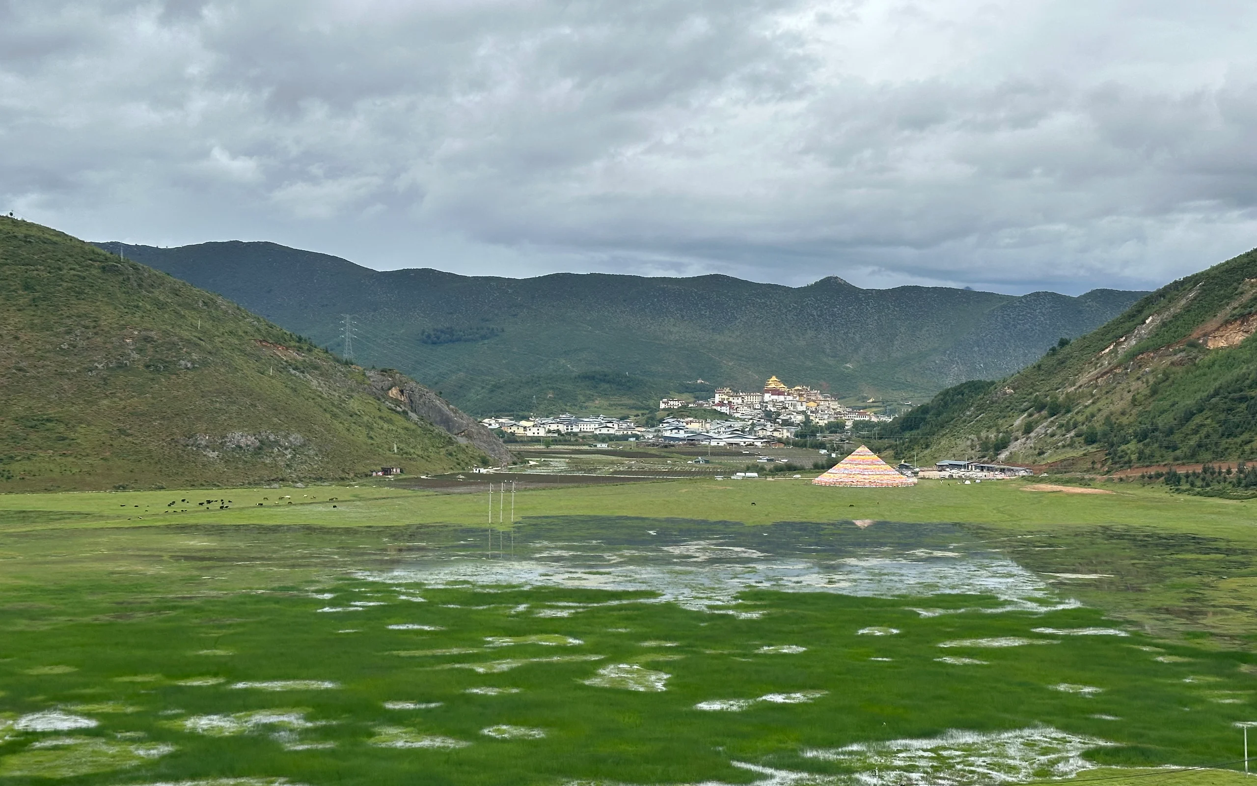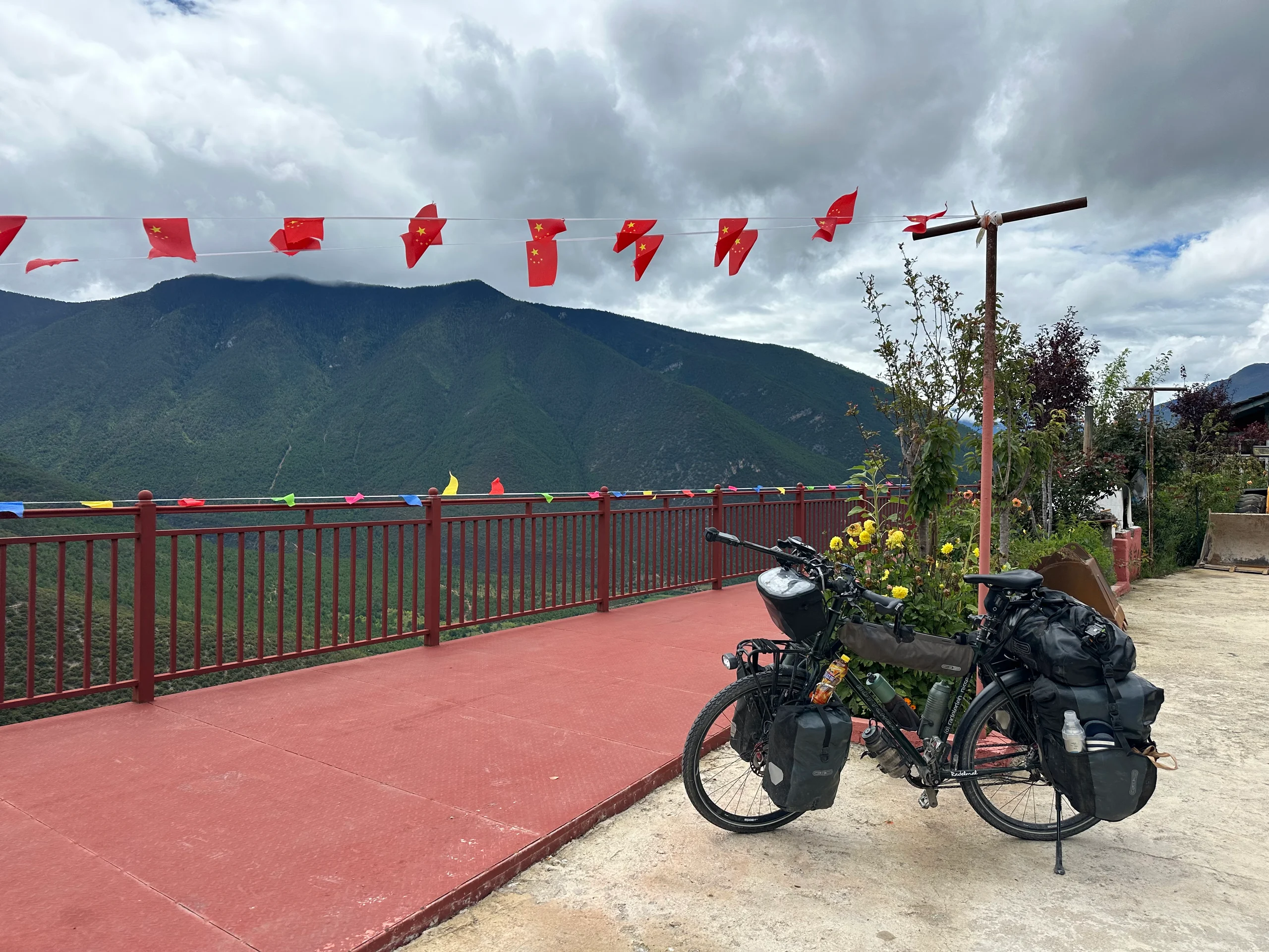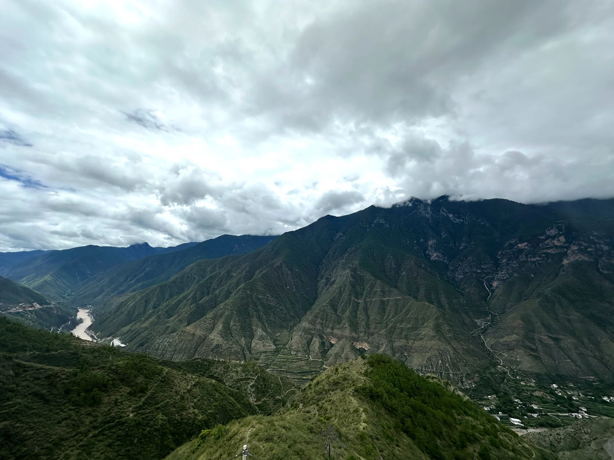 Nach 1700 Höhenmetern erreichte ich schließlich die Passhöhe. Das Wetter hatte bis dahin erstaunlich gut gehalten, auch wenn die Wolken zunehmend dunkler wurden. Von dort ging es noch 300 Höhenmeter abwärts in die Stadt Shangri-La.