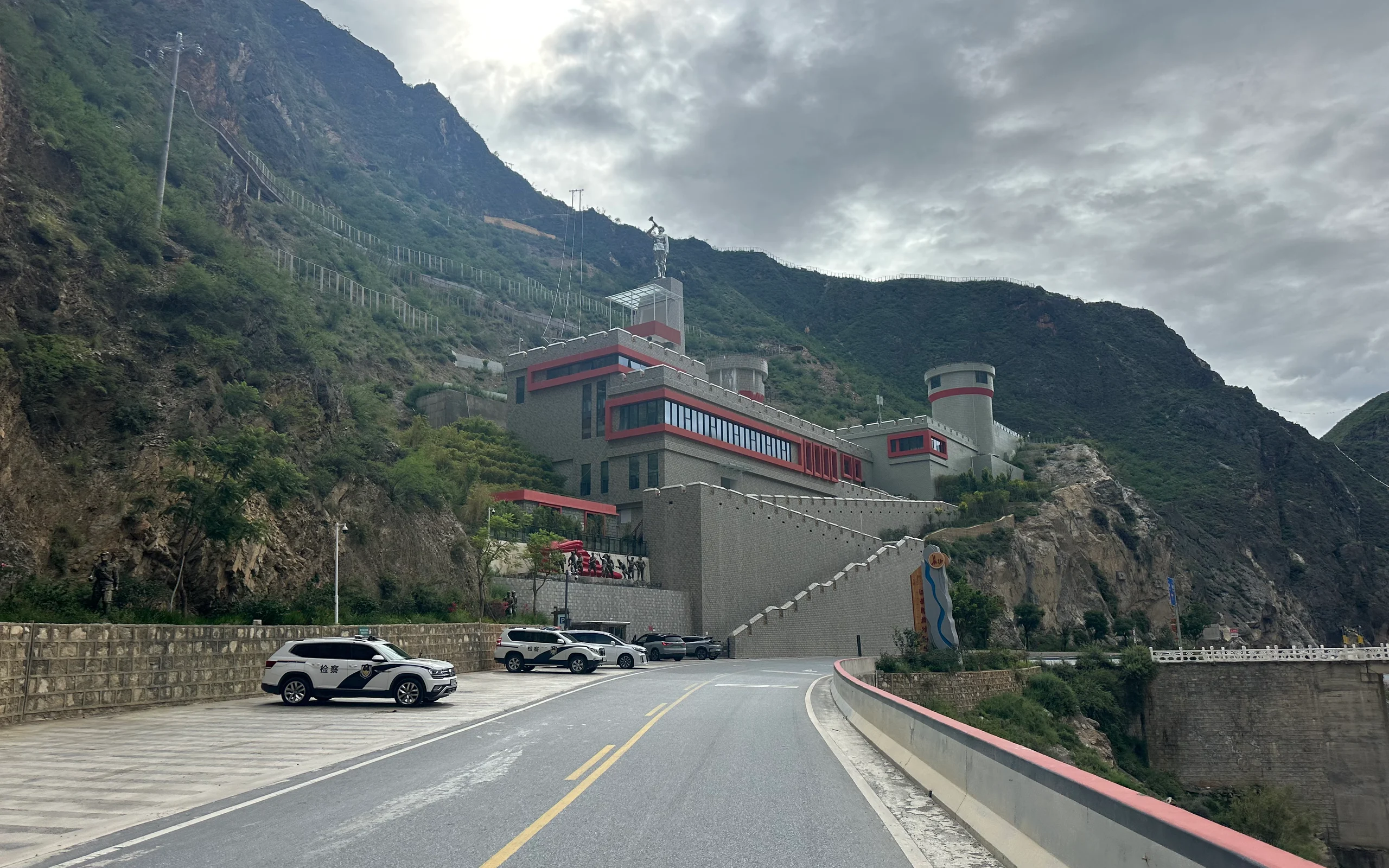 Der Anstieg führte stetig bergauf. Während der Jinsha-Fluss immer kleiner wurde, gelangte ich zunehmend in luftige Höhen. Auf einer Brücke bot sich mir ein kurioses Bild: 15 Kühe blockierten eine Fahrspur, lagen dort völlig entspannt und wiederkäuend, als gehöre die Straße ihnen allein. Die Autofahrer hielten respektvoll Abstand – ein Zeichen dafür, dass die Tiere hier offenbar besondere Bedeutung haben. Die Ruhe, die sie ausstrahlten, war beeindruckend.