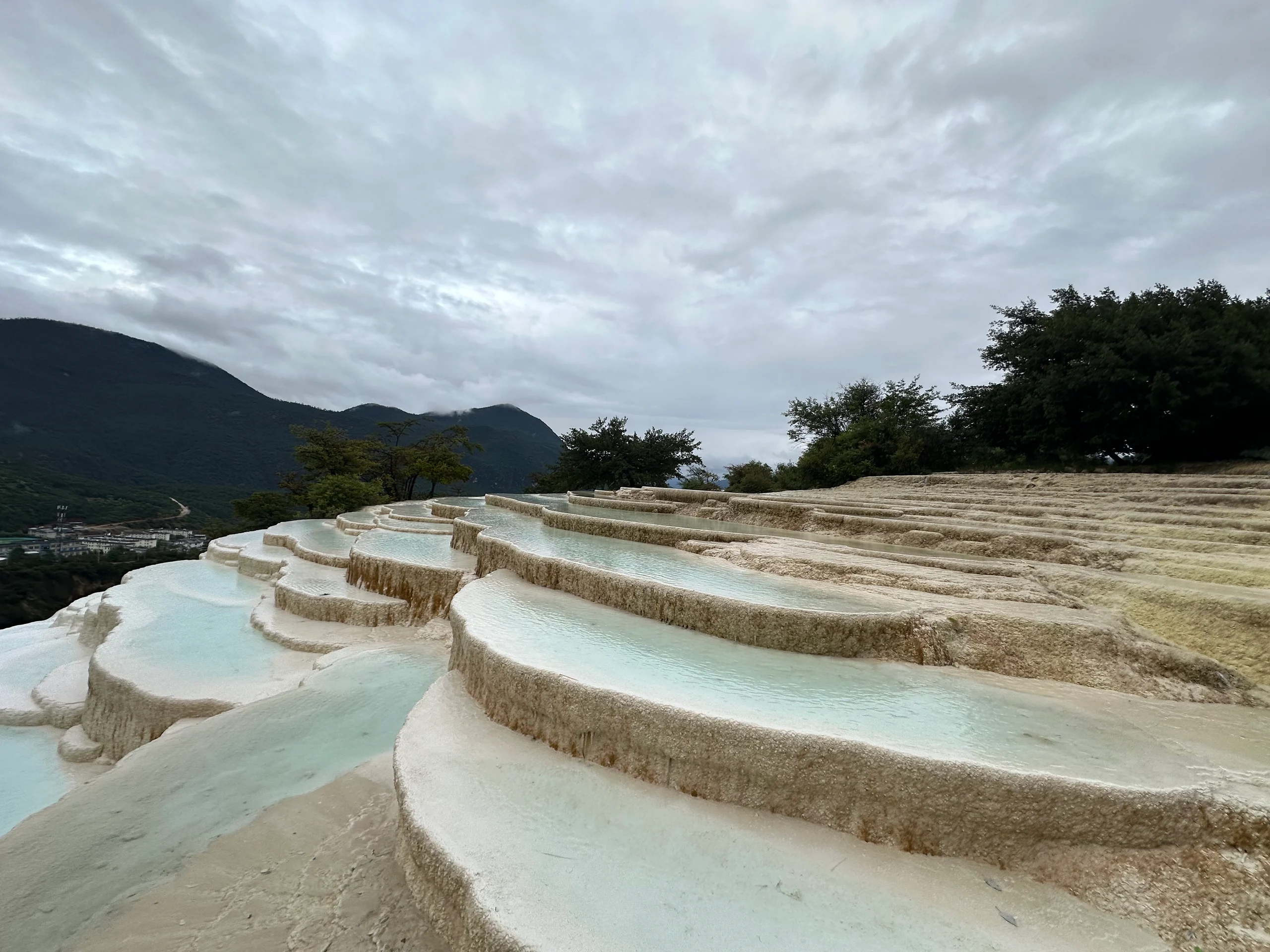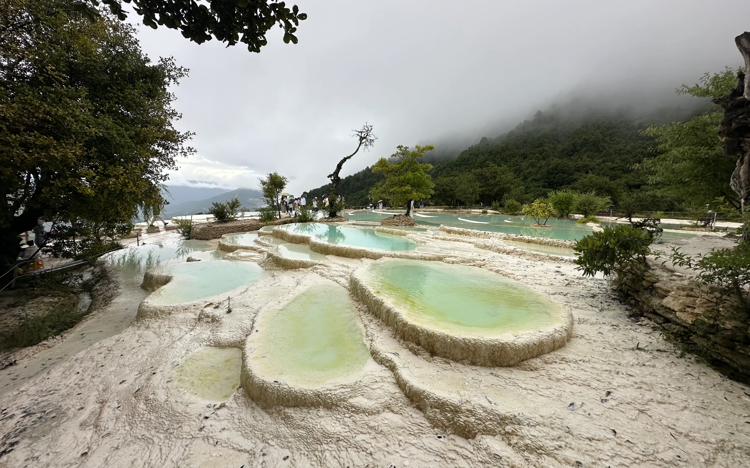 Die Landschaft war atemberaubend: türkisfarbene Becken, weiße Kaskaden und filigrane Strukturen, die eher wie Kunstwerke aussahen als wie ein Naturphänomen. Durch die tief hängenden Wolken, den Regen und die wenigen Touristen wirkte die Szenerie fast mystisch. Ich blieb bis zum Schluss und verließ das Areal als letzter Besucher gemeinsam mit dem Aufseher.