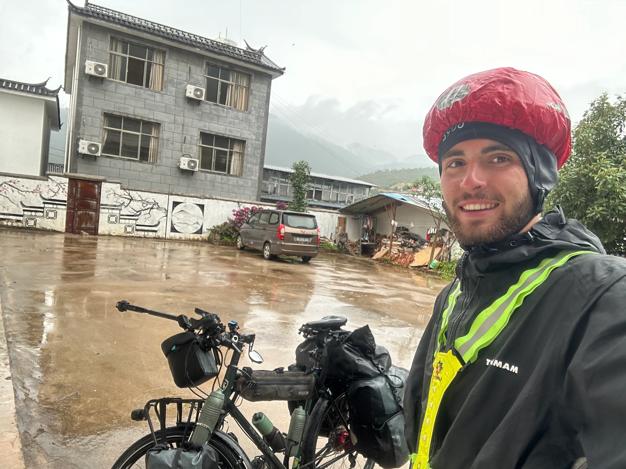 Nach weiteren Kilometern und Passhöhen war ich klitschnass – von außen durch den Regen, von innen durch die „Schwitzsauna“ unter meinen Regenklamotten. Am Ende standen über 1.300 Höhenmeter, knapp 100 Kilometer und fünf Stunden Dauerregen bei sieben Grad auf dem Tacho, bis ich schließlich in Sanbaxiang ankam.