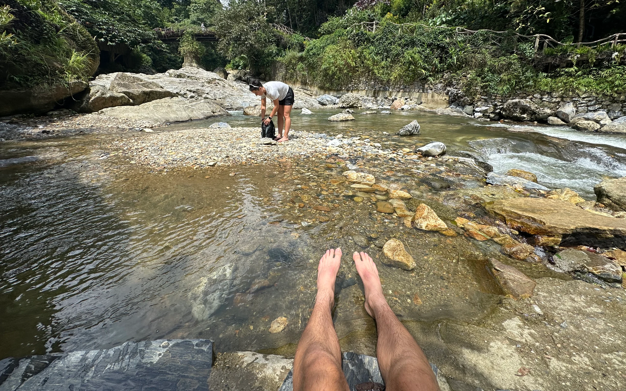 Am Bach, wo es etwas stiller war, entschieden wir uns, die Füße ins Wasser zu halten. Die Erfrischung war so angenehm, dass wir schließlich ganz hineinstiegen. Da wir keine Badesachen dabeihatten, musste die Unterwäsche genügen. Im Vergleich zur feuchtwarmen Luft war das Wasser wunderbar kühl. Anschließend stiegen wir über kleine Pfade wieder zurück in den Dschungel hinauf, da meine Begleiterin ihren Bus in die nächste Stadt erreichen musste. Am Hostel angekommen, gab sie mir noch ein wenig Malariaprophylaxe mit, die ich bislang weder in China noch in Vietnam besorgen konnte. Nun habe ich zumindest für den Notfall etwas dabei.
