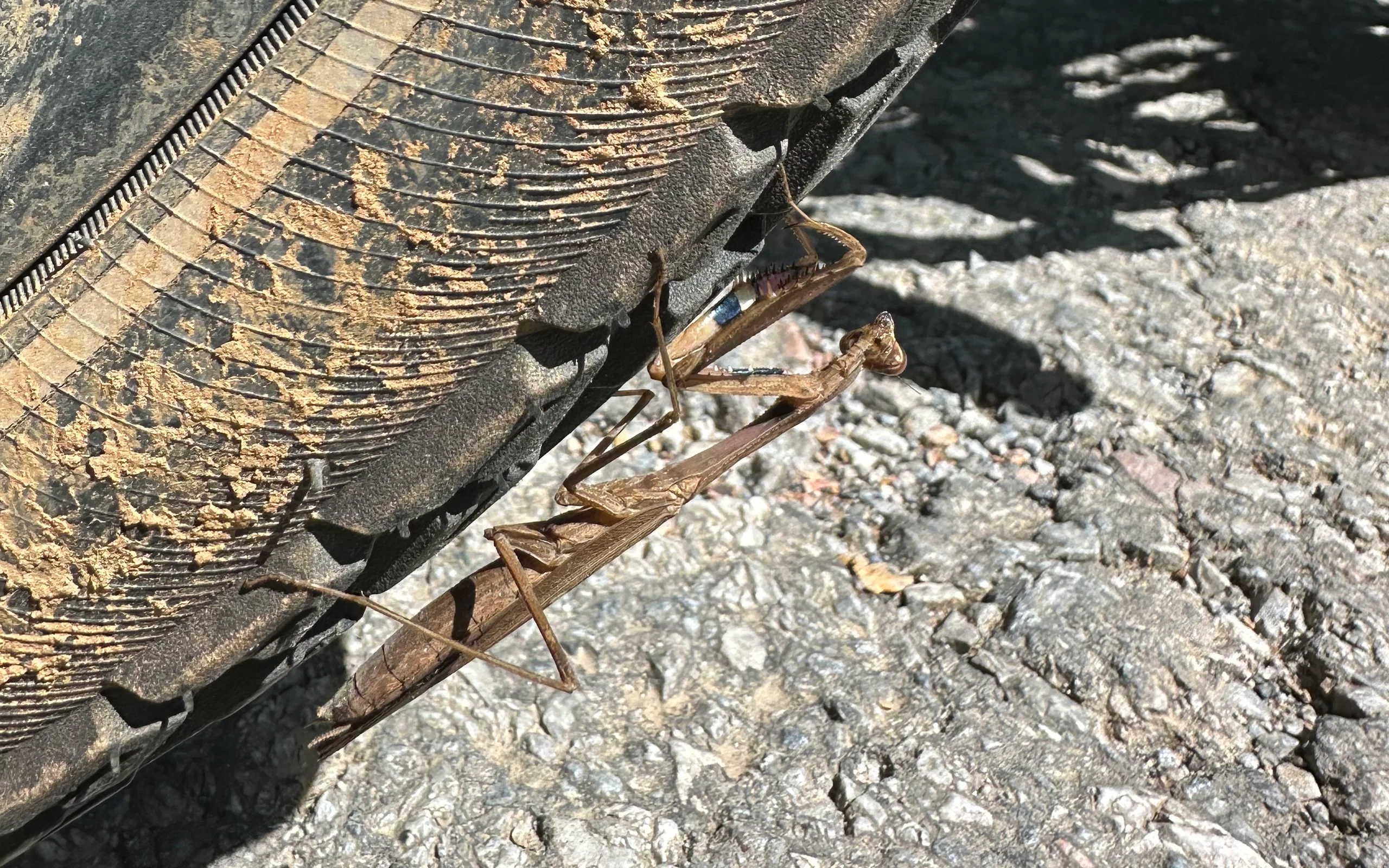 Ein weiteres Highlight erlebte ich in einem kleinen Dorf: eine Gottesanbeterin kletterte an meinen schlammigen Reifen und „tanzte“ dort. Ich filmte kurz, beobachtete das faszinierende Tier, setzte es dann aber wieder sicher in den Dschungel zurück.