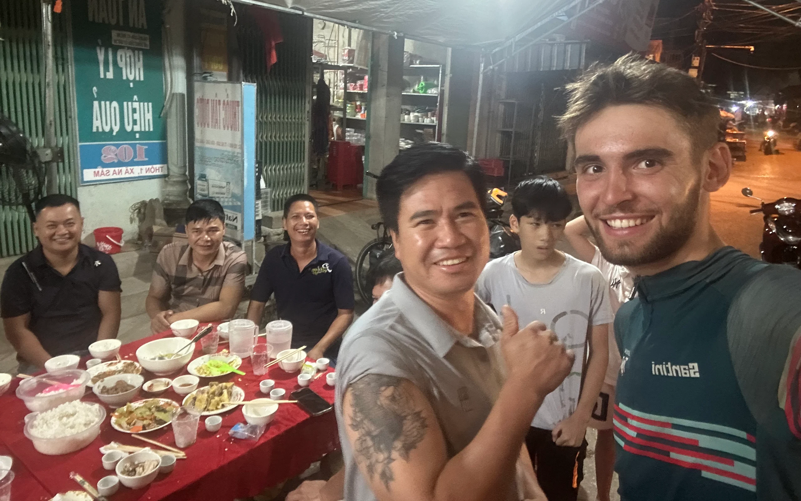 Danach fuhr ich weiter, überquerte noch einen größeren Hügel und erreichte am Abend bei wunderschönem Sonnenuntergang ein kleines Dorf. Dort saß eine Gruppe von Männern zusammen, einer davon offensichtlich schon angetrunken, der mich unbedingt zu sich an den Tisch holen wollte. Ich stimmte zu – nicht zuletzt, weil dort reichlich Essen aufgetischt war.