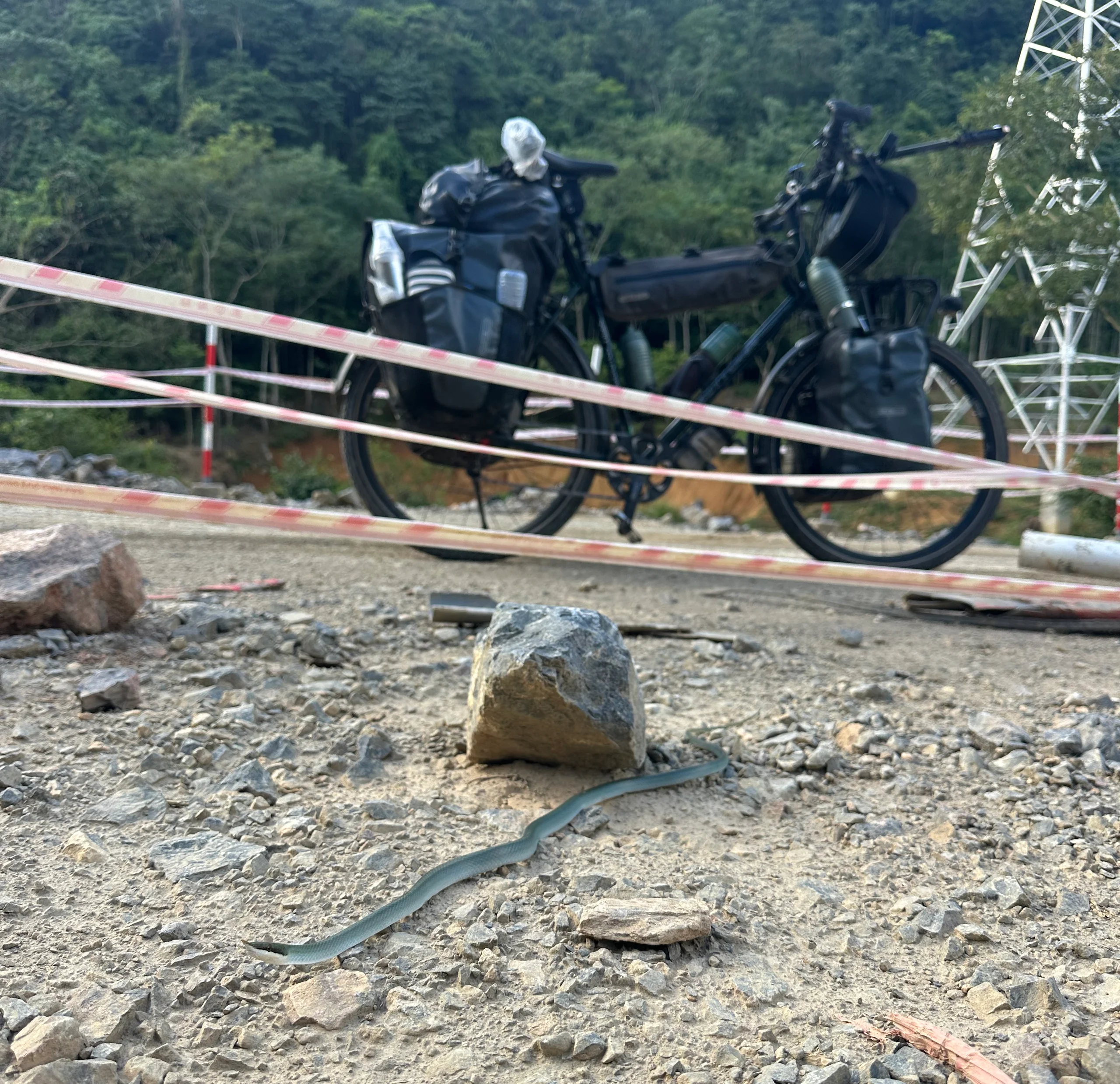 Nach einigen Kilometern entdeckte ich plötzlich eine Schlange, die sich über die Straße schlängelte. Da dort wegen eines Brückenbaus dauerhaft schwere LKWs unterwegs waren und die Fahrbahn auf eine Spur verengt war, wäre sie beim nächsten Fahrzeug unweigerlich überfahren worden. Als ich mich näherte, blieb sie mitten auf der Straße regungslos liegen – vermutlich ein Tarninstinkt, der ihr jedoch zum Verhängnis geworden wäre.