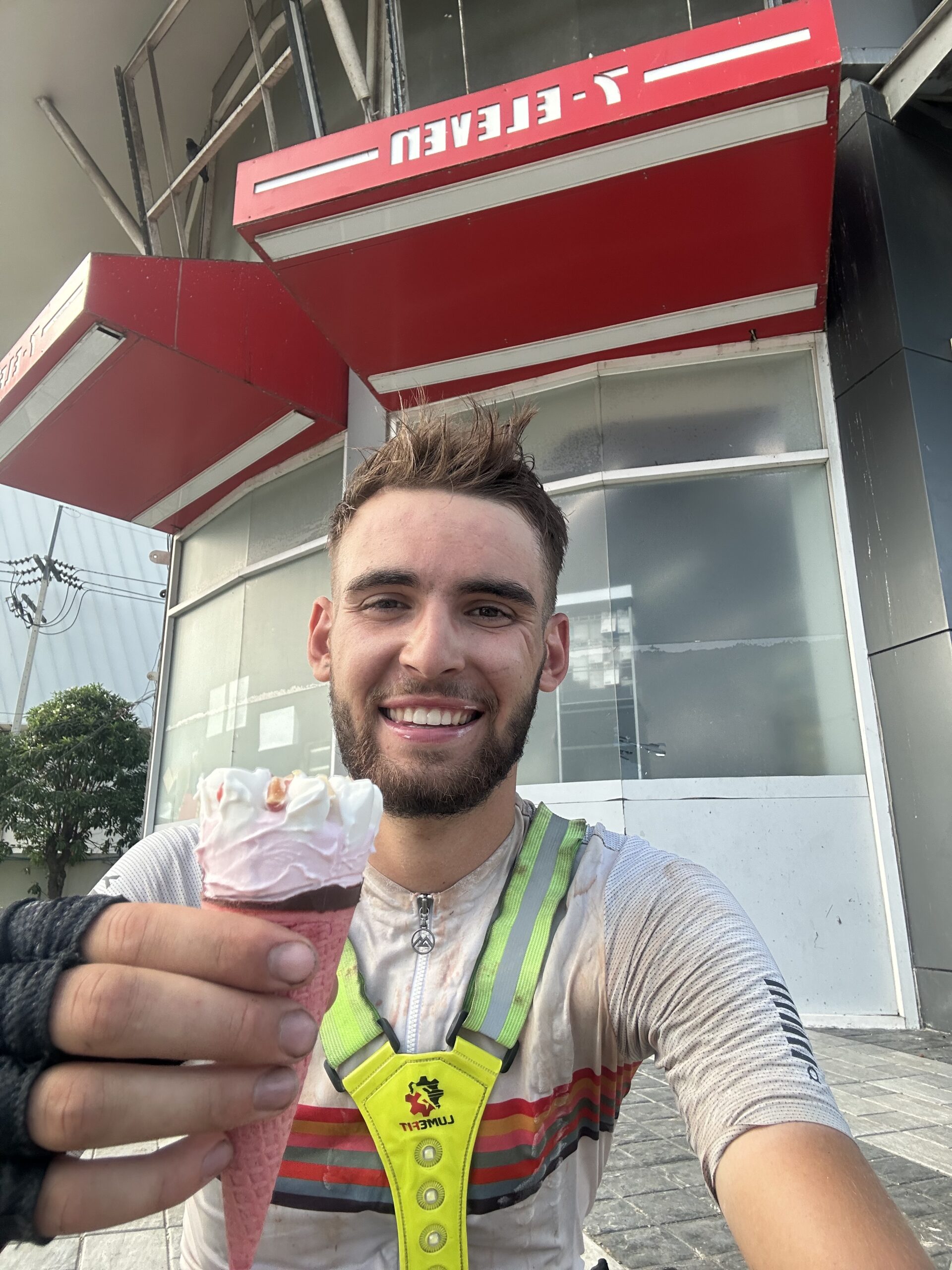 Mittags hielt ich an einem kleinen Straßenrestaurant direkt am Highway, um zu essen. Die Umgebung war wenig spannend – viele kleine Ortschaften, Lastwagen, Verkehr und Hitze. Heute war es extrem warm, und ich musste regelmäßig bei 7-Eleven Supermärkten Wasser nachkaufen, da ich unglaublich viel schwitzte.