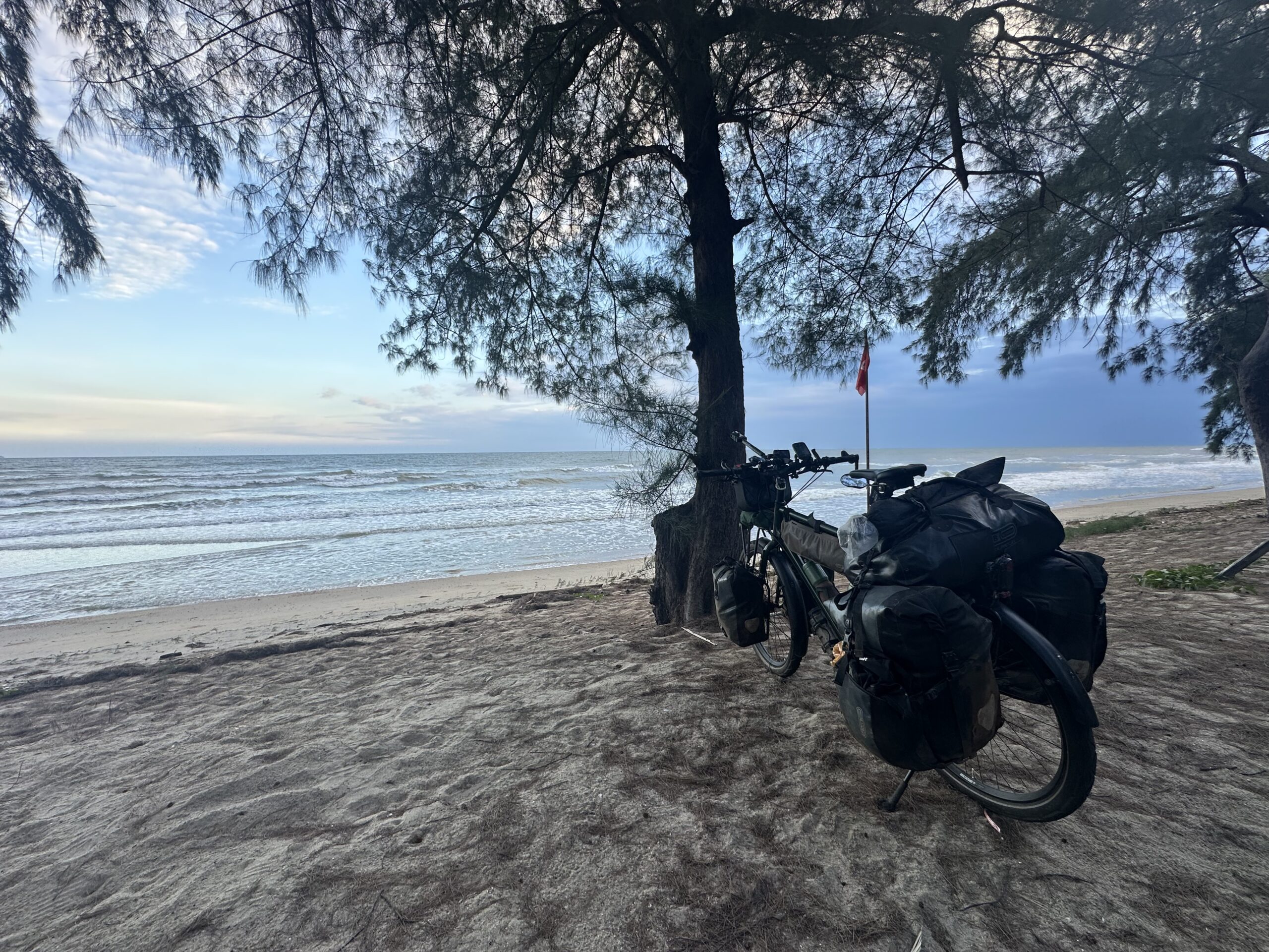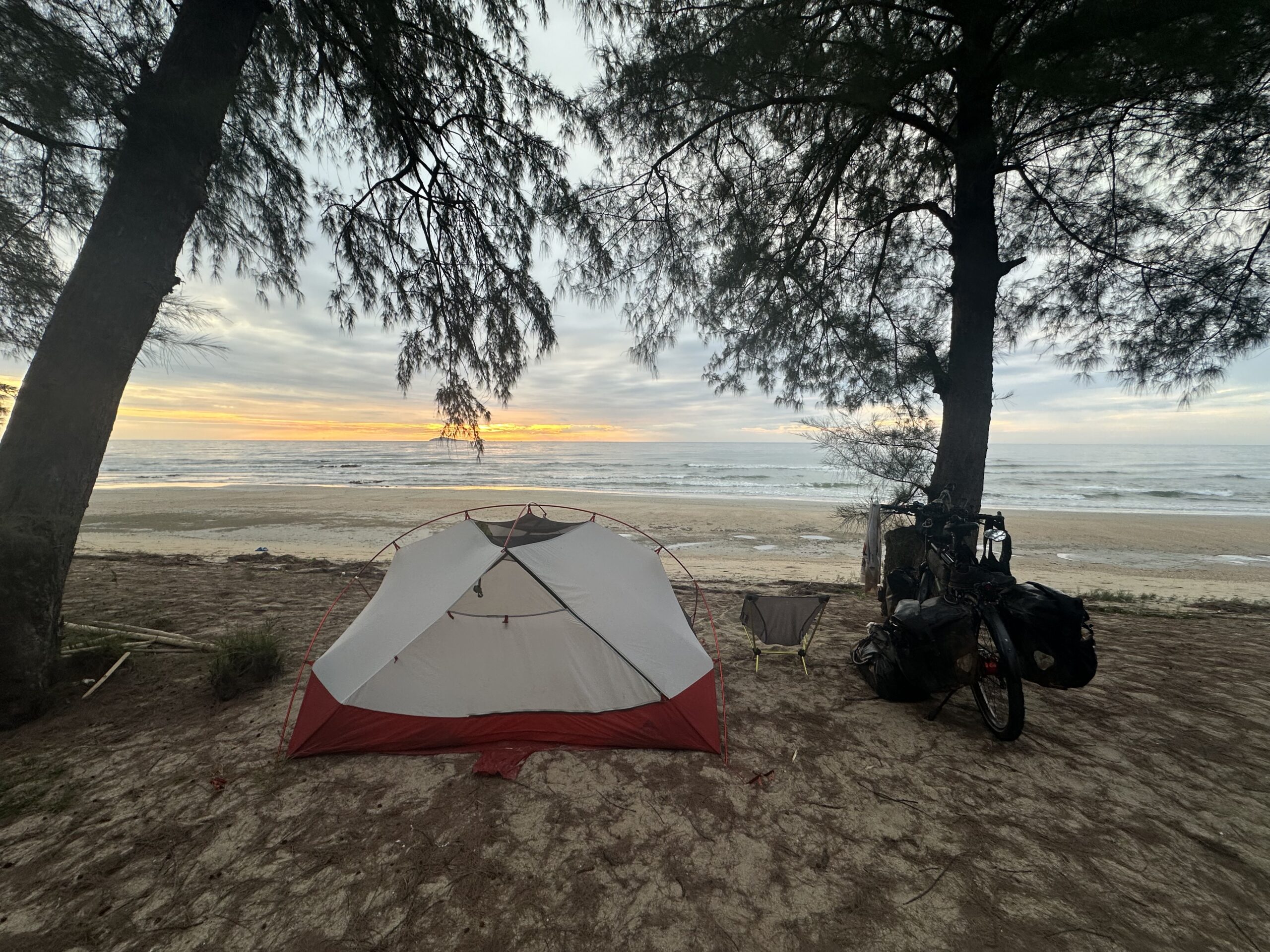 Gestärkt fuhr ich weiter in den Nationalpark (Eintritt 100 Baht) und kam schließlich am traumhaften Strand an. Ich baute mein Zelt auf, zog meine Badehose an und sprang sofort in die Wellen. Das Wasser war angenehm und die Atmosphäre einfach magisch – dieser Schlafplatz war einer meiner schönsten seit Langem.