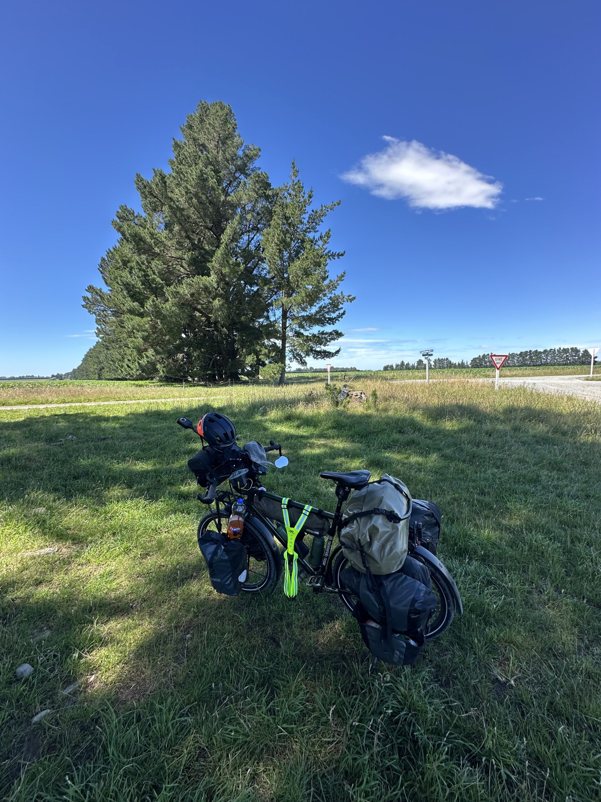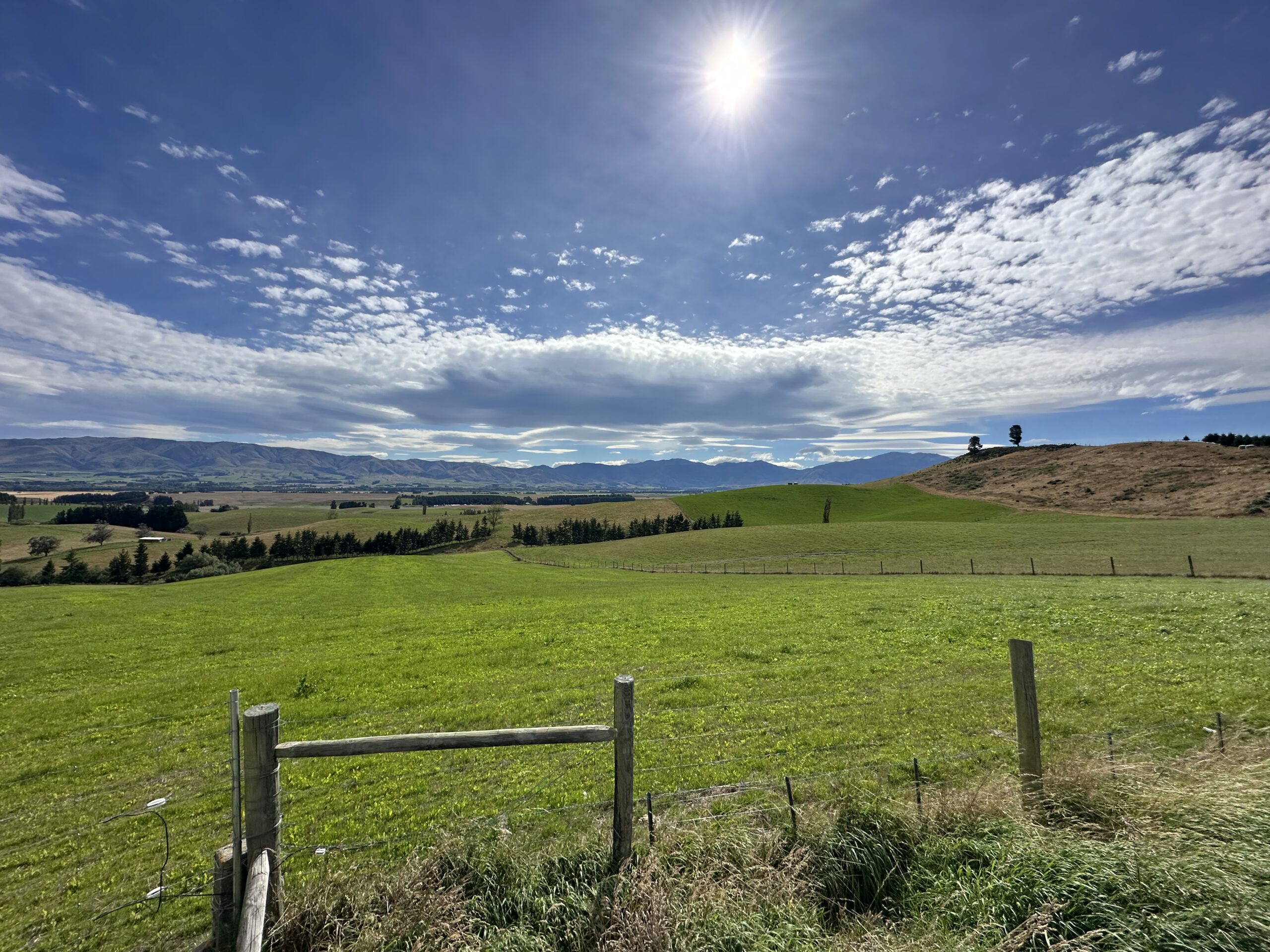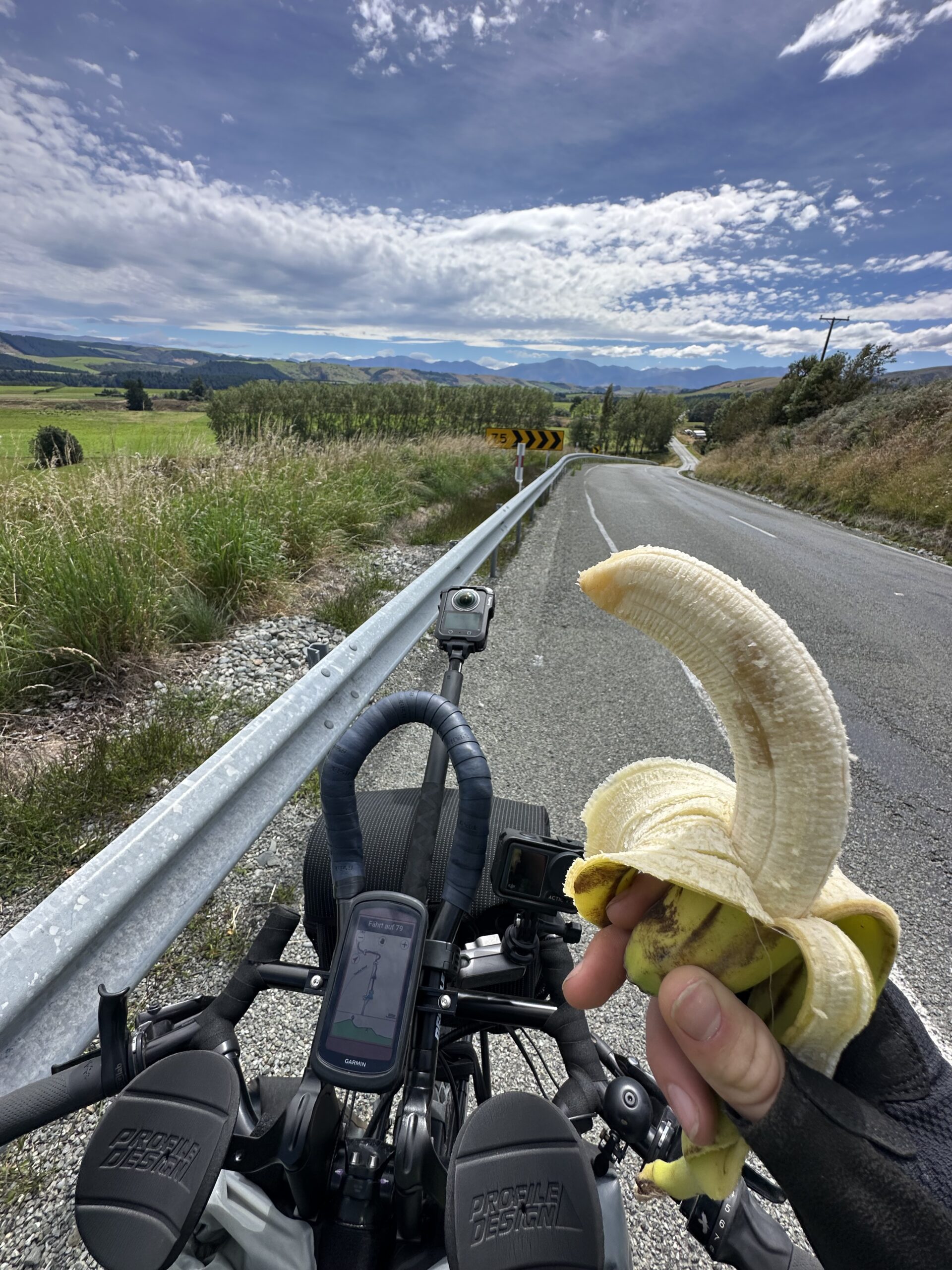 Heute Morgen stand ich ganz gemütlich auf, frühstückte Brot mit Erdnussbutter und packte anschließend mein Zelt zusammen. Danach ging es für mich weiter in zunehmend hügeligere Landschaften. Links und rechts der Straße begleiteten mich über viele Kilometer hinweg Schafe auf weitläufigen Koppeln, wie aus einem neuseeländischen Bilderbuch.