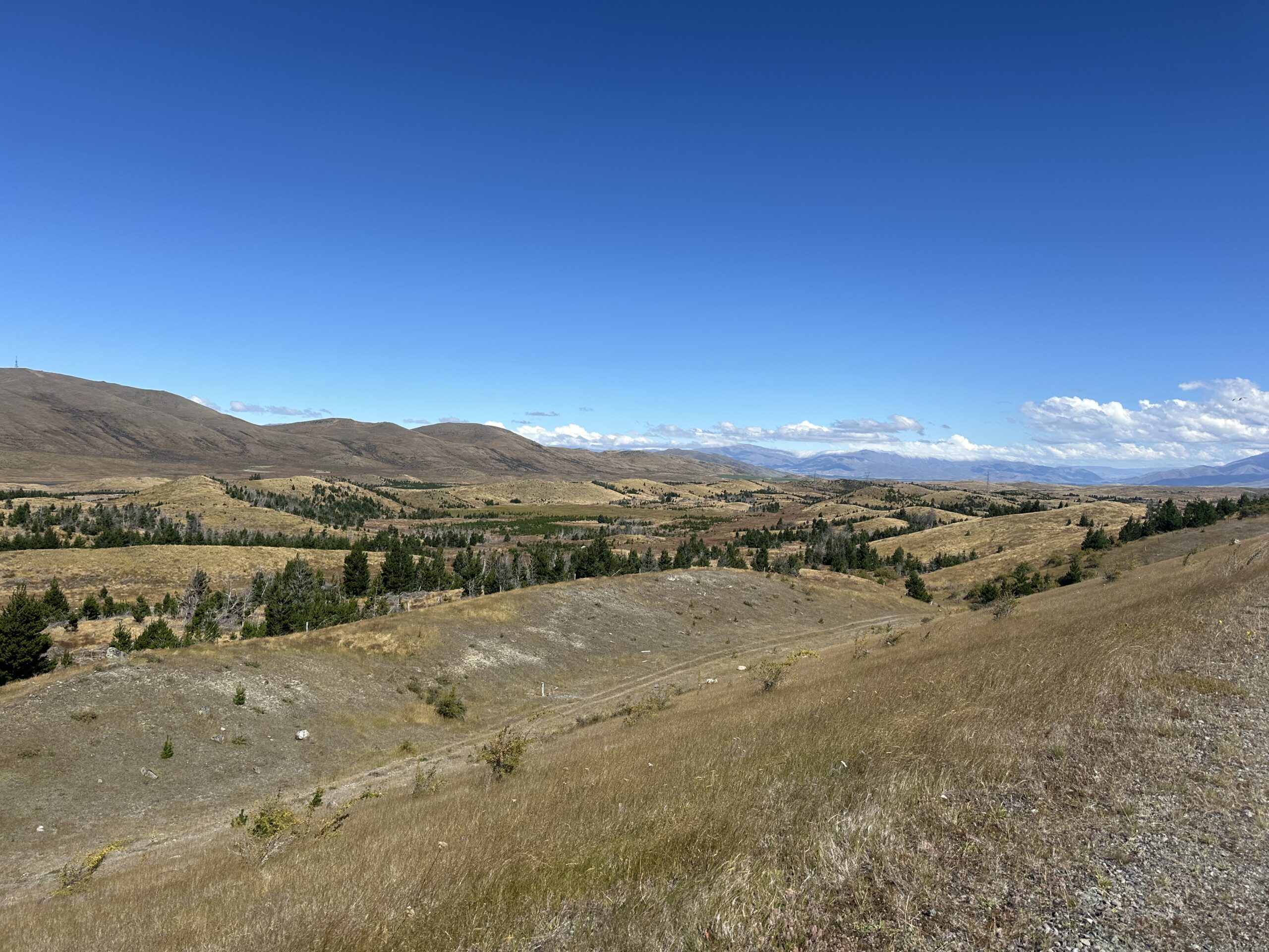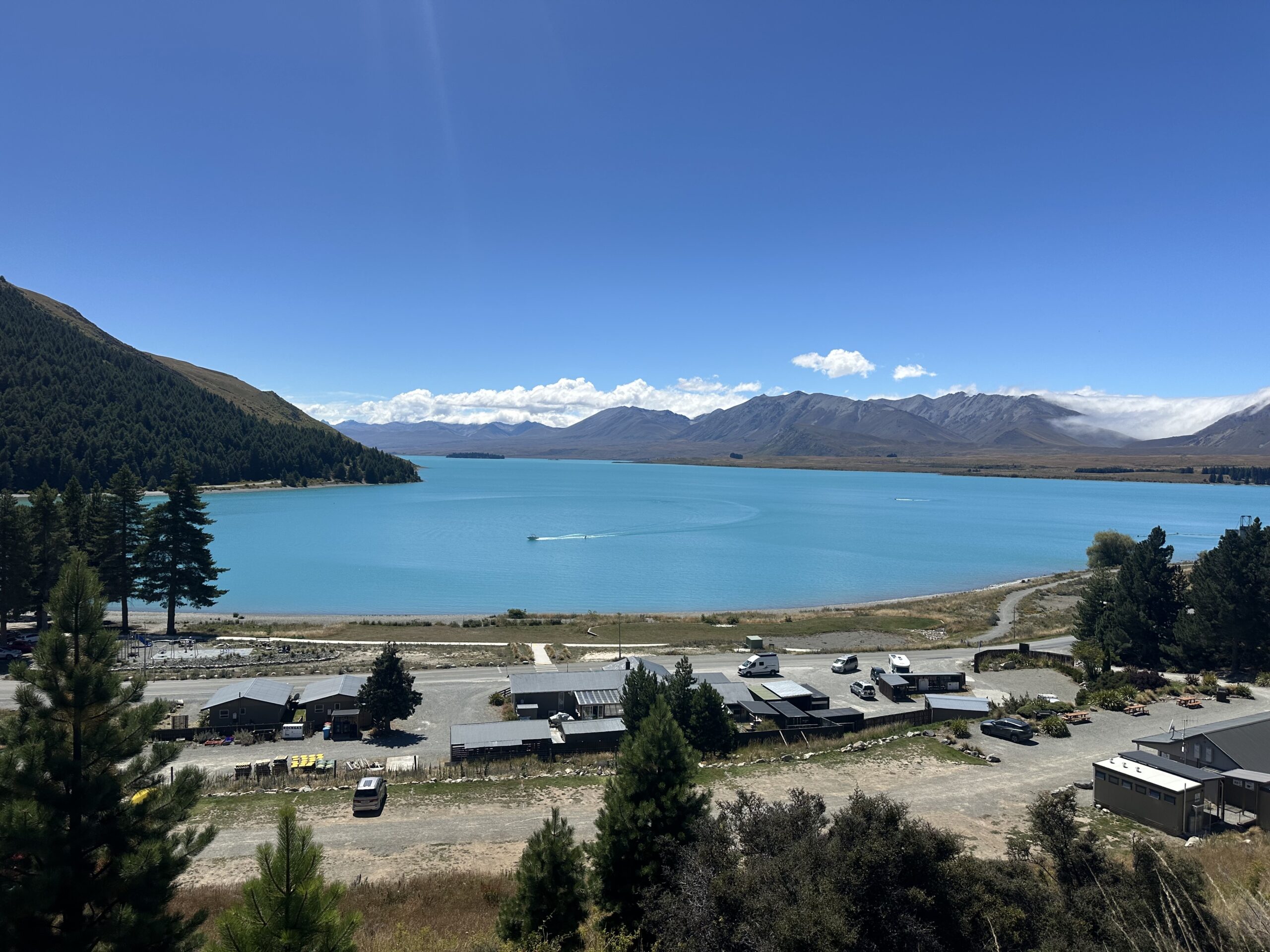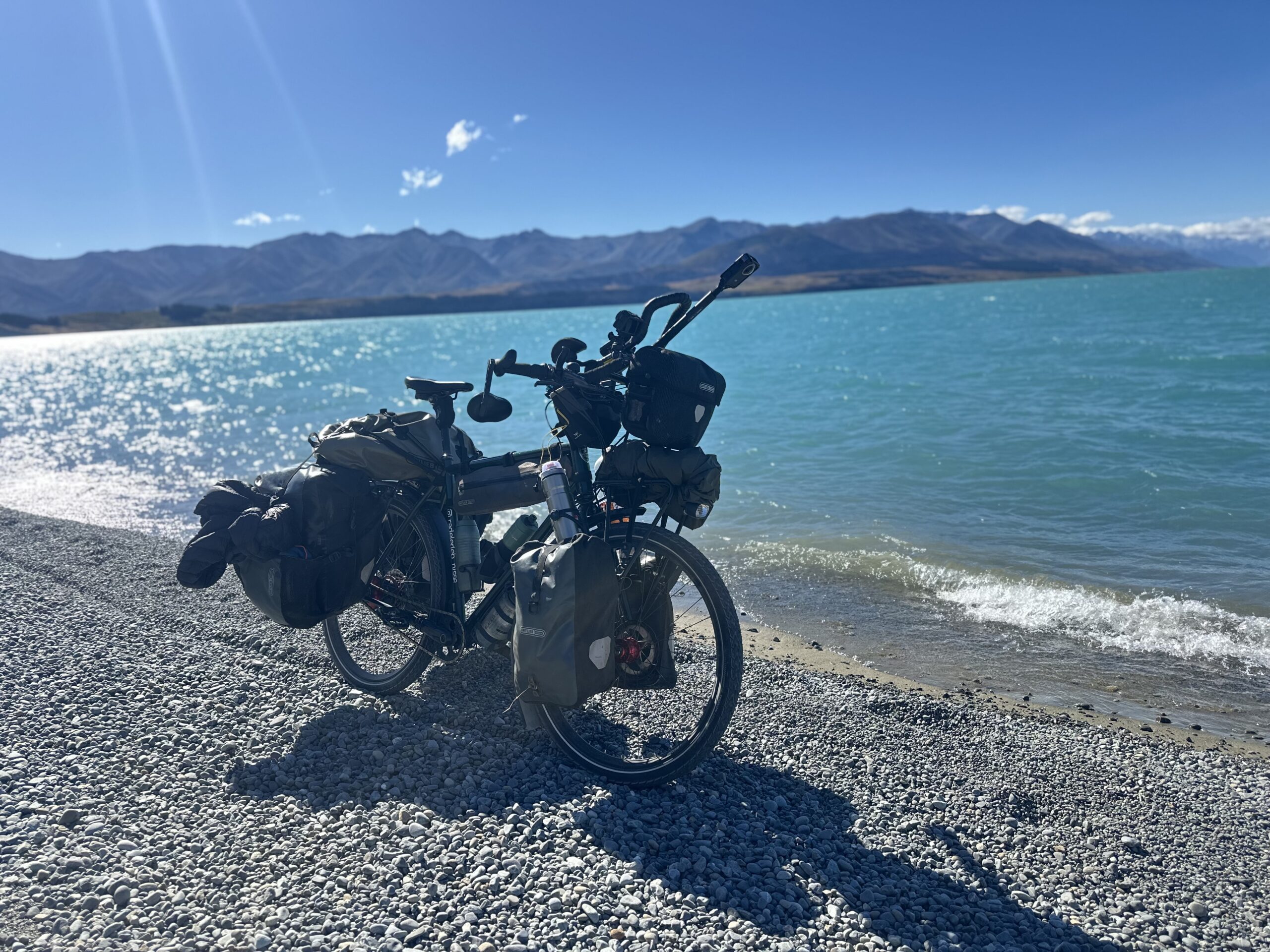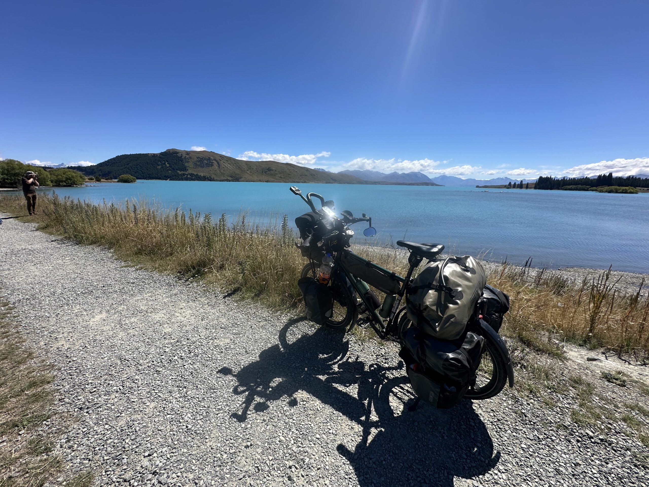 Nach einiger Zeit erreichte ich den Lake Tekapo. Der See faszinierte mich sofort mit seiner intensiv strahlend blauen Farbe. Ich legte dort eine Pause ein, auch weil sich mein Knie bemerkbar machte. Mein Körper signalisierte mir deutlich, dass er sich erst wieder an die Belastung des Radreisens gewöhnen muss. In den vergangenen zwei Monaten hatte ich mir viel Auszeit genommen und deutlich weniger trainiert, weshalb ich nun bewusst auf diese Signale hörte und meine Belastung anpasste.