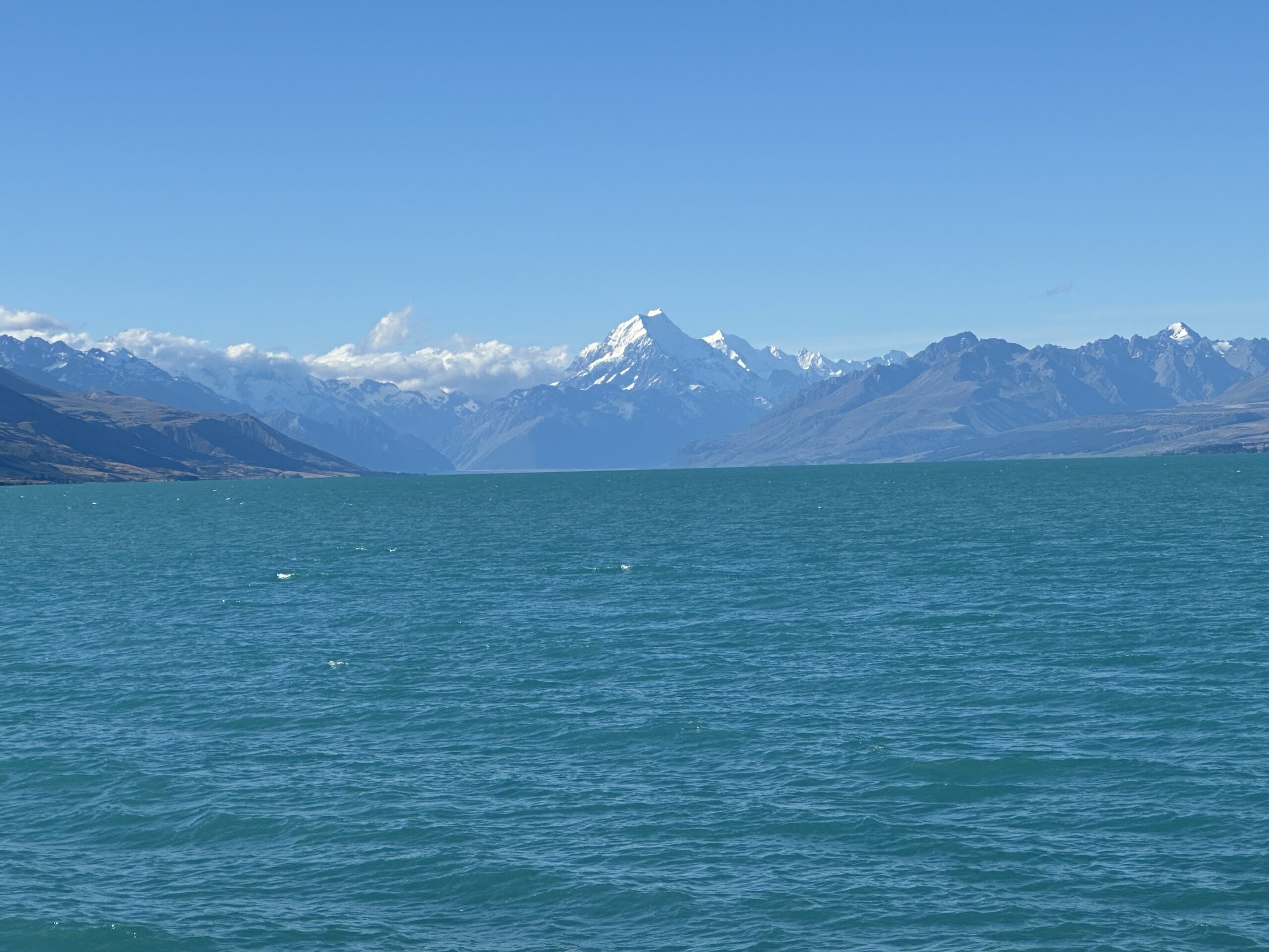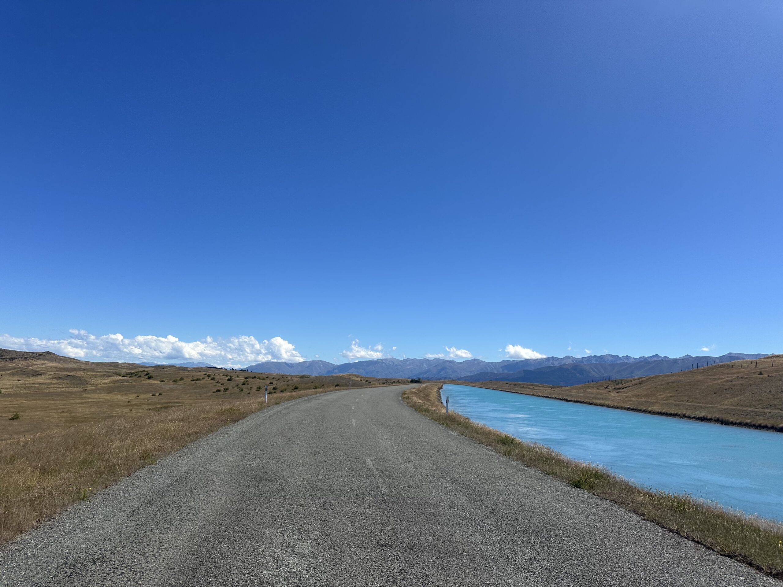 Mit mehreren kleinen Pausen setzte ich meinen Weg fort. Als ich schließlich vom Lake Tekapo in Richtung Lake Pukaki fuhr, staunte ich erneut. Die Strecke führte durch eine weitere malerische Landschaft, entlang eines leuchtend blauen Flusses und teilweise über eine kleine Offroad-Piste. Dieses Farbenspiel, kombiniert mit den mächtigen Bergen und dem Blick auf den höchsten Berg Neuseelands, den Mount Cook, ließ mich immer wieder innehalten.