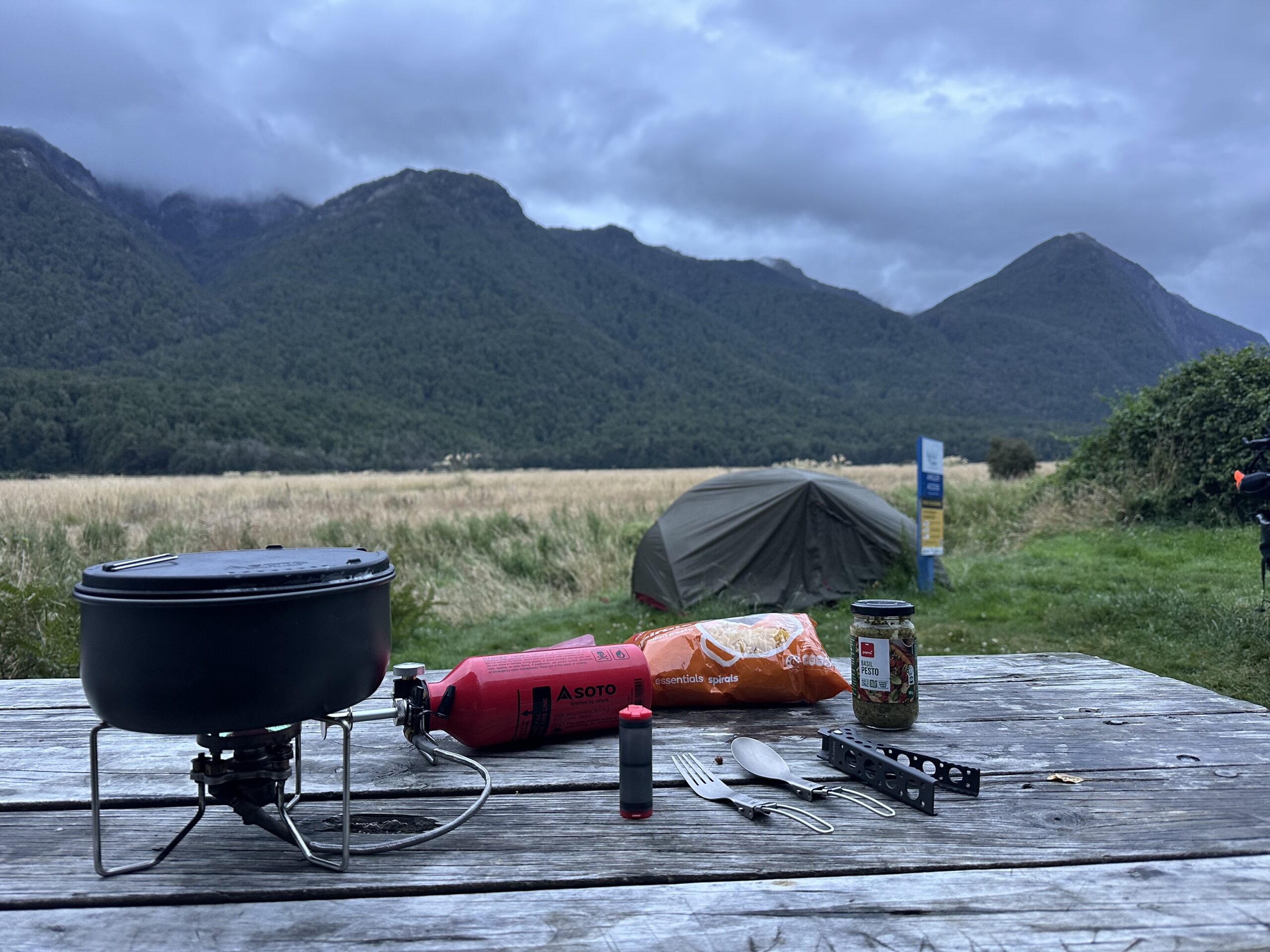 Für mich ging es anschließend weiter – stetig hinein in die Berge von Fjordland. Die Landschaft wurde rauer, dramatischer und noch eindrucksvoller. Gegen 20:30 Uhr erreichte ich den ersten Campingplatz entlang der Strecke und entschied mich, dort zu übernachten. Es handelte sich um einen einfachen Selbstbedienungsplatz: ein Toilettenhäuschen, eine ausgewiesene Fläche für Zelte und eine wunderschöne Aussicht.